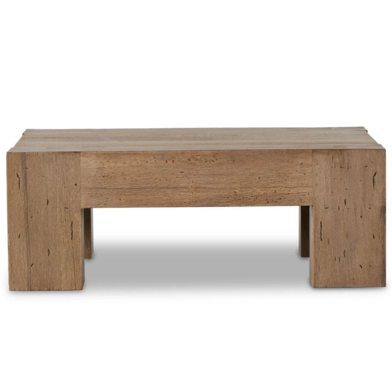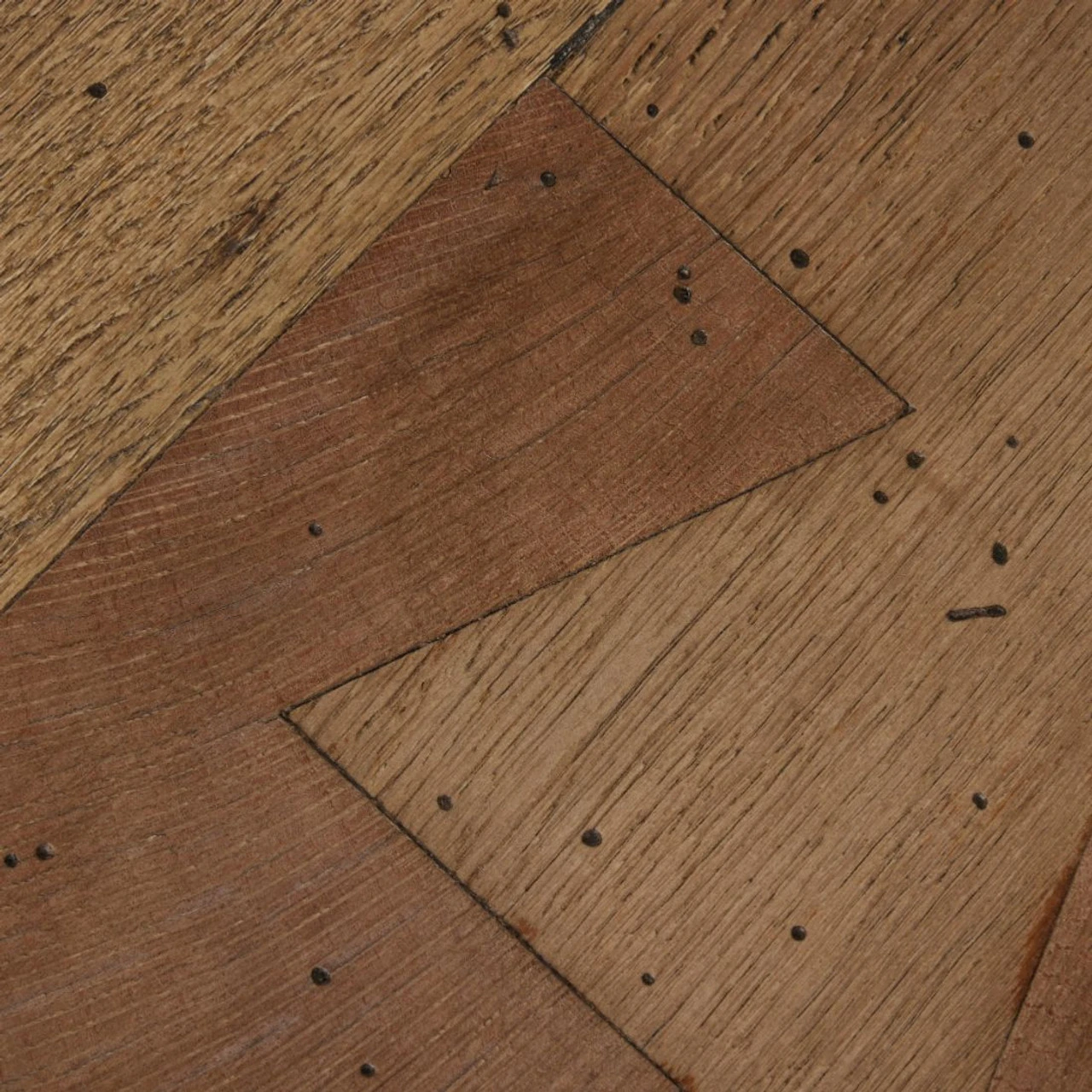 Made from thick-cut oak veneer with a faux rustic finish made to emulate wormwood, this low, square-shaped coffee table features chunky squared legs and dovetail joinery detailing. Perfectly sized for smaller spaces. Chuncky legs add a hint of modernity.