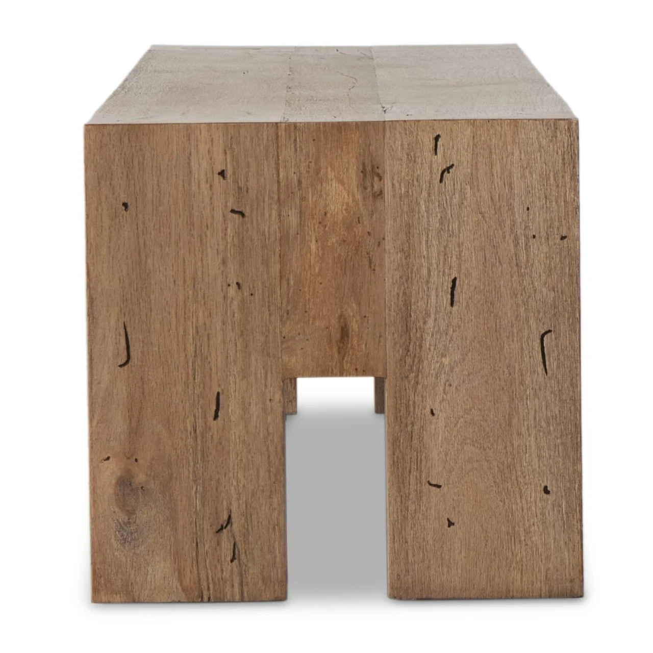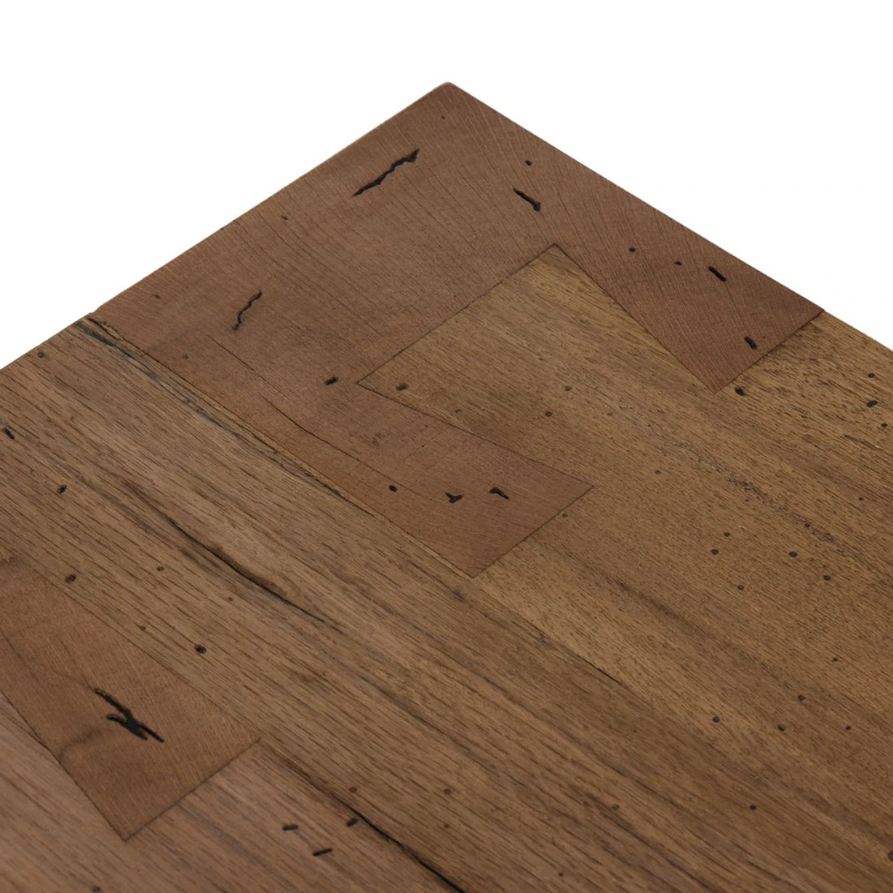 Made from thick-cut oak veneer with a faux rustic finish made to emulate wormwood, with clean Parsons lines, chunky squared legs and dovetail joinery detailing.