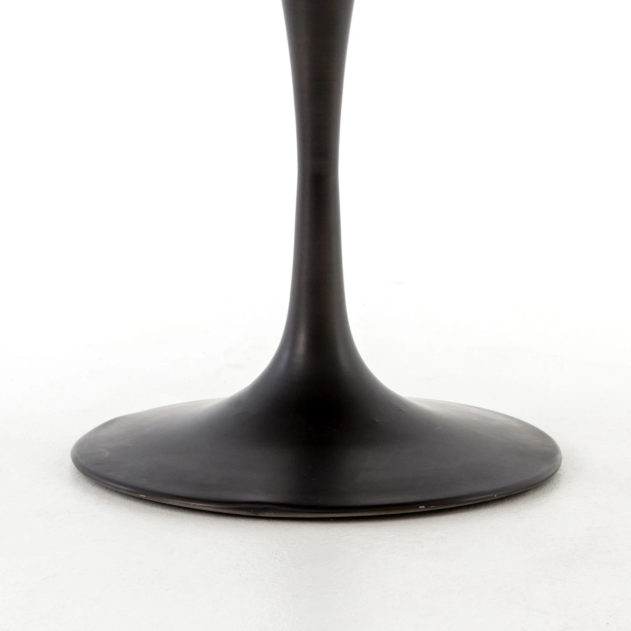 Modern lines of mid-century furnishings and mixed materials make our Aero Round Pedestal Table. Mixed materials make the table. Classic tulip shaping is recast with a deep black cast-iron base and a patchwork brass-clad top banded in distressed oak. Bistro sizing perfect for a cozy breakfast nook. Our distressed brass top round table is perfect for modern industrial inspired dining room decors. Given its handmade and hand-finished nature, variations and imperfections in the finish are to be expected and celebrated.