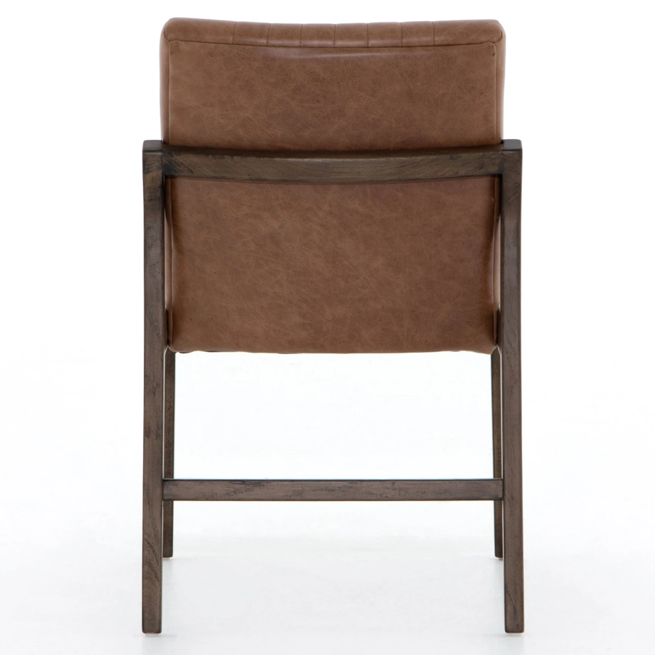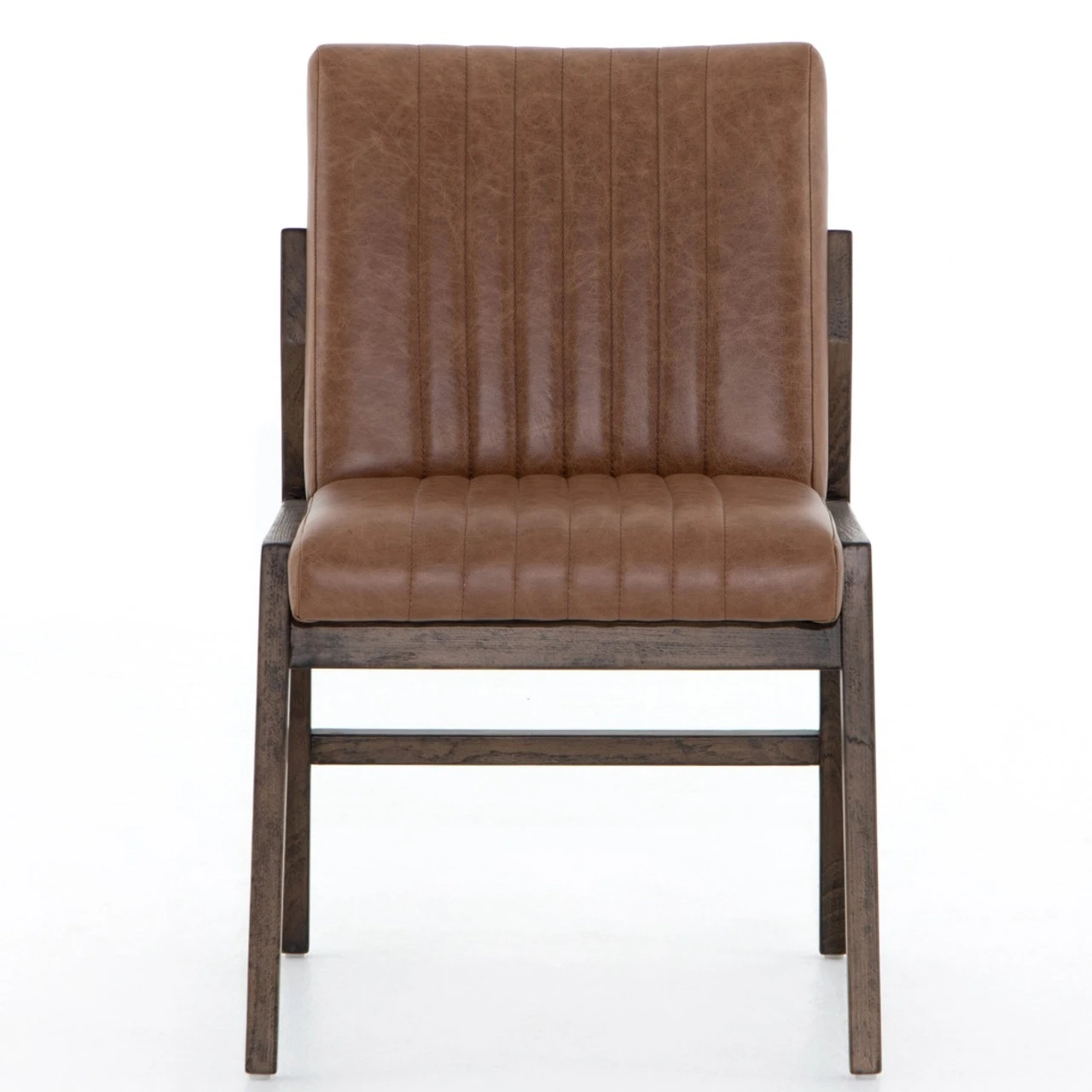 Vertical channeling and chestnut color top-grain leather exclusive to Zin Home grant this ’50s-inspired dining chair new energy. Finished in a rich brown, beech wood framing features a rear scalloped stretcher for added intrigue.