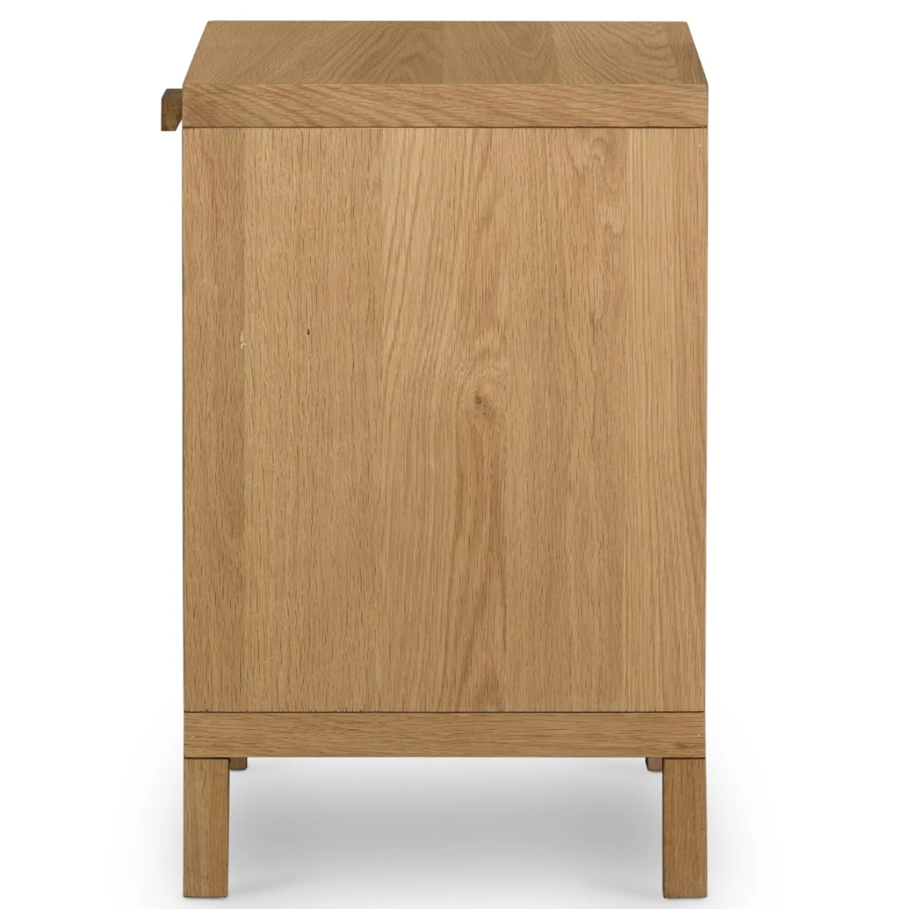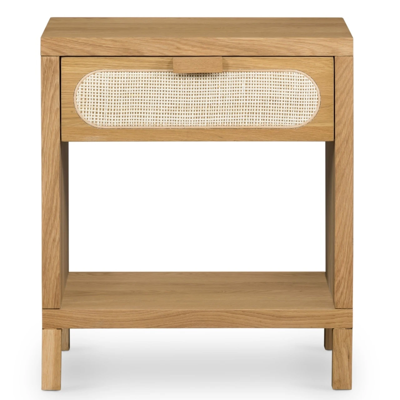 French Coastal inspired style with an organic twist. Au naturale. A nightstand of honey-finished oak features a single drawer with a pill-shaped cane front, for a soft, neutral look with lasting modernity. Our Allegra Woven Cane 8 Drawers Oak Wood Dresser will be an elegant bedside companion.