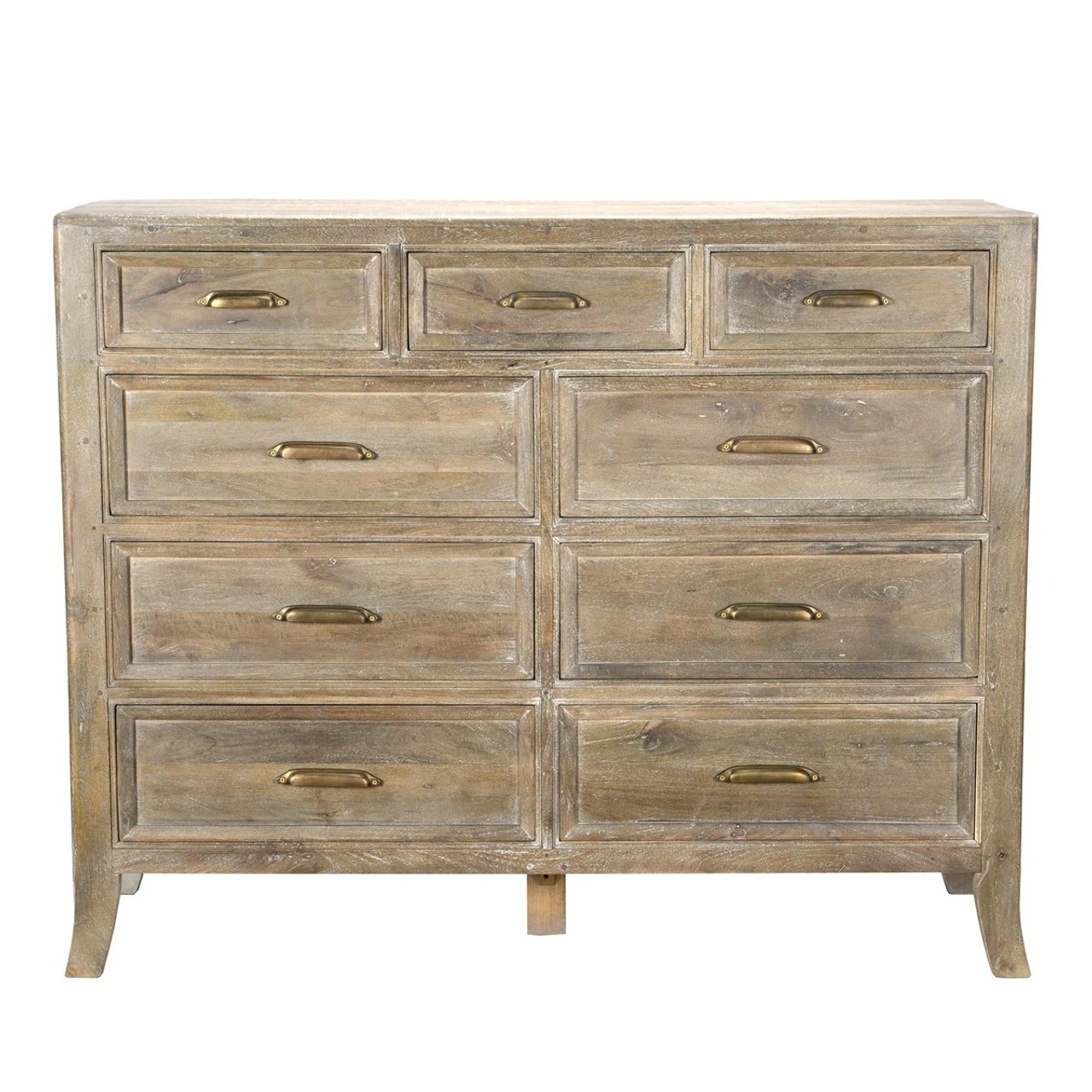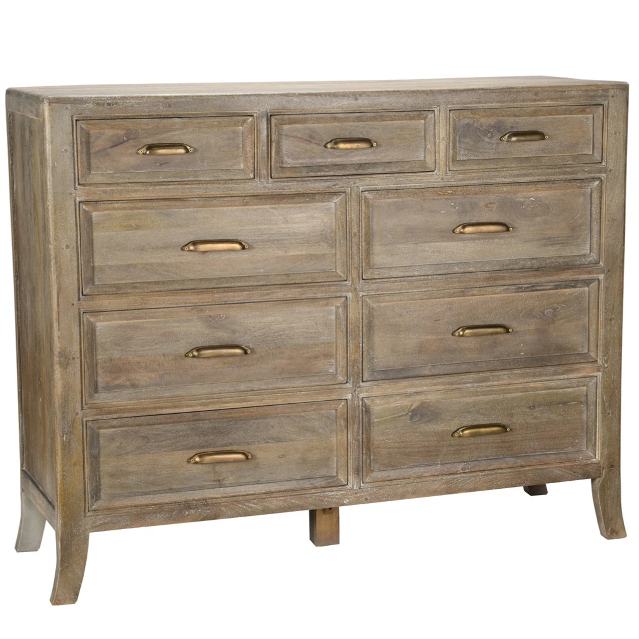 Amelie Solid Wood 9 Drawer Double Dresser is multi-functional design at its finest. Meticulously handcrafted of solid mango wood in a beautiful hand-distressed finish, Amelie boasts nine generous drawers for bountiful bedroom storage. Featuring a rustic design, antiqued brass drawer pulls and curved legs, this rustic solid mango wood bedroom dresser adds country-chic style to any home.