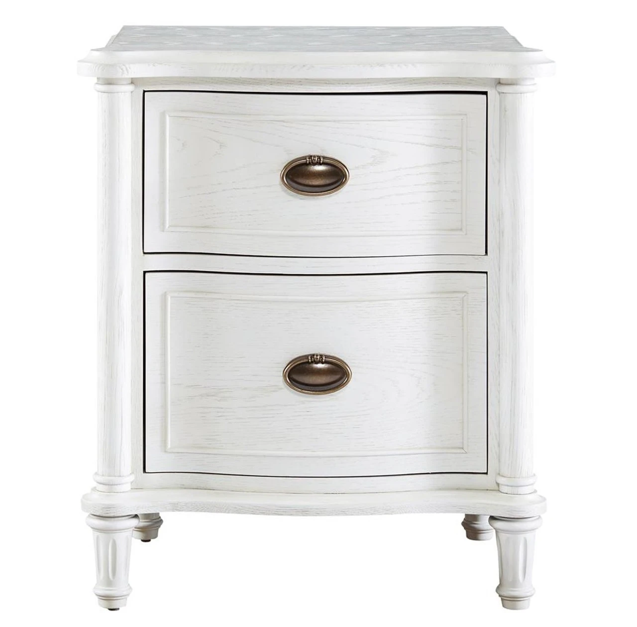 Inspired by 18th century french home furnishings. Our Amity French Oak 2 Drawer Nightstand feature distinctive hardware that perfectly compliments beautifully shaped bow front drawers. Each oak nightstand with drawers is hand-crafted of solid oak and oak veneers with a natural weathered oak Cotton finish. English dovetail drawer construction feature cedar drawer bottoms and self-closing guides. This classic French Oak Wood nightstand will add a rustic-chic touch to your master bedroom design. Rich, modern, iron colored drawer handles and pulls contrast with smooth grains and washed finishes for the perfect combination of rustic and contemporary.