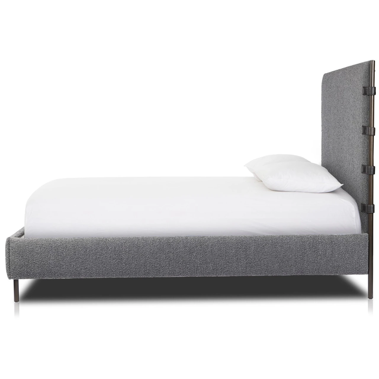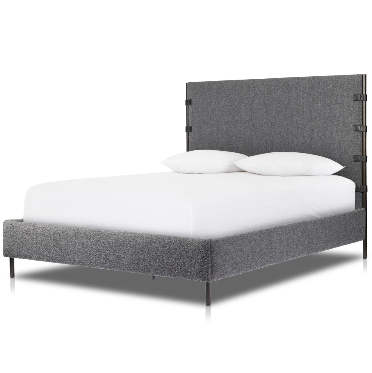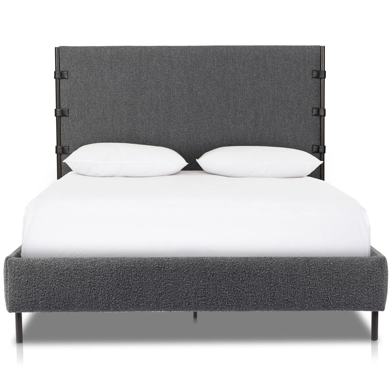 Bring texture into play. Upholstered in a grey boucle, with decorative leather straps adding a material-driven touch. Standard box spring required. Performance fabrics are specially created to withstand spills, stains, high traffic and wear, ensuring long-term comfort and unmatched durability.