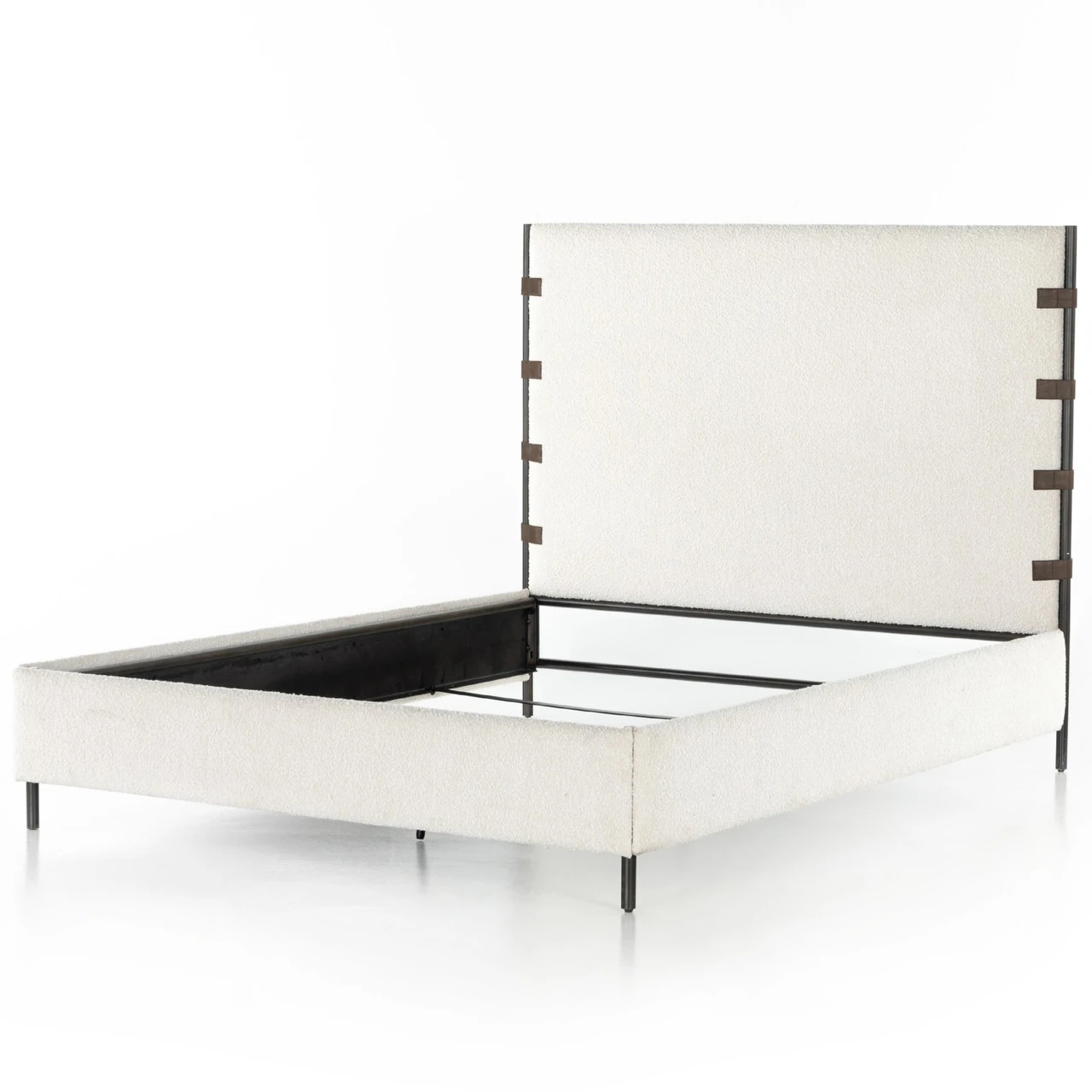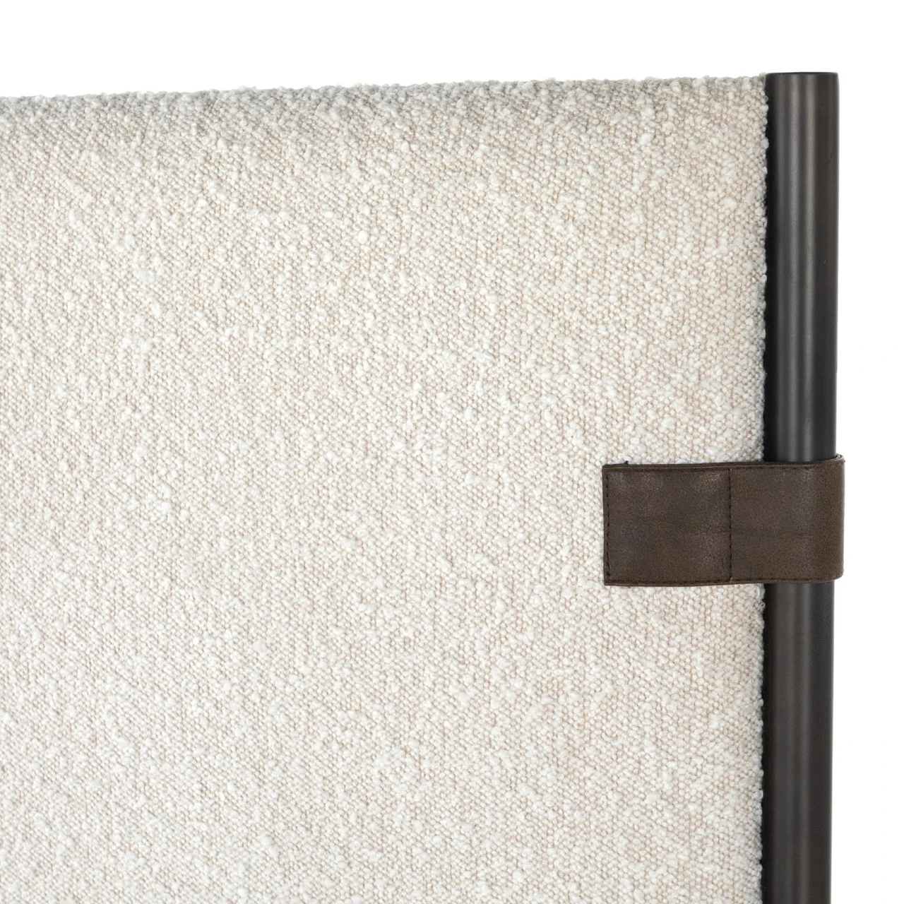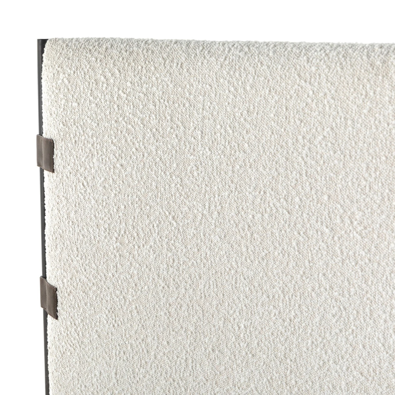 Bring texture into play. Upholstered in a classic cream-colored boucle, with decorative leather sling straps adding a material-driven touch with contrast. Standard box spring required. Performance fabrics are specially created to withstand spills, stains, high traffic and wear, ensuring long-term comfort and unmatched durability.