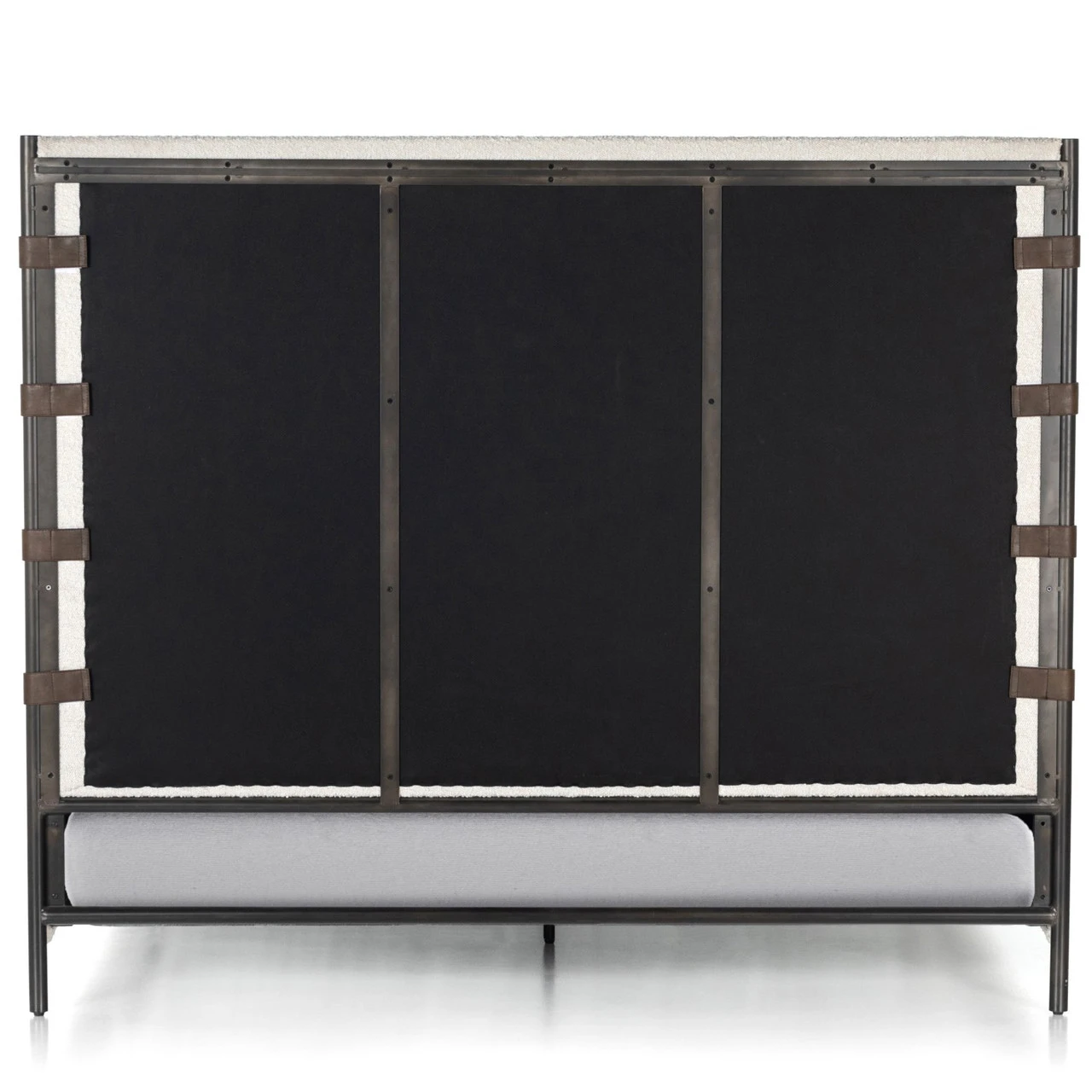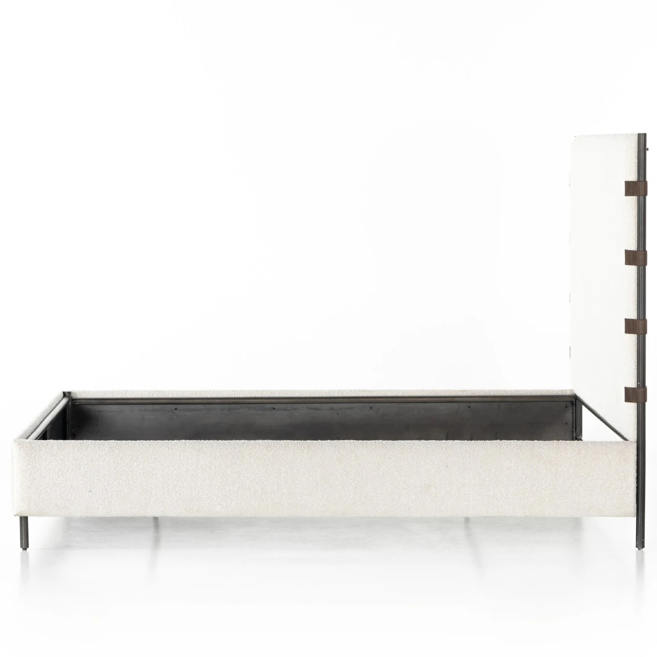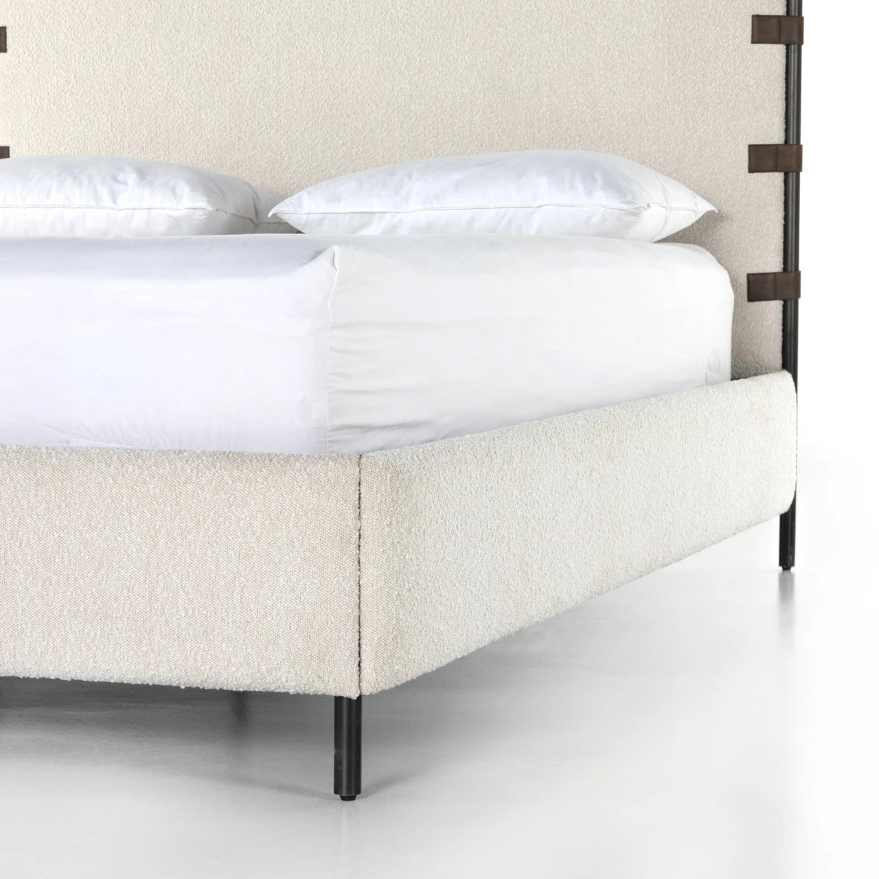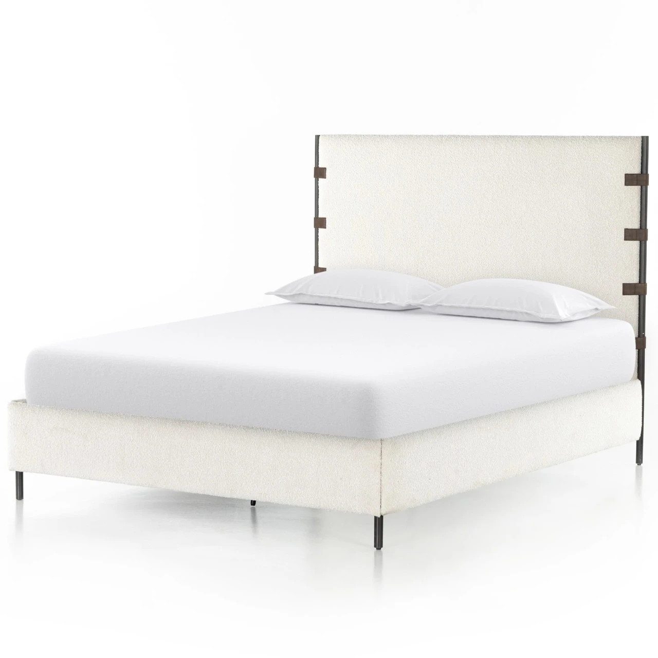 Bring texture into play. Upholstered in a classic cream-colored boucle, with decorative leather sling straps adding a material-driven touch with contrast. Standard box spring required. Performance fabrics are specially created to withstand spills, stains, high traffic and wear, ensuring long-term comfort and unmatched durability.