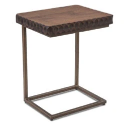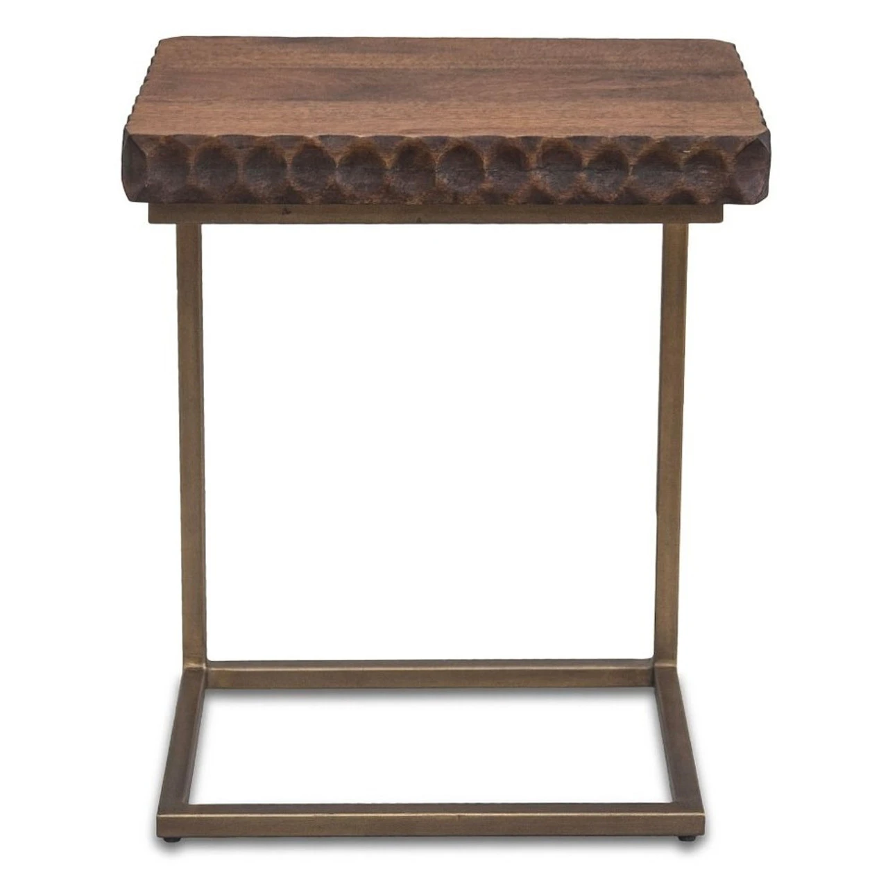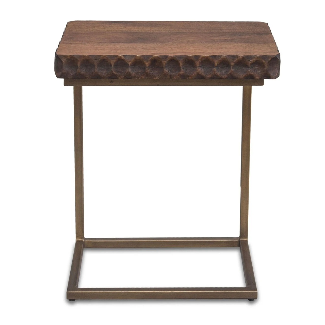 Made from richly-grained solid mango wood and lofted on four muted gold color metal legs, our Anna Modern Solid Wood Two-Toned Side Table combines form, function and versatility. Edges of the table top are hand-carved with circular pattern and finished in a dark brown color creating a unique two tone effect and adding depth to this artisan dining room table. The catalyzed water-based finish on the wood creates an amazing luminosity that evokes beauty from every angle while also being durable for daily use.