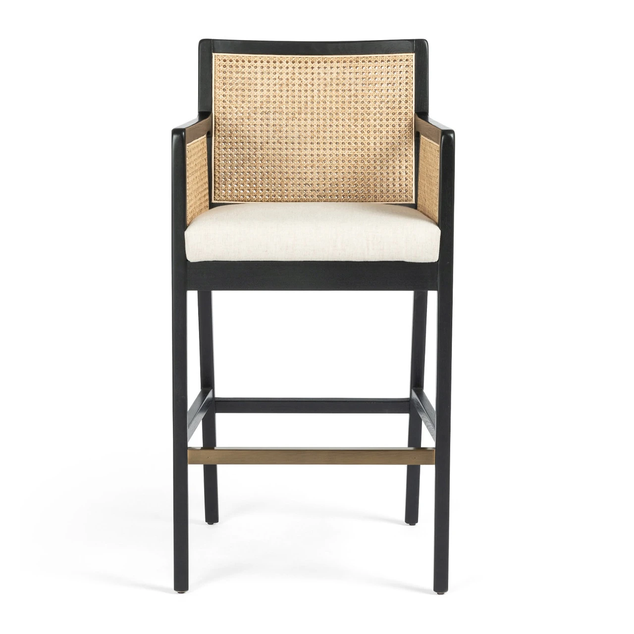 Mixed materials refresh retro dining style. Brushed ebony nettle wood frames a textural inlay of natural cane, for perfect contrast. Neutral linen-blend seating of high-performance fabric brings modern sensibility to stool-style seating.