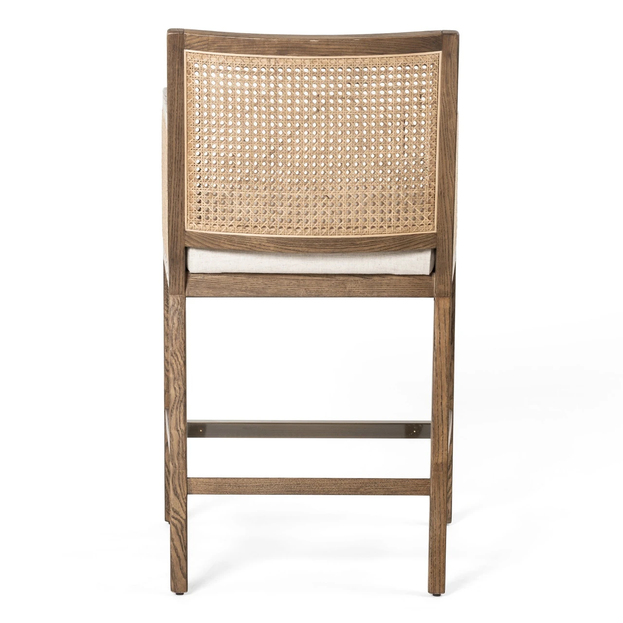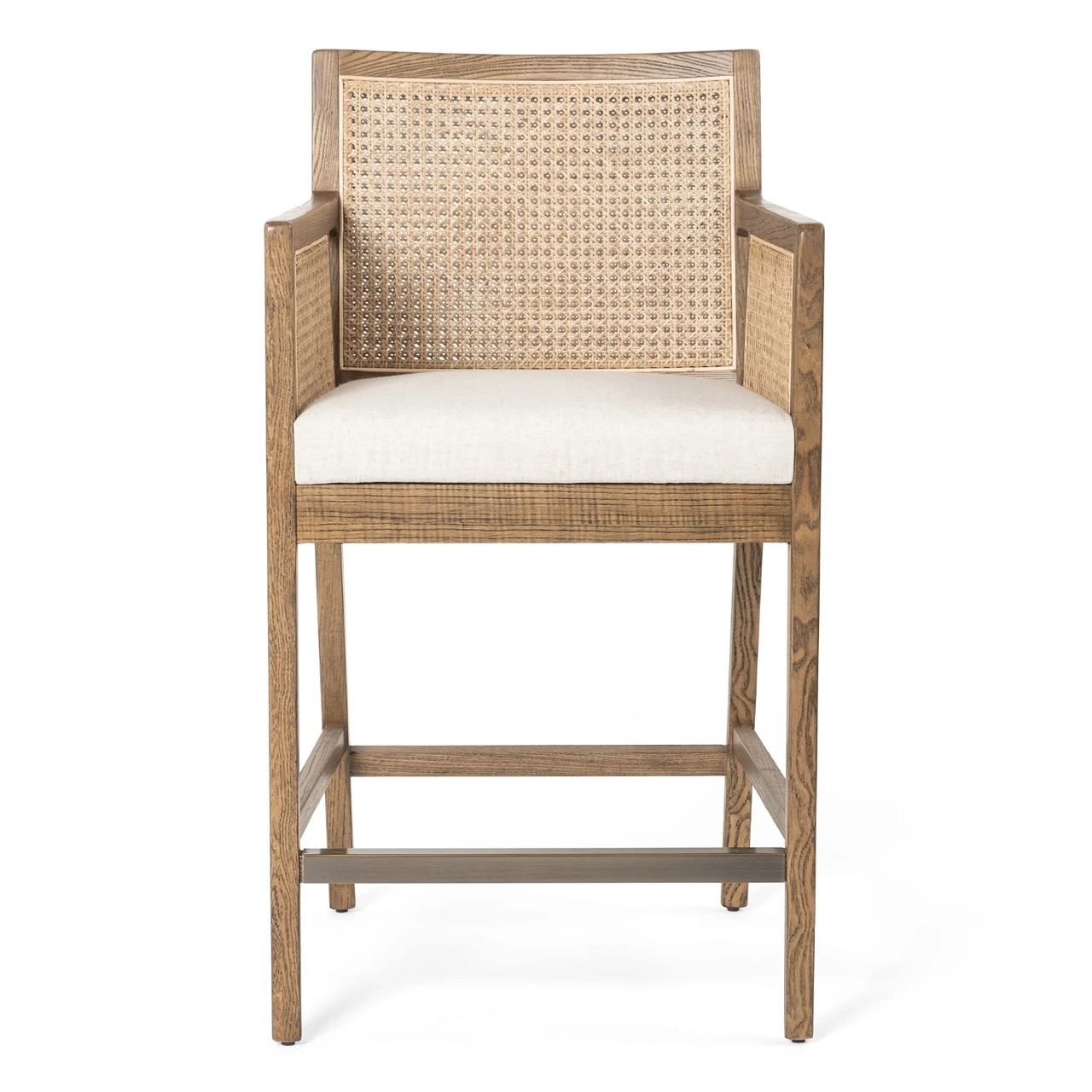Mixed materials refresh retro counter seating. Light-toasted nettlewood frames a textural inlay of natural cane for a clean, monochromatic look, with a light, linen-blend seat of high-performance fabric for modern sensibility.