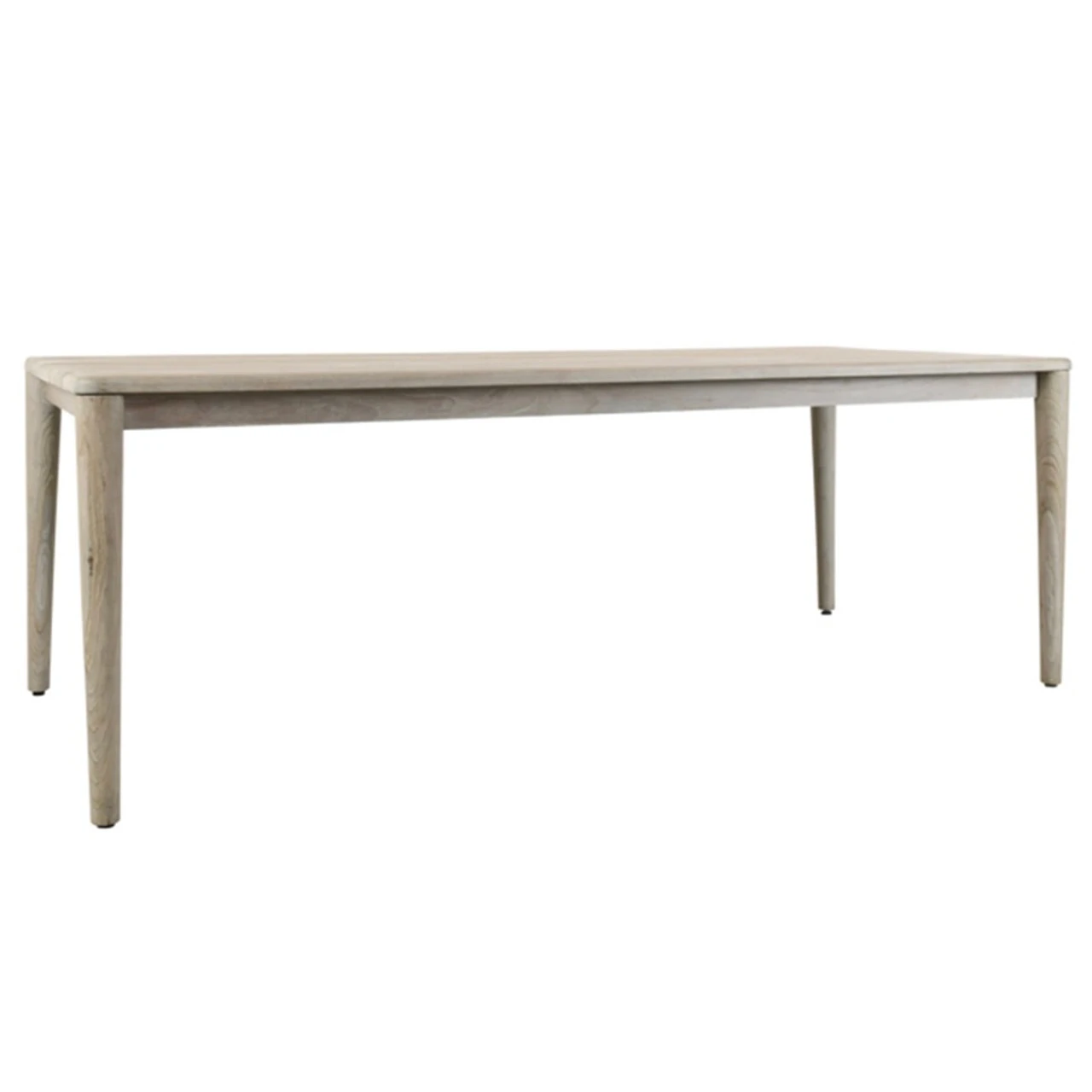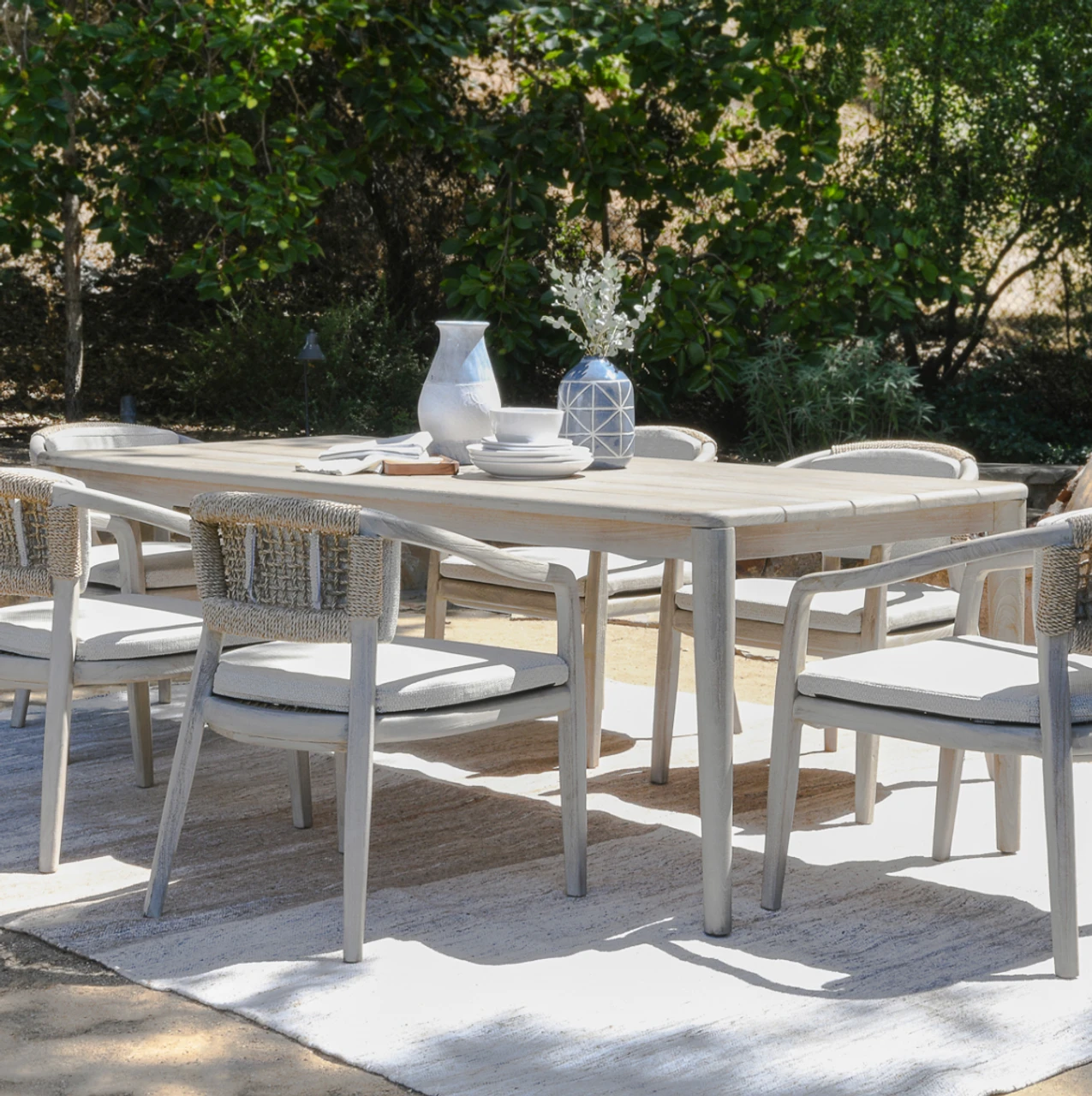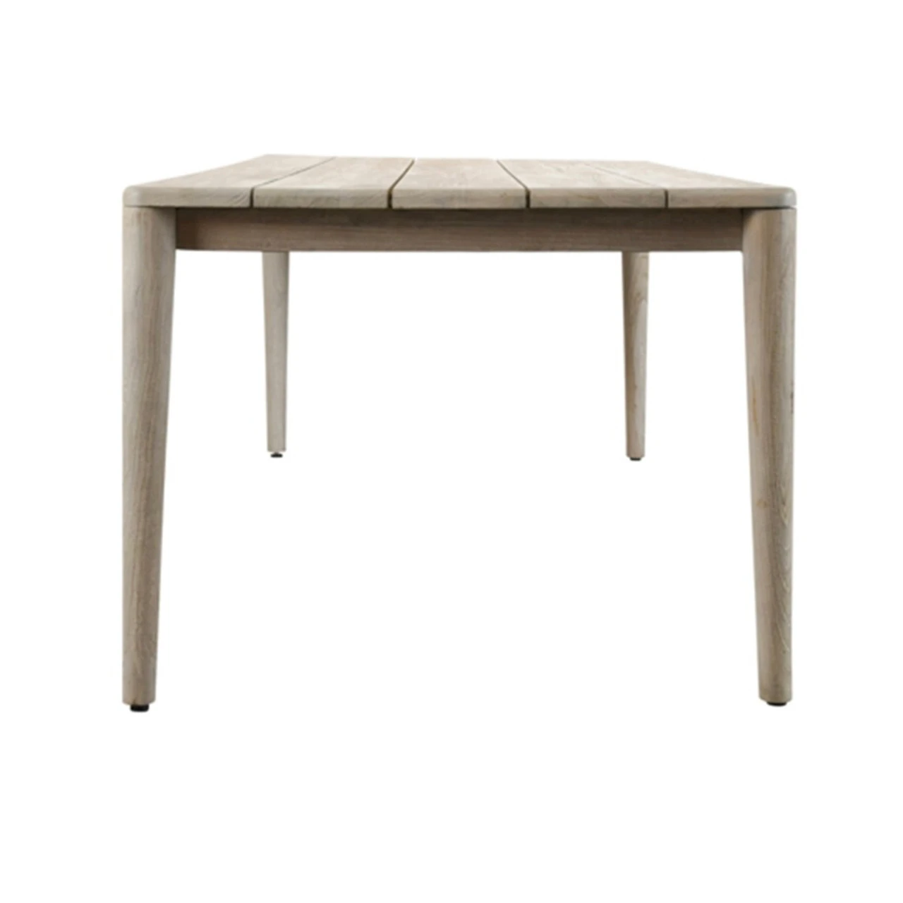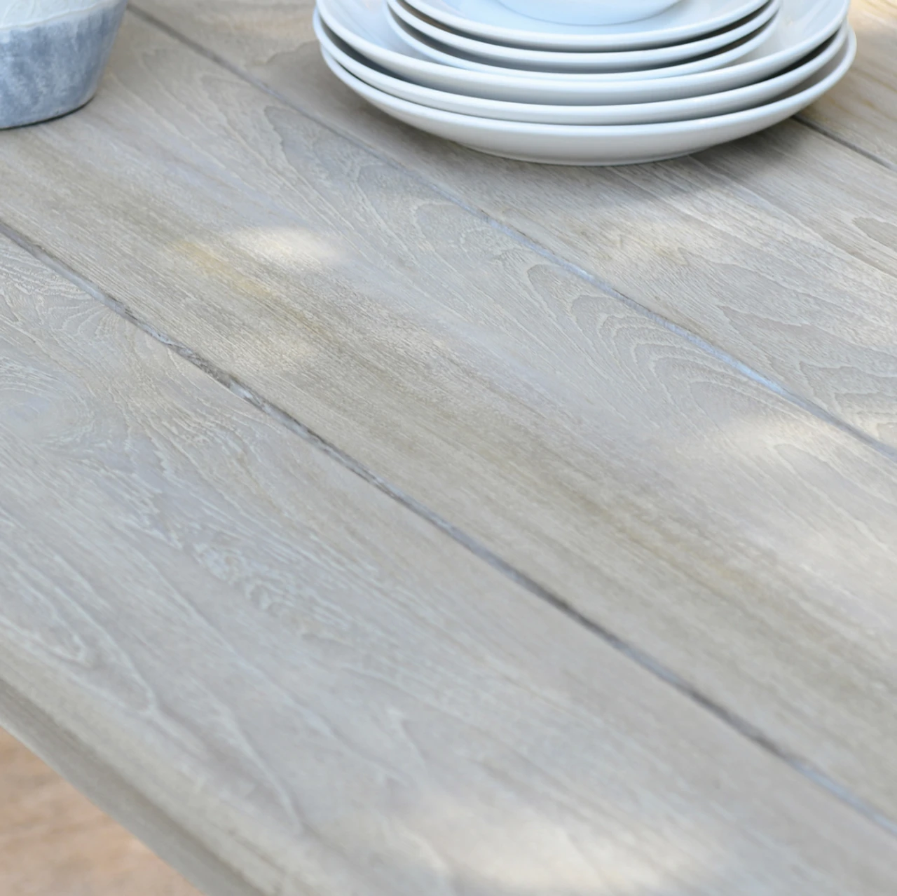 With gray teak wood in a distressed, hand finish, the Aria 86” Outdoor Dining Table is a large, simply designed table capable of seating 8. With tapered legs and built-in plastic floor protectors, sit back and enjoy this sleek design without worrying about floor scratches.