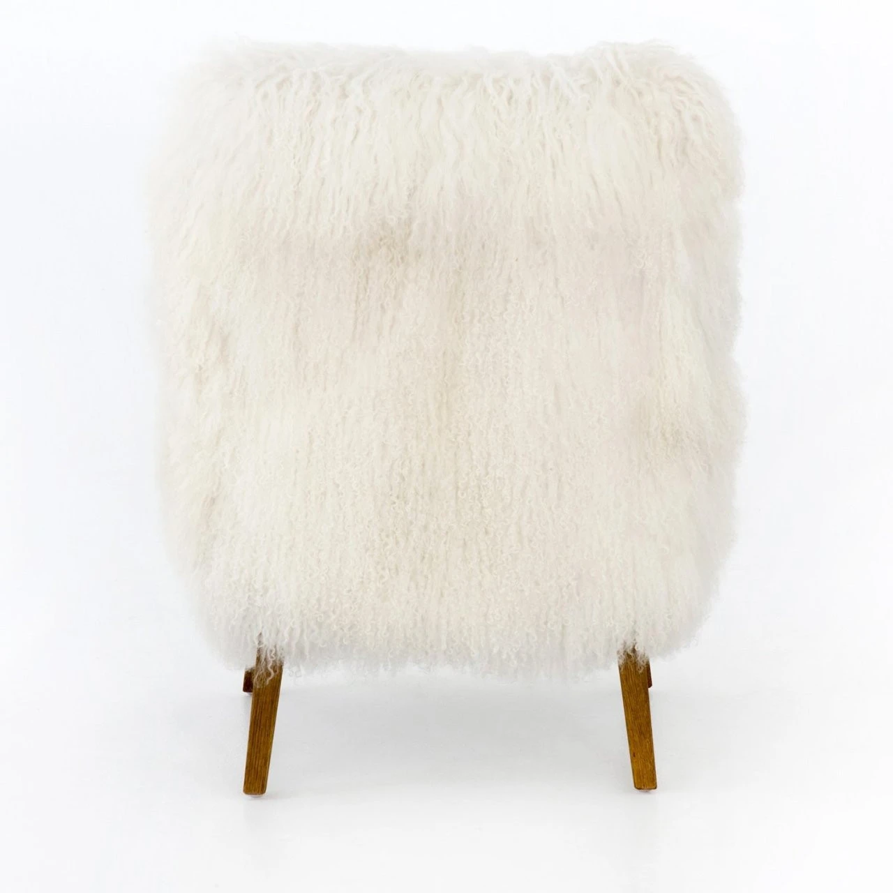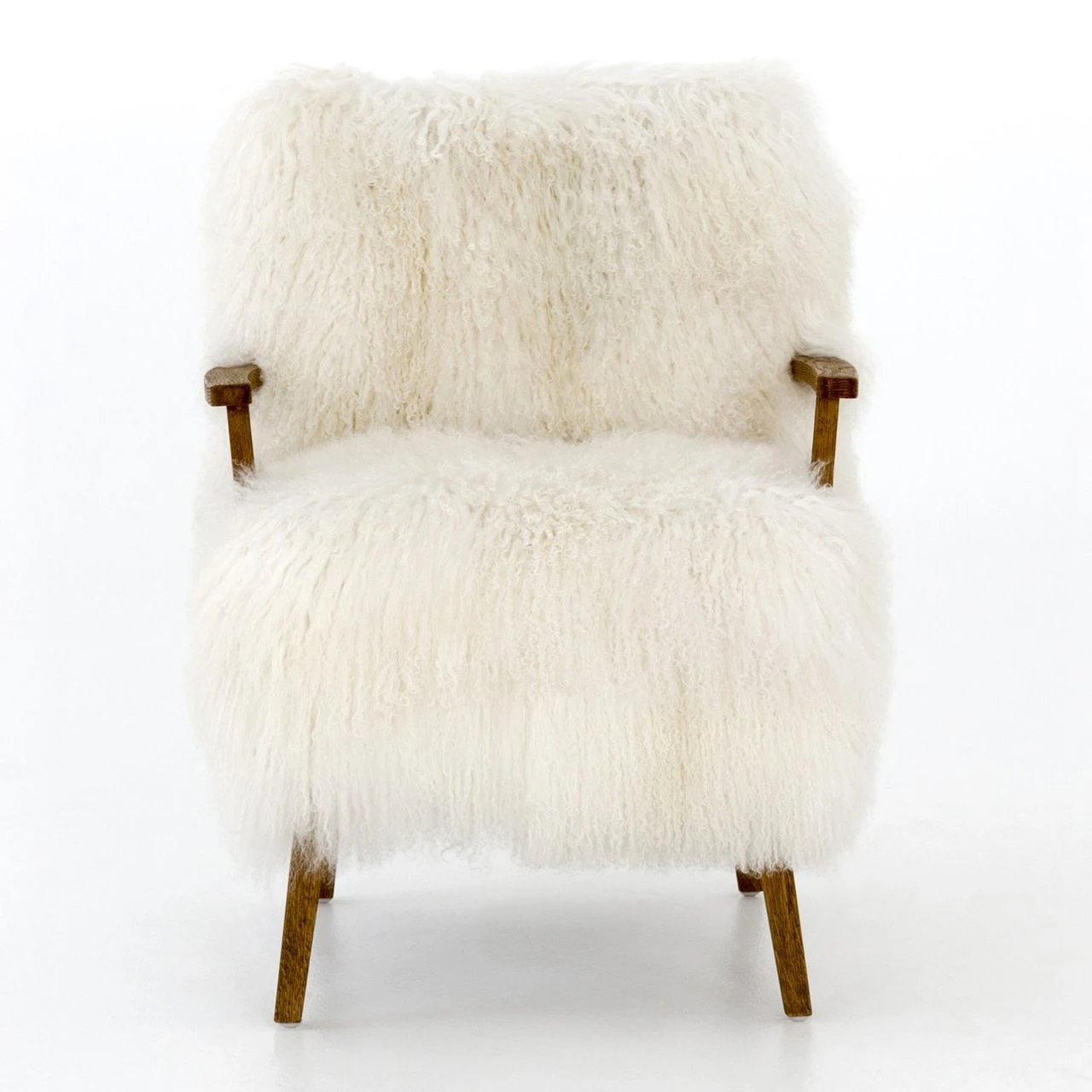 Our Ash Cream Mongolian Fur Accent Chair features a retro modern design with a plush side. A true conversation starter. Sculpted arms of drifted oak emerge from shaggy, cream-colored seating of Mongolian fur. This chair’s luxurious seat and back are expertly upholstered in exquisitely soft Mongolia Fur.