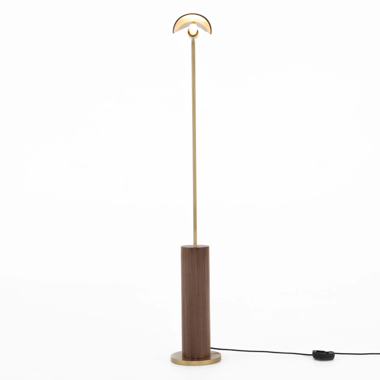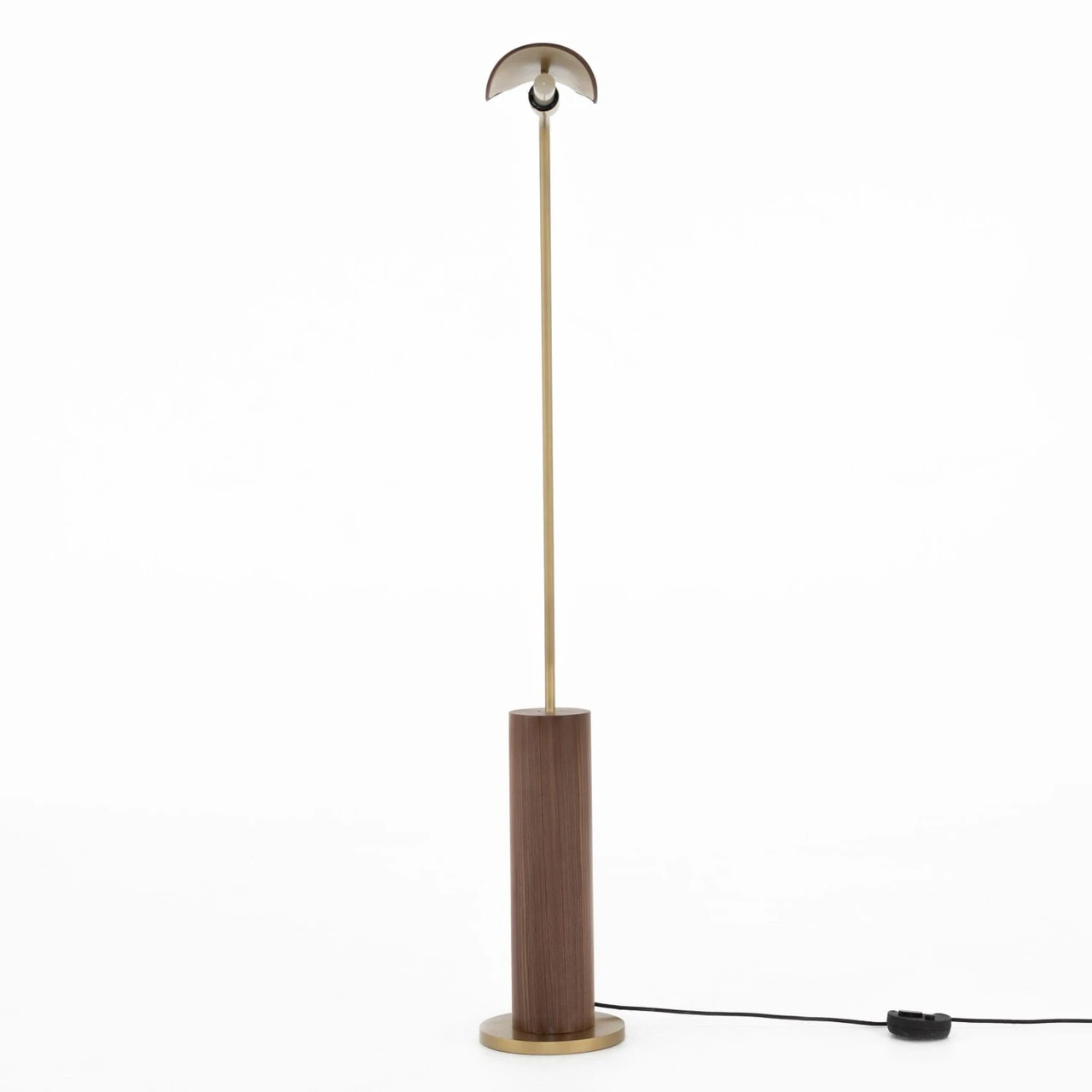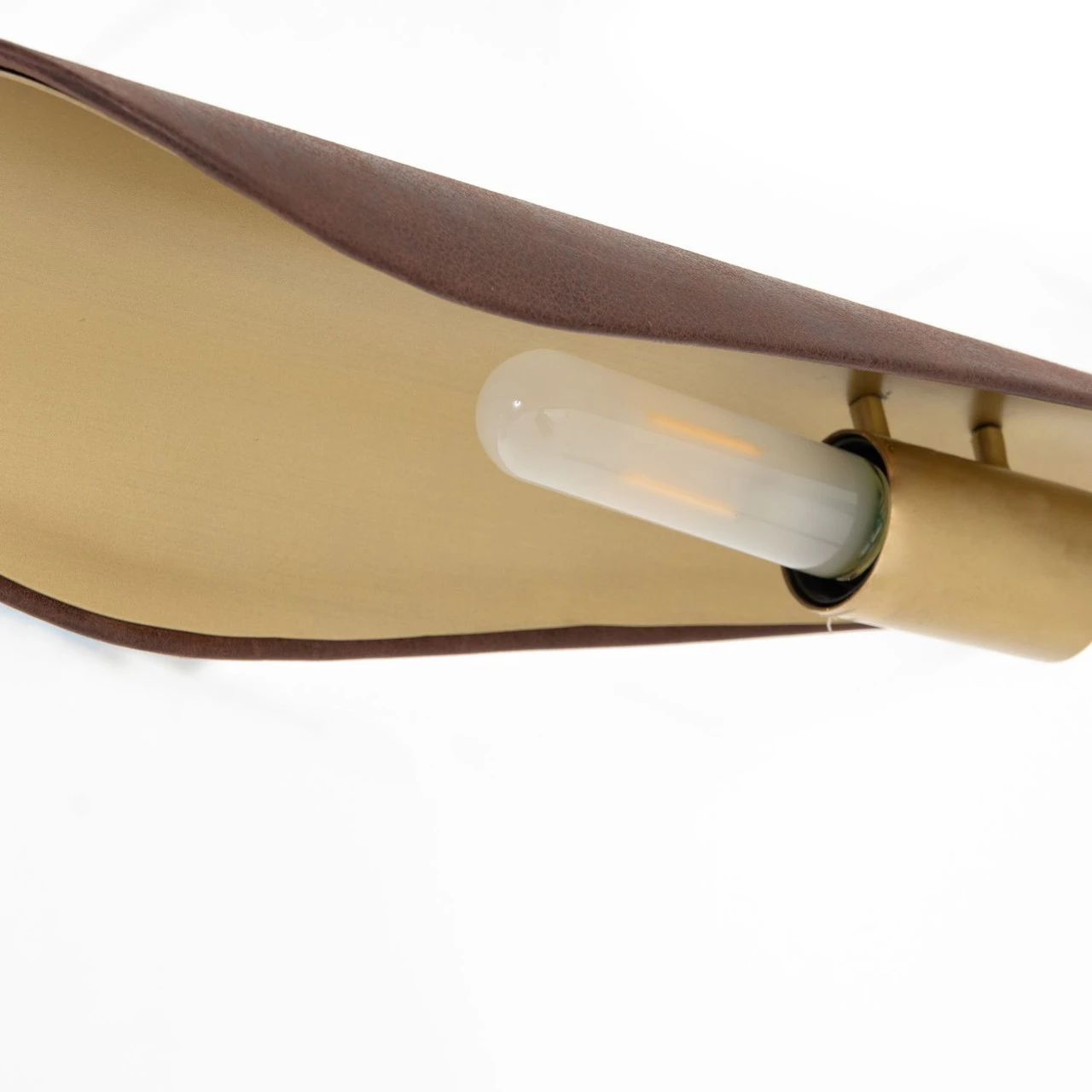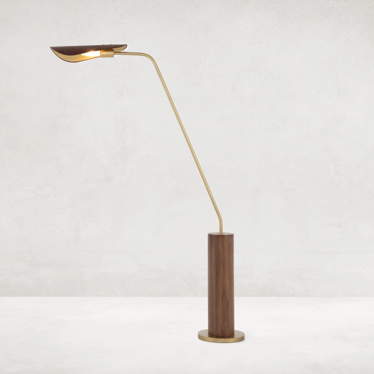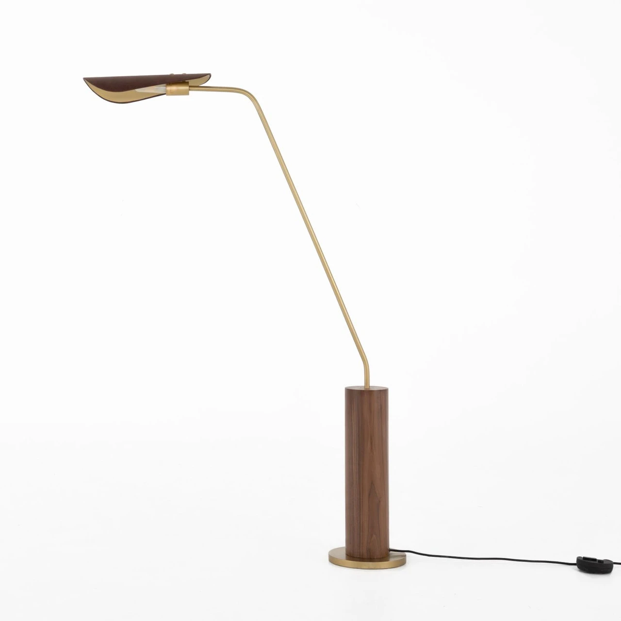 Switch on style. Perfectly sized to slide over the arm of a favorite sofa or reading chair, a walnut veneer base supports brass-finished steel tubing and a brown top-grain leather shade with brass pin detailing for a forward-thinking material mix. T10 LED non-dimmable bulb included. 3m black cloth cord. This item is UL-listed and manufactured in compliance with North American standards.