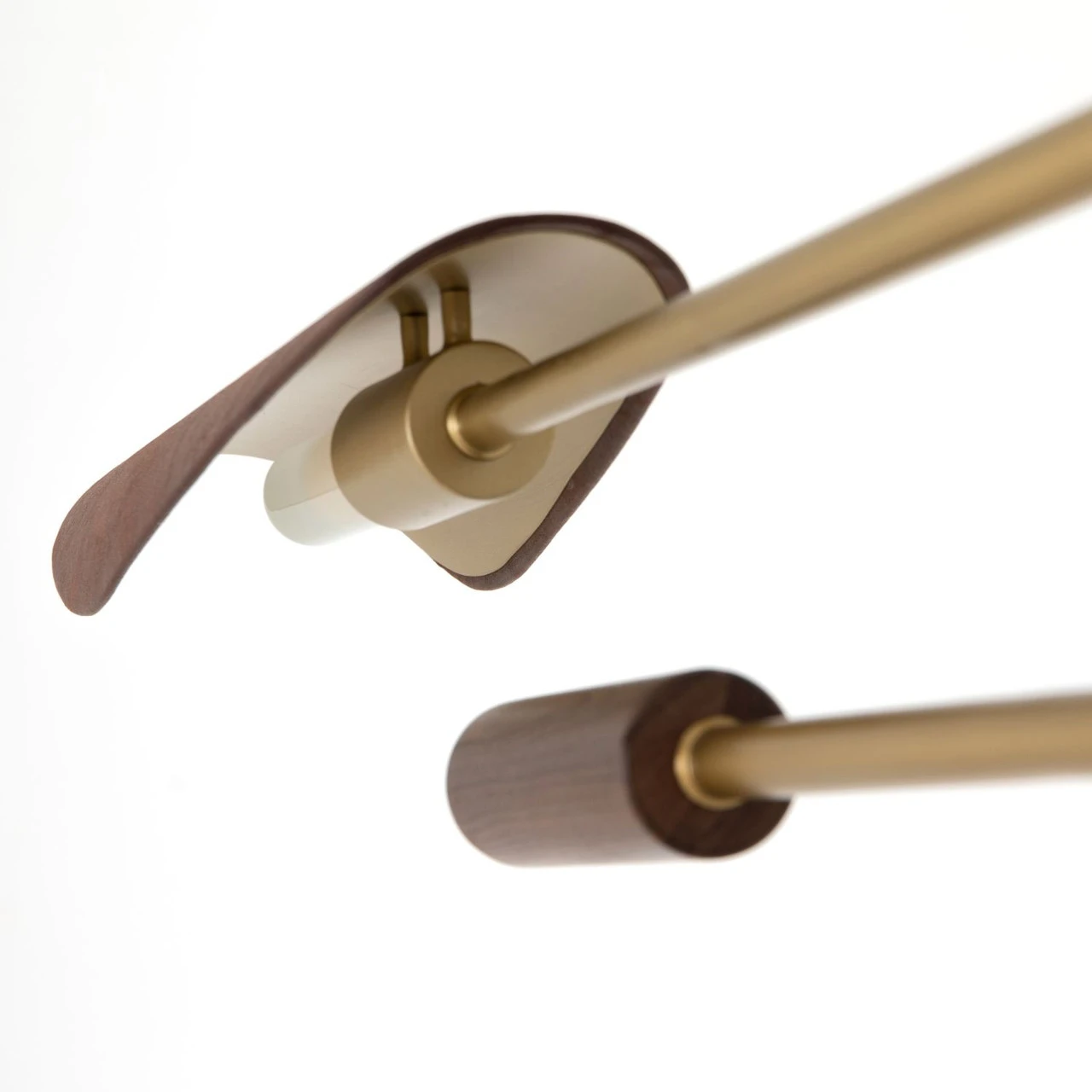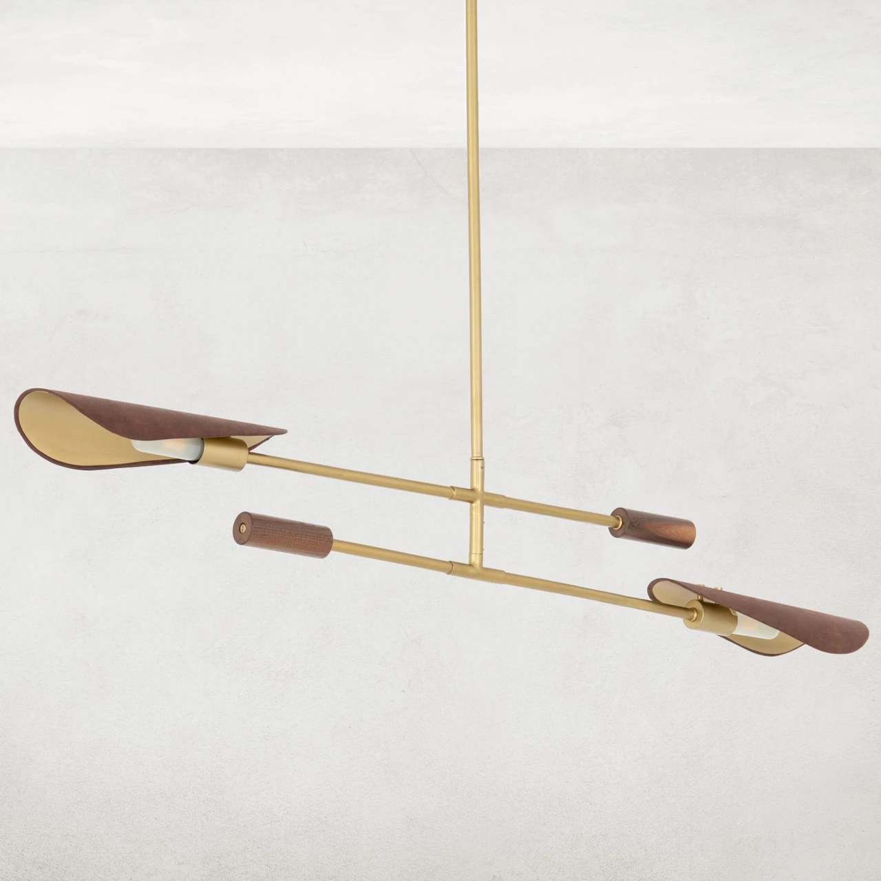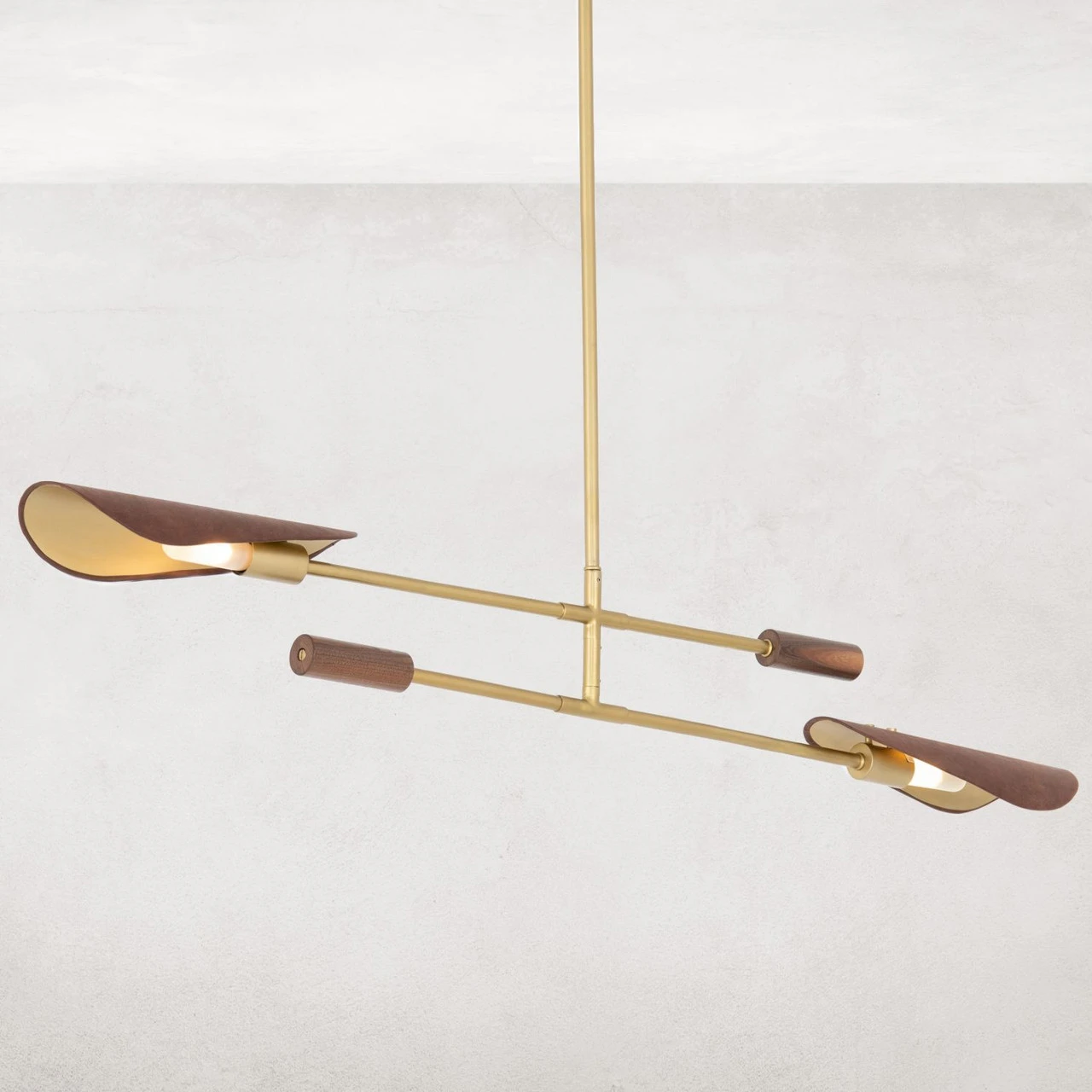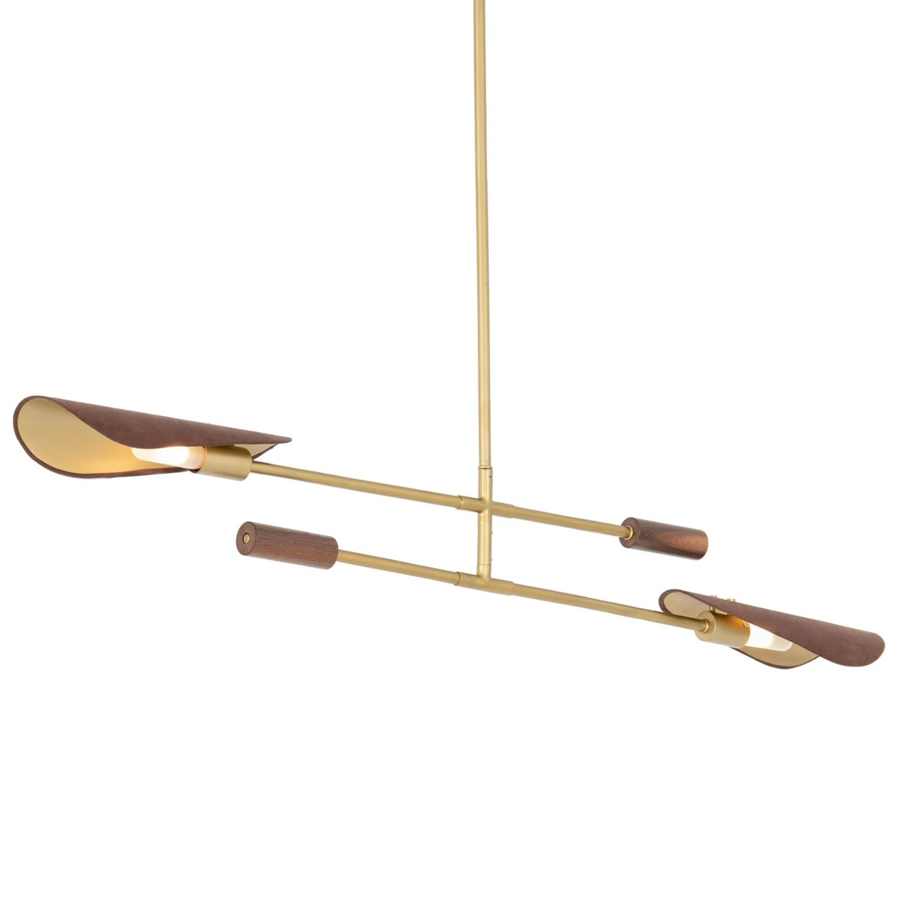 Switch on style. Finished in an antique brass, steel tubes sleekly intersect, with decorative walnut veneer tips and top-grain leather shades with brass pin detailing for a forward-thinking material mix. Includes T10 LED bulbs plus additional piping for adjustability from 28″ to maximum hanging length of 55″. This item is UL-listed and manufactured in compliance with North American standards.