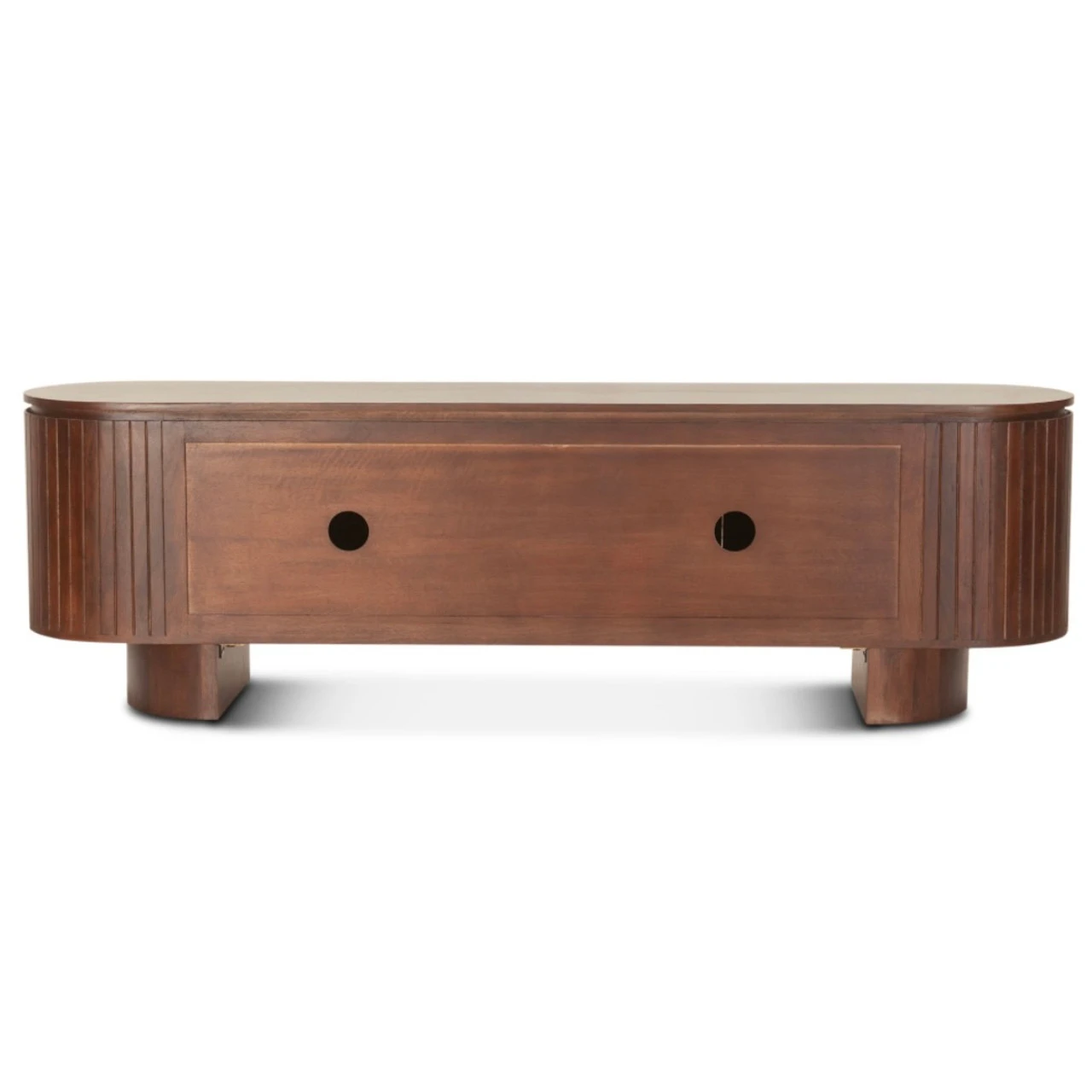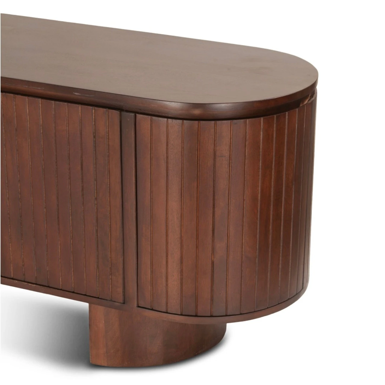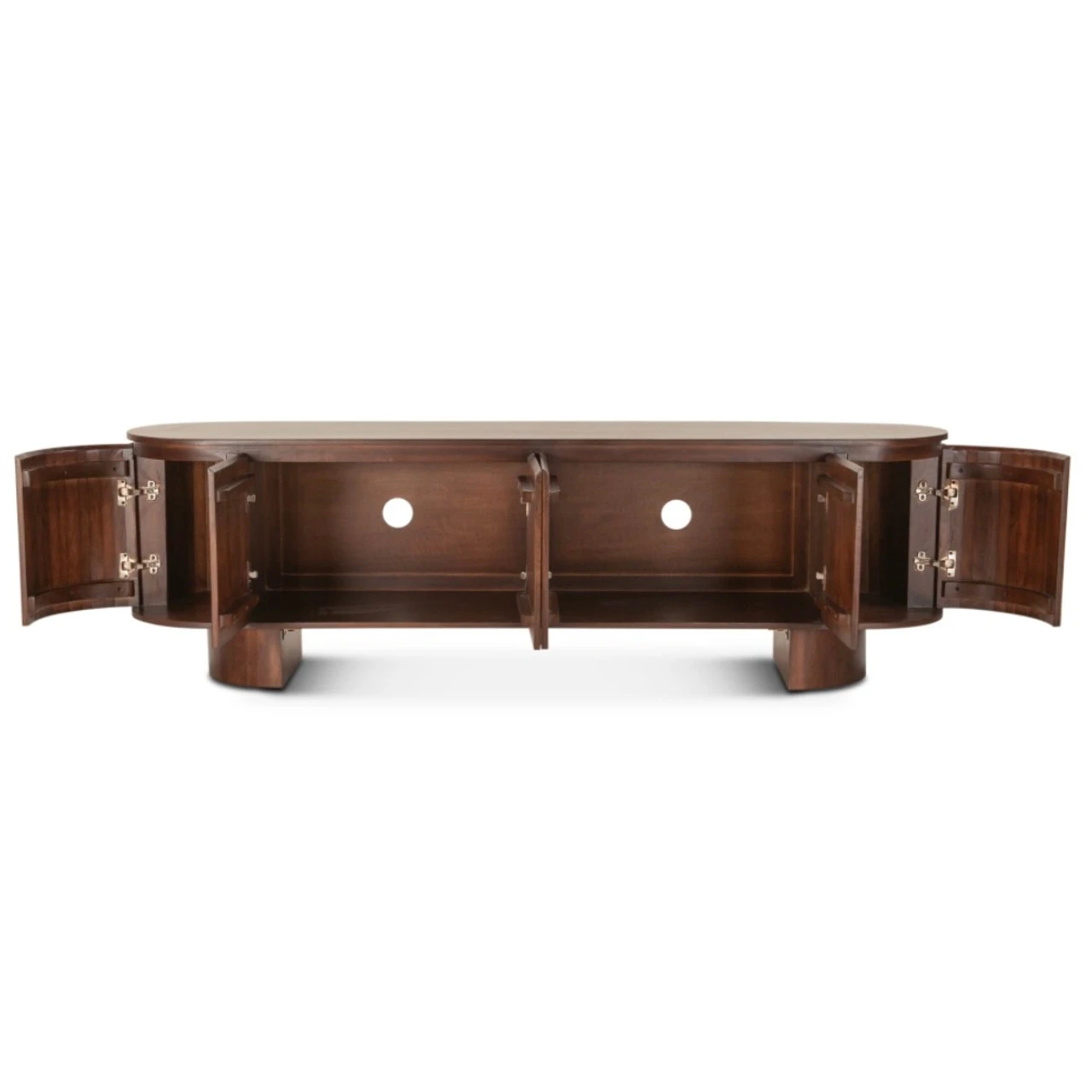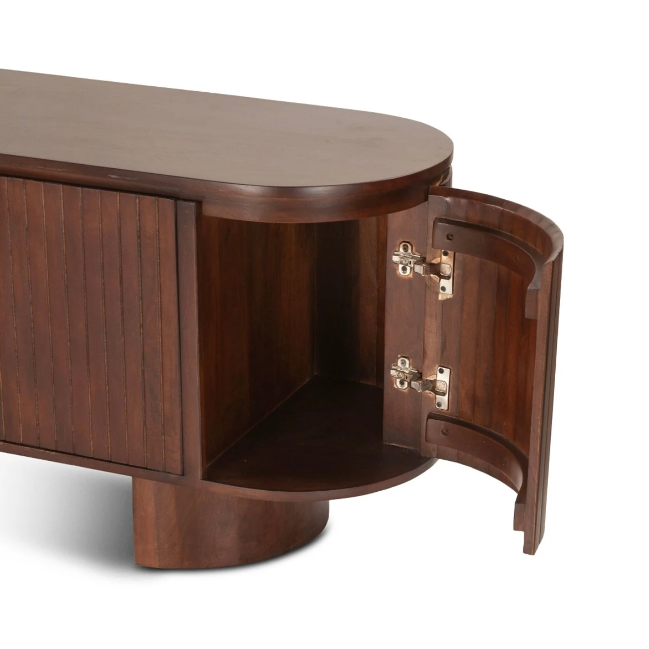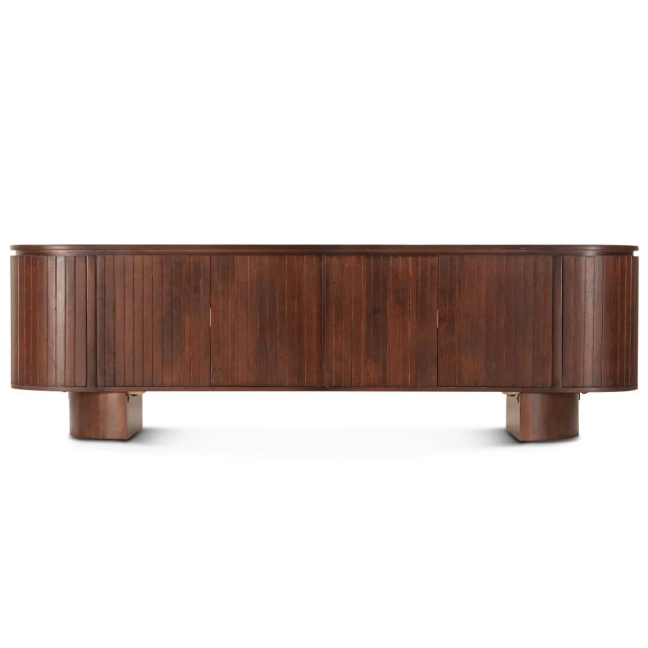 The Athena Media Cabinet features four interior storage cabinets with shelves that provide a unique touch of elegance and functionality. Its simple yet, sophisticated design allows it to blend seamlessly with any decor style, making it a versatile piece that can easily be incorporated into any setting. Crafted from solid mango wood, this media cabinet showcases a beautiful natural grain pattern, and its rich, aged mahogany finish complements the overall design.