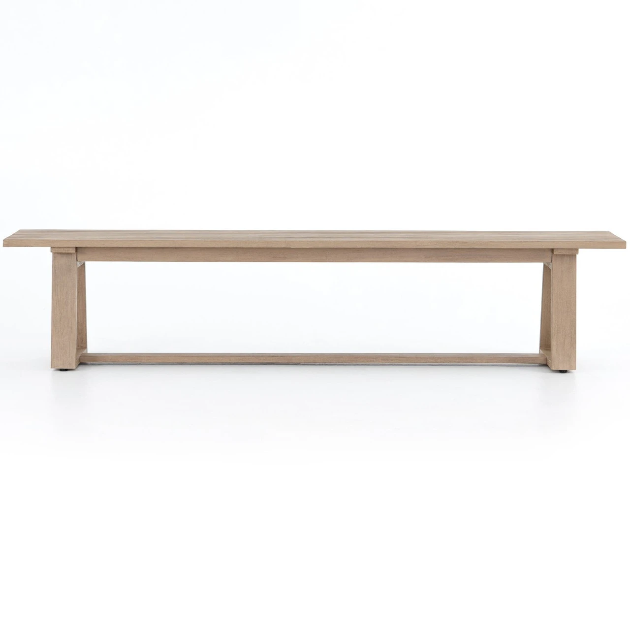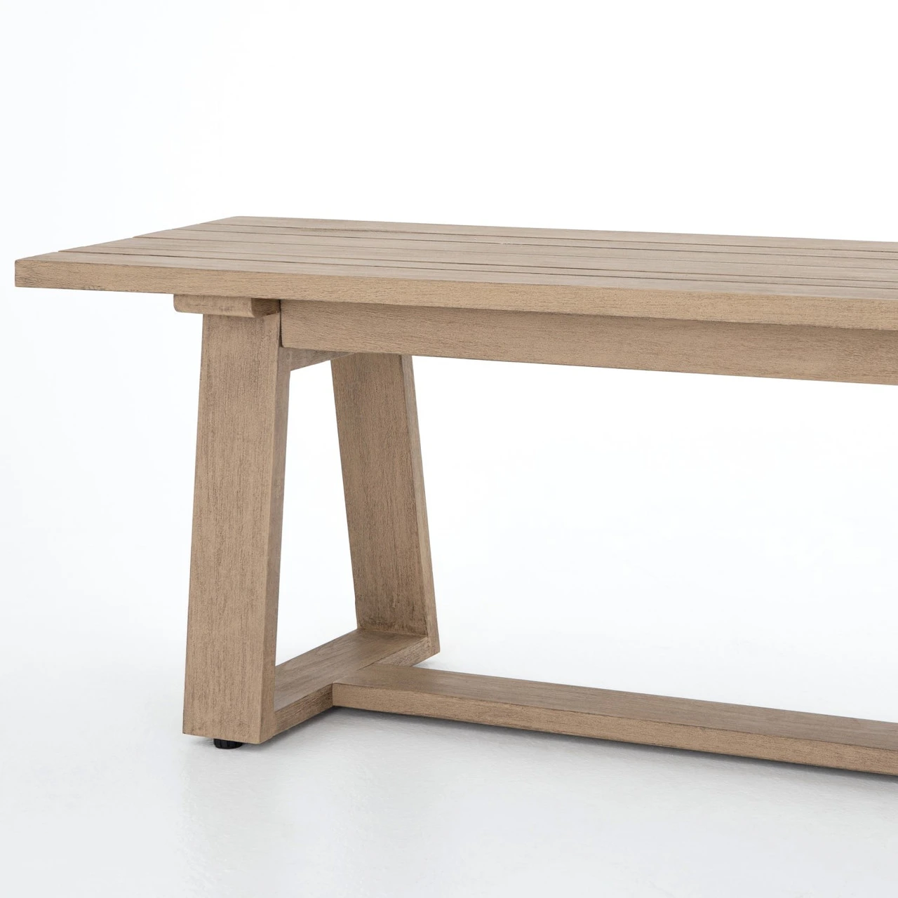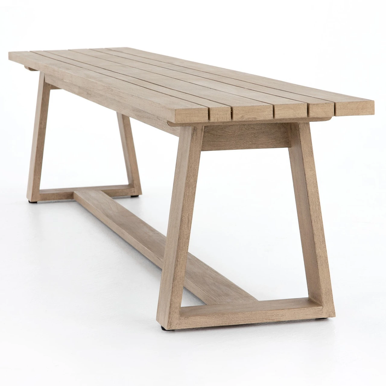 Simple and stylish, angular bench seating of washed brown teak is perfect for outdoor entertaining. Cover or store indoors during inclement weather and when not in use.
