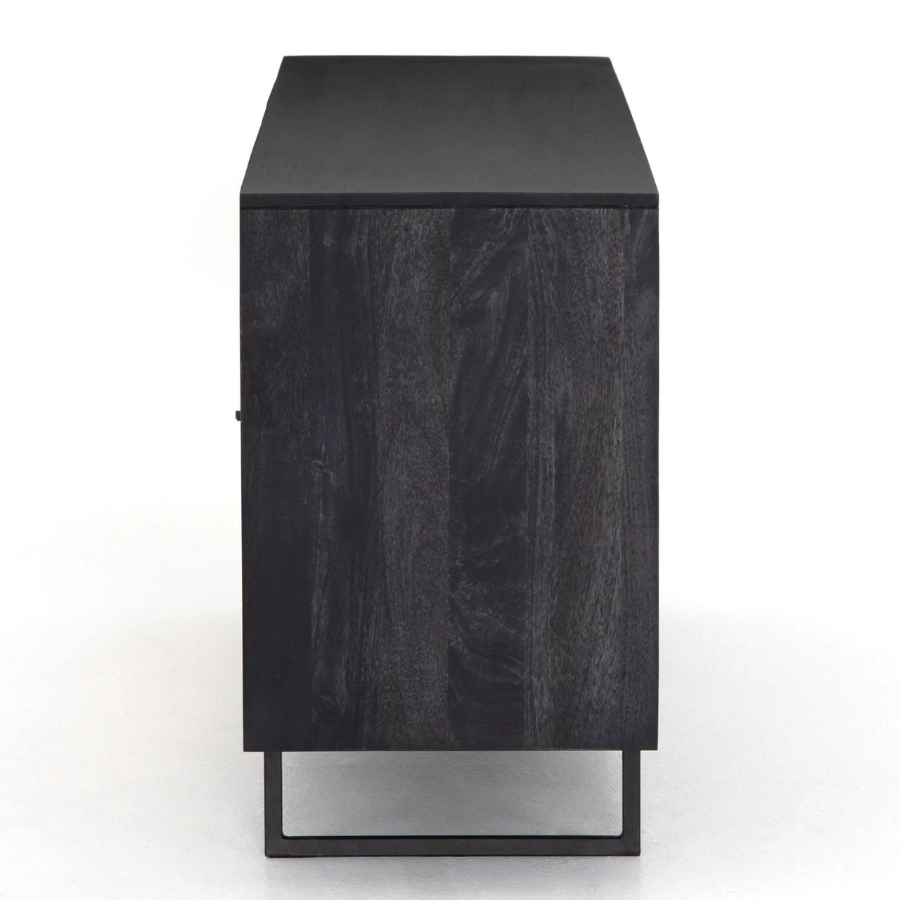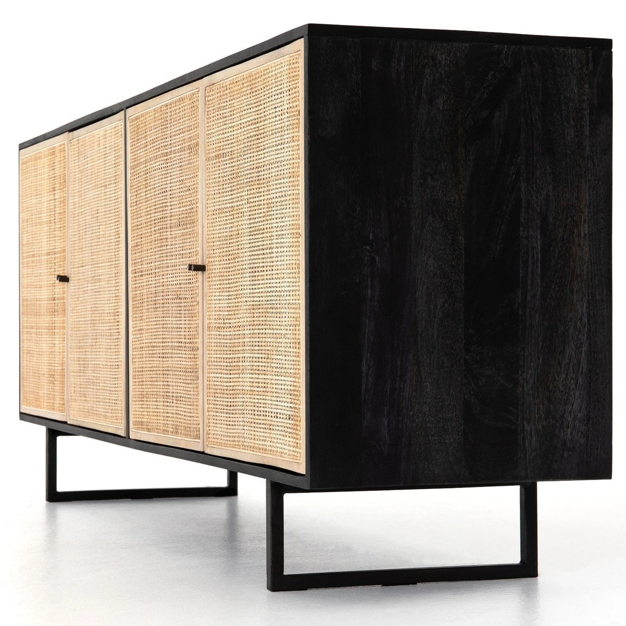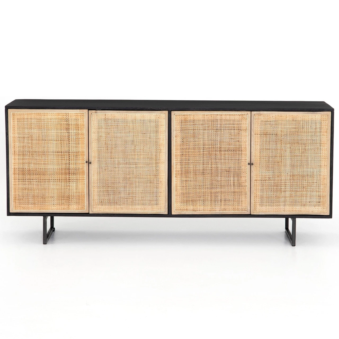 Mid-century-inspired coastal style buffet sideboard with an organic twist. Black wash finished mango wood frame casing showcase doors inset with panels of light cane weave rattan for a fresh look with natural depth Angular gunmetal-finished iron legs offer an intriguing contrast of texture and tone. Four door, Shelving and posterior cord management for modern storage. Our Audrey woven wicker 4 Door Sideboard brings a relaxed coastal beach look to the living room or dining room.