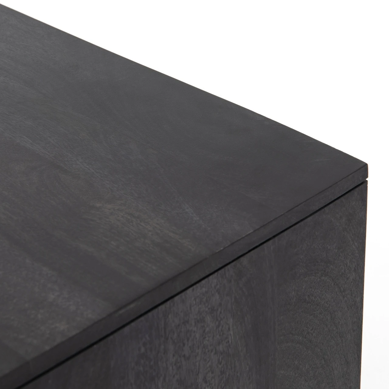 Mid-century-inspired coastal style with an organic twist. Black wash finished mango wood frame casing showcase doors inset with panels of light cane weave rattan for a fresh look with natural depth and remote control signal access. Angular gunmetal-finished iron legs offer an intriguing contrast of texture and tone. Shelving and posterior cord management for modern media storage. Our Audrey Woven Media Console brings a relaxed coastal beach look to the living room or family room.