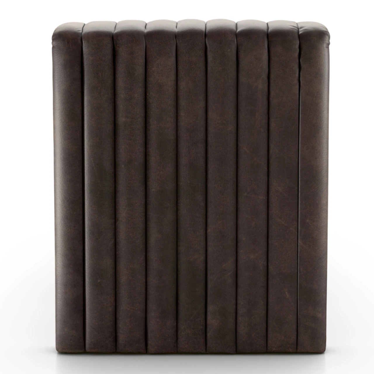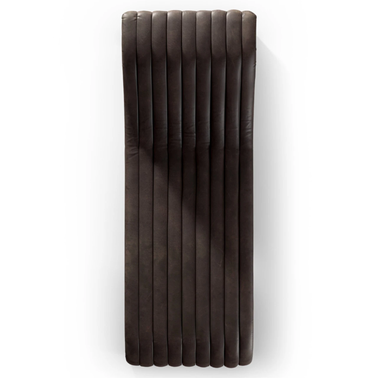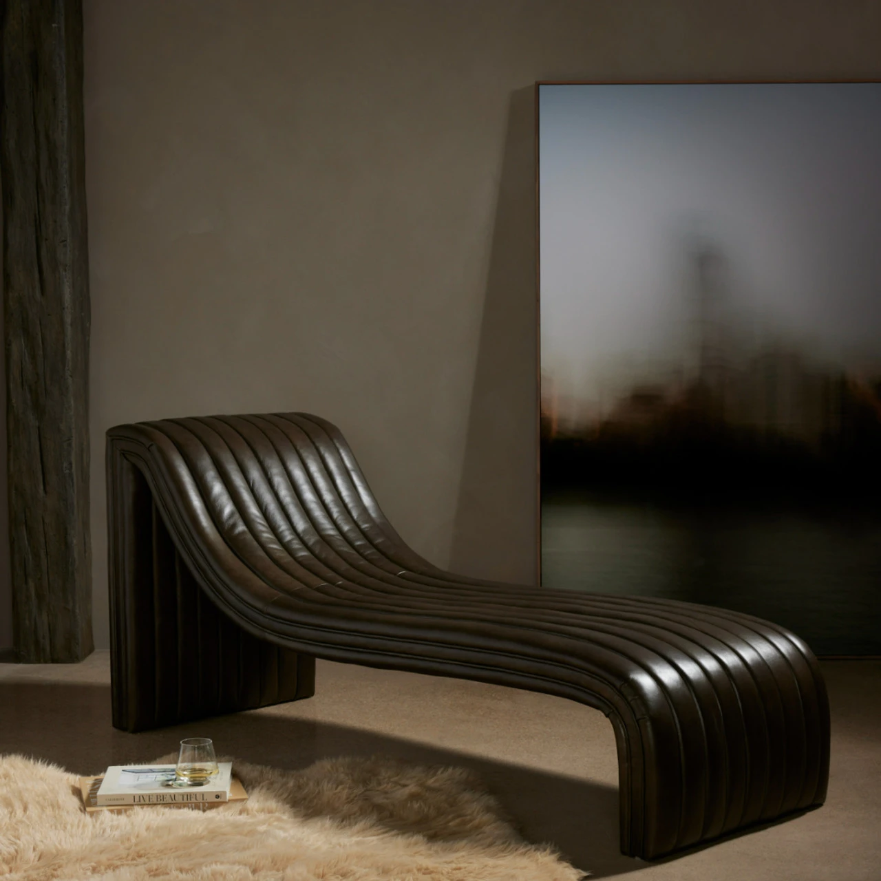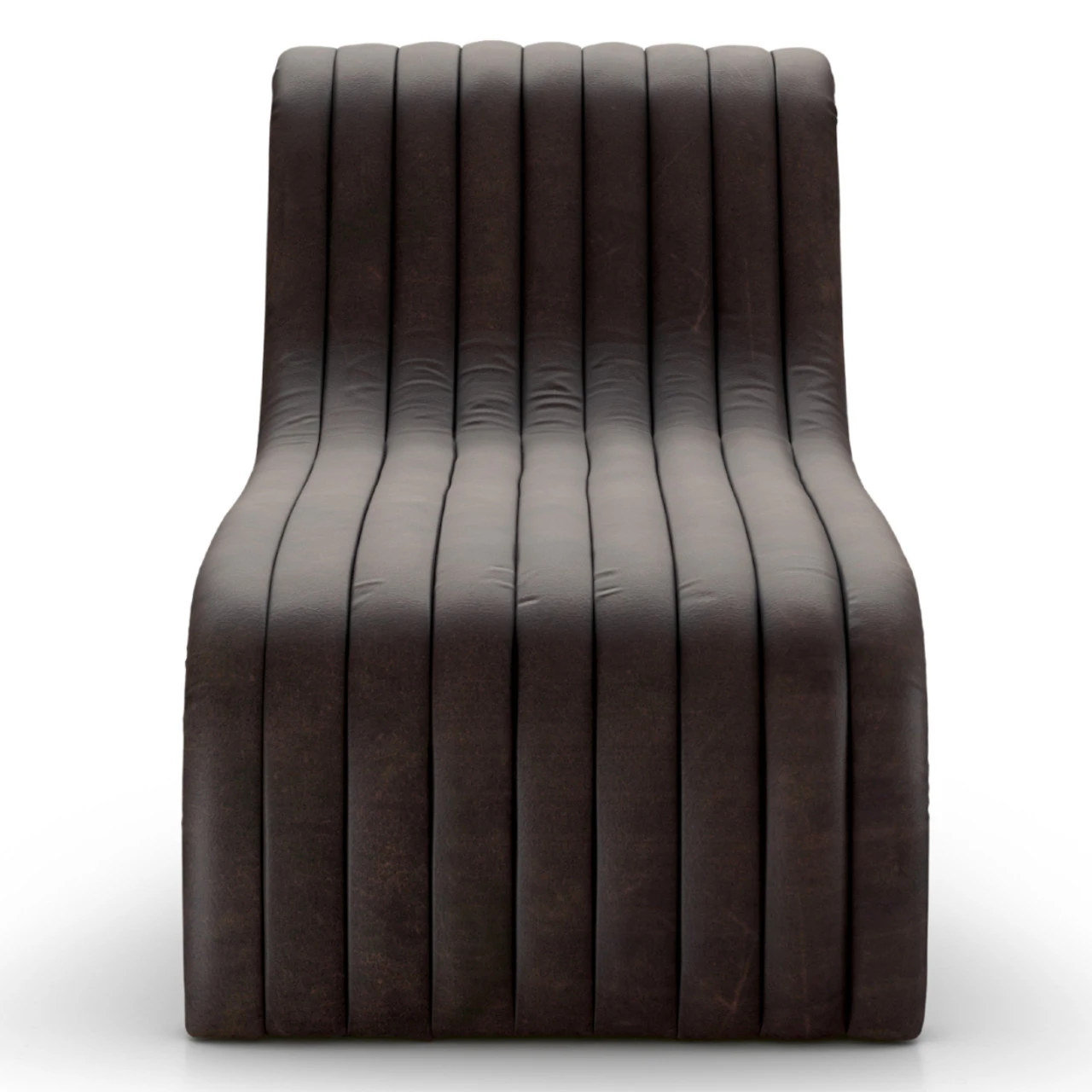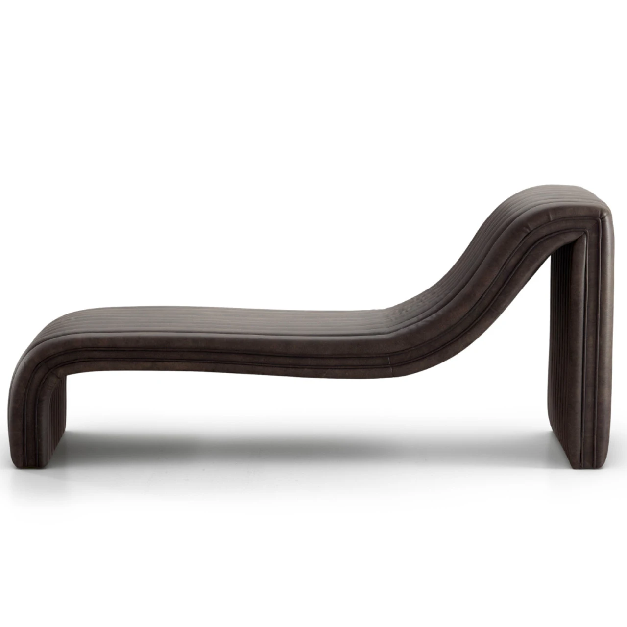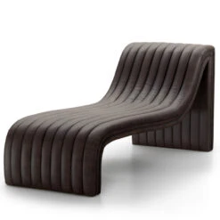 A modern take on the classic chaise, top-grain leather adopts dramatic linear channeling for texture and comfort alike.