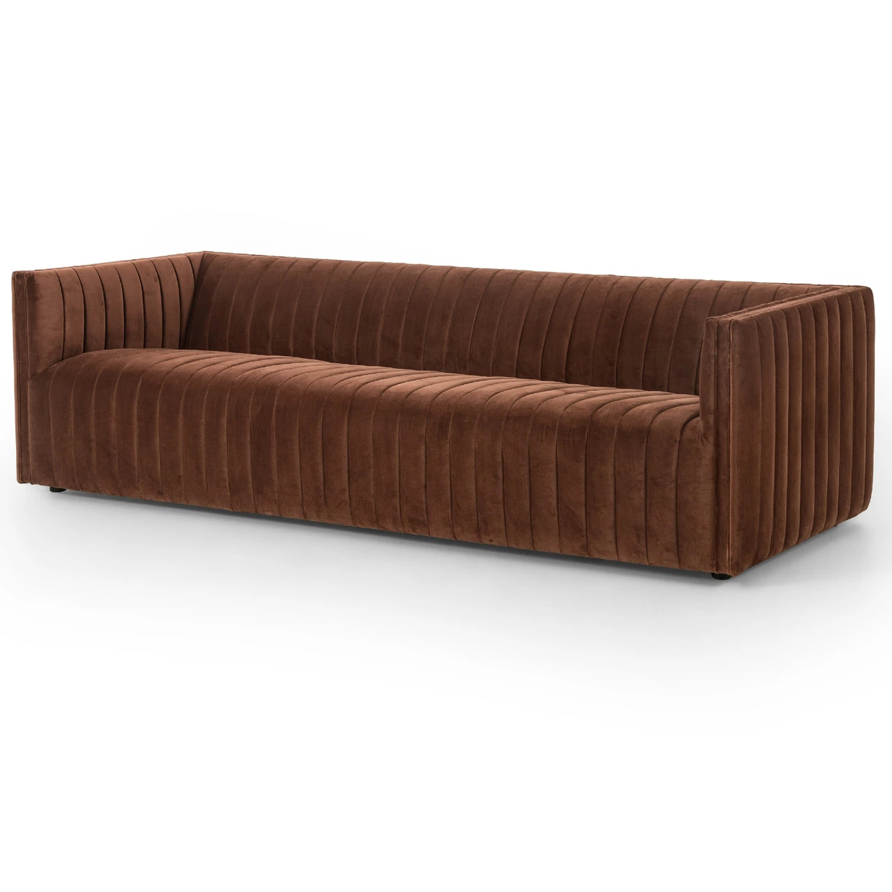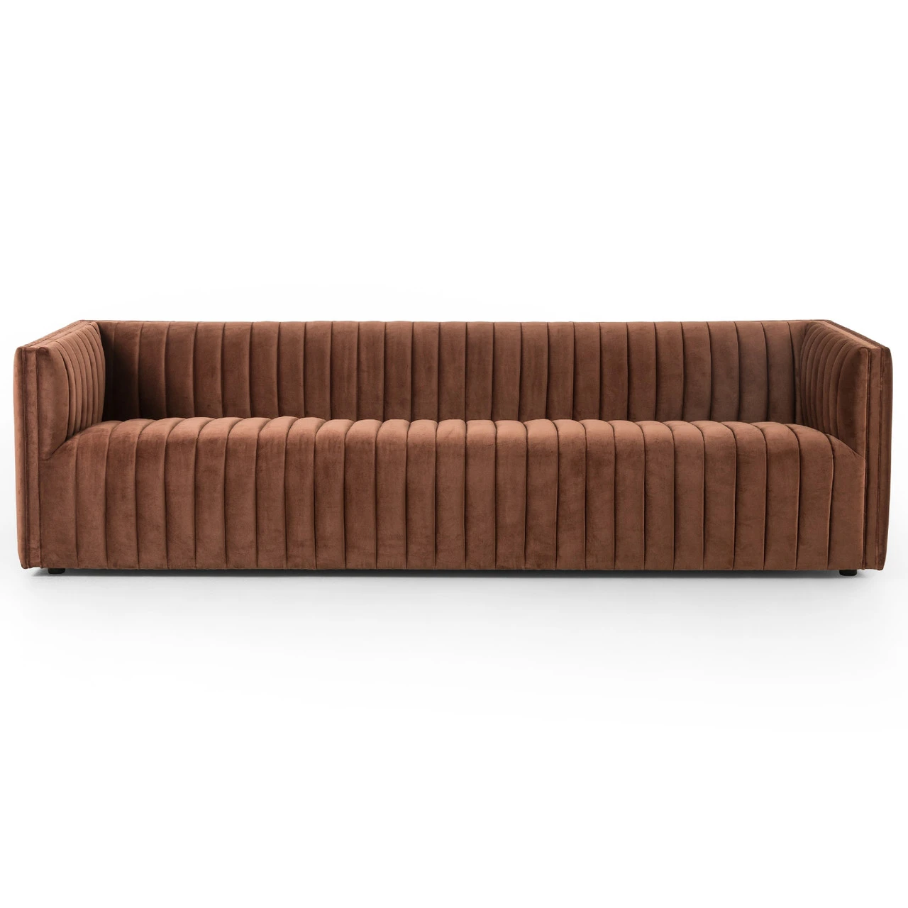 Velvety poly-blend in a rich auburn hue takes on dramatic channeling, lending trend-forward texture to this sumptuous extended length sofa.