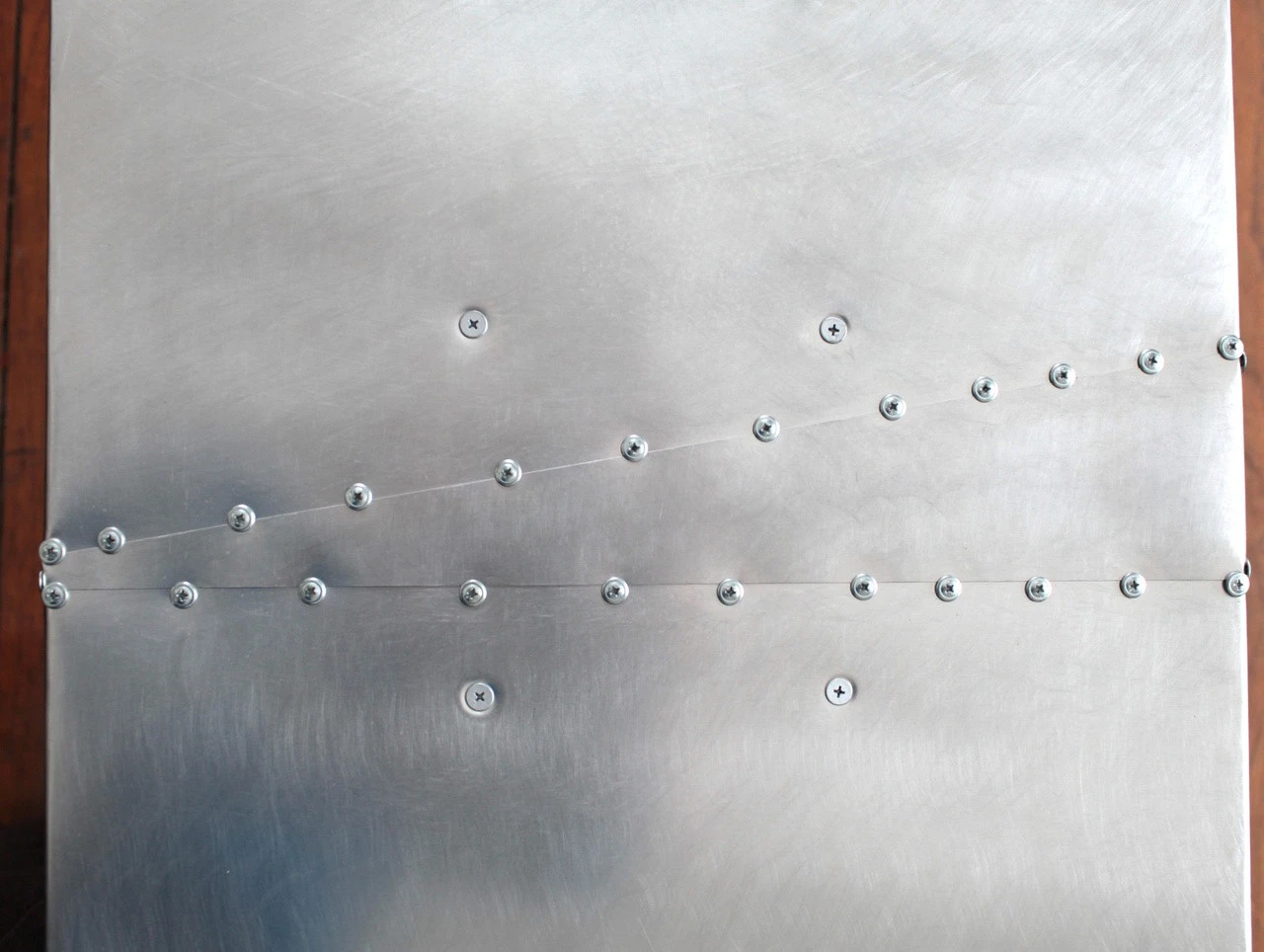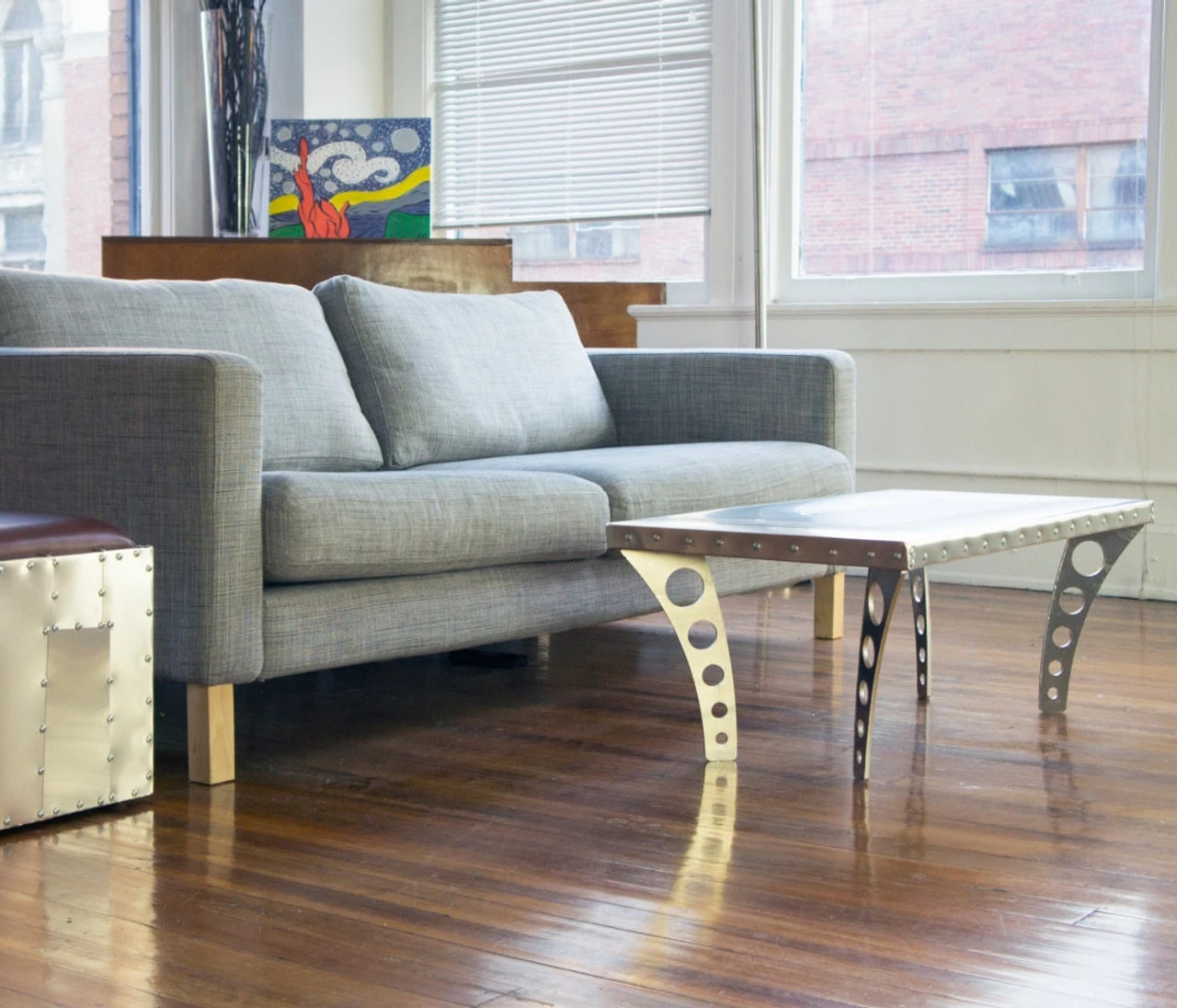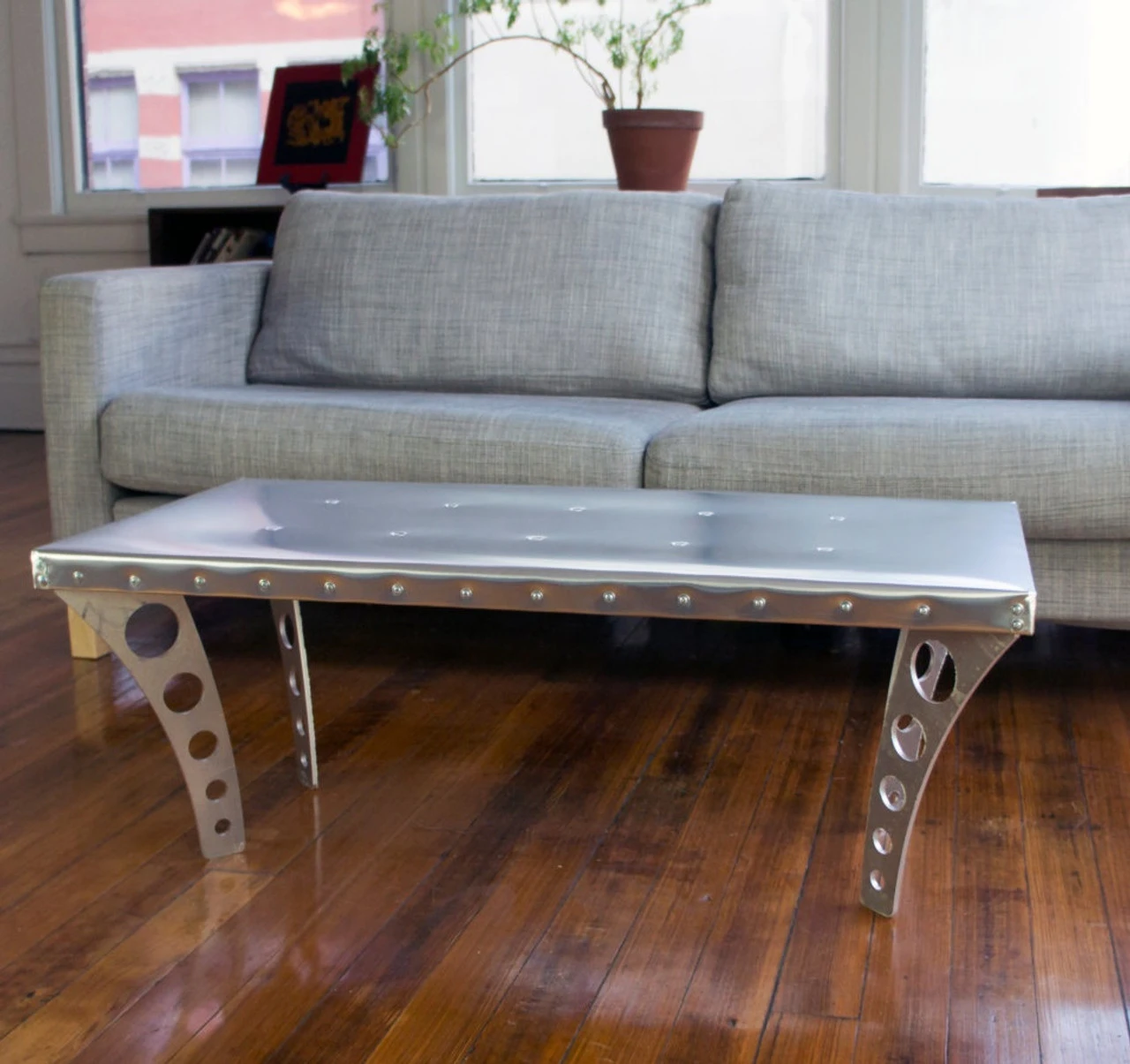 The Brushed Finish JetSet Coffee Table from RamonaMetal is a rugged, versatile table inspired by vintage aircraft fuselage patchwork. Each table is carefully sanded by hand with fine sandpaper to achieve a gorgeous brushed look. The table is handcrafted by our skilled fabricators within the United States and features a wood core with aluminum covering and laser cut aluminum legs. Each JetSet Coffee Table is a unique piece of art with its own, handcrafted characteristics. Each JetSet table will vary slightly in appearance. Aluminum is a soft, durable material and minor scratches/scuffs are a feature– not a defect.