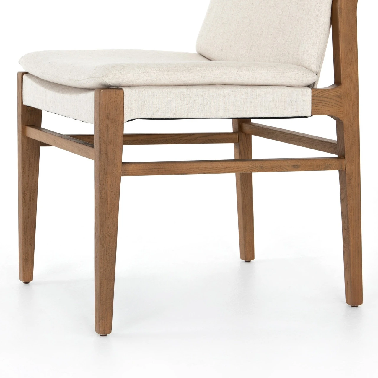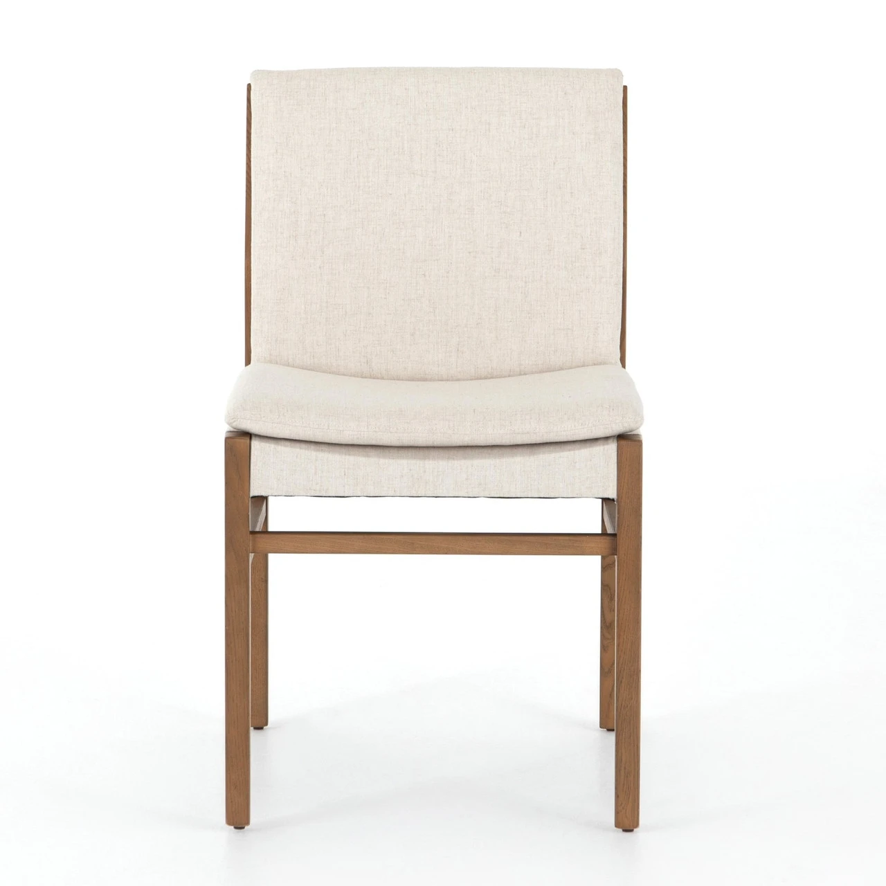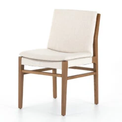 Modern and transitional, brown-finished nettlewood frames armless performance-upholstered seating in a beautifully casual off-white.