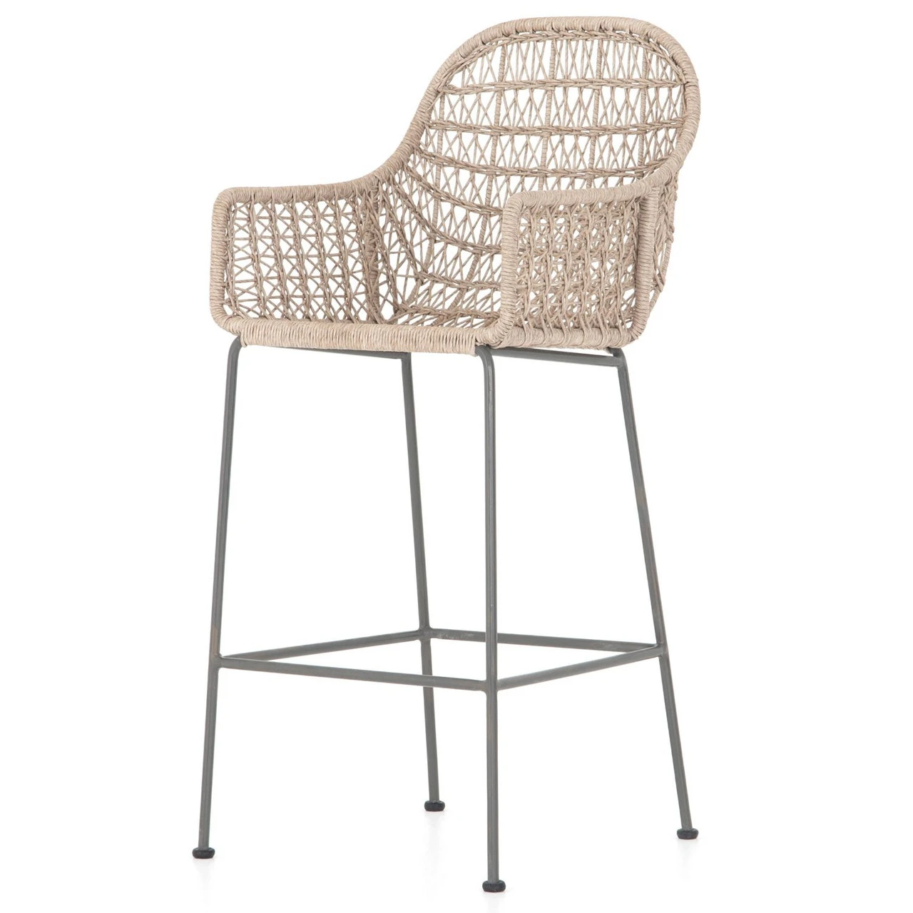 Contemporary shaping and a fresh white weave transform all-weather wicker into something modern. Club-style bar seating is supported by a slim, contrasting bronzed grey-finished iron base. Cover or store indoors during inclement weather and when not in use.