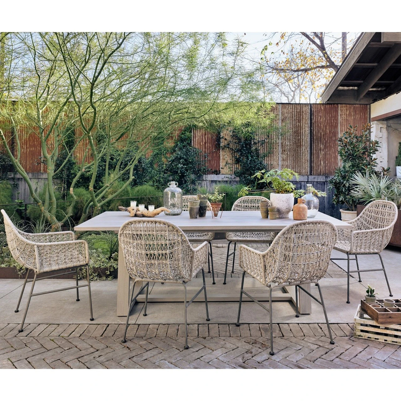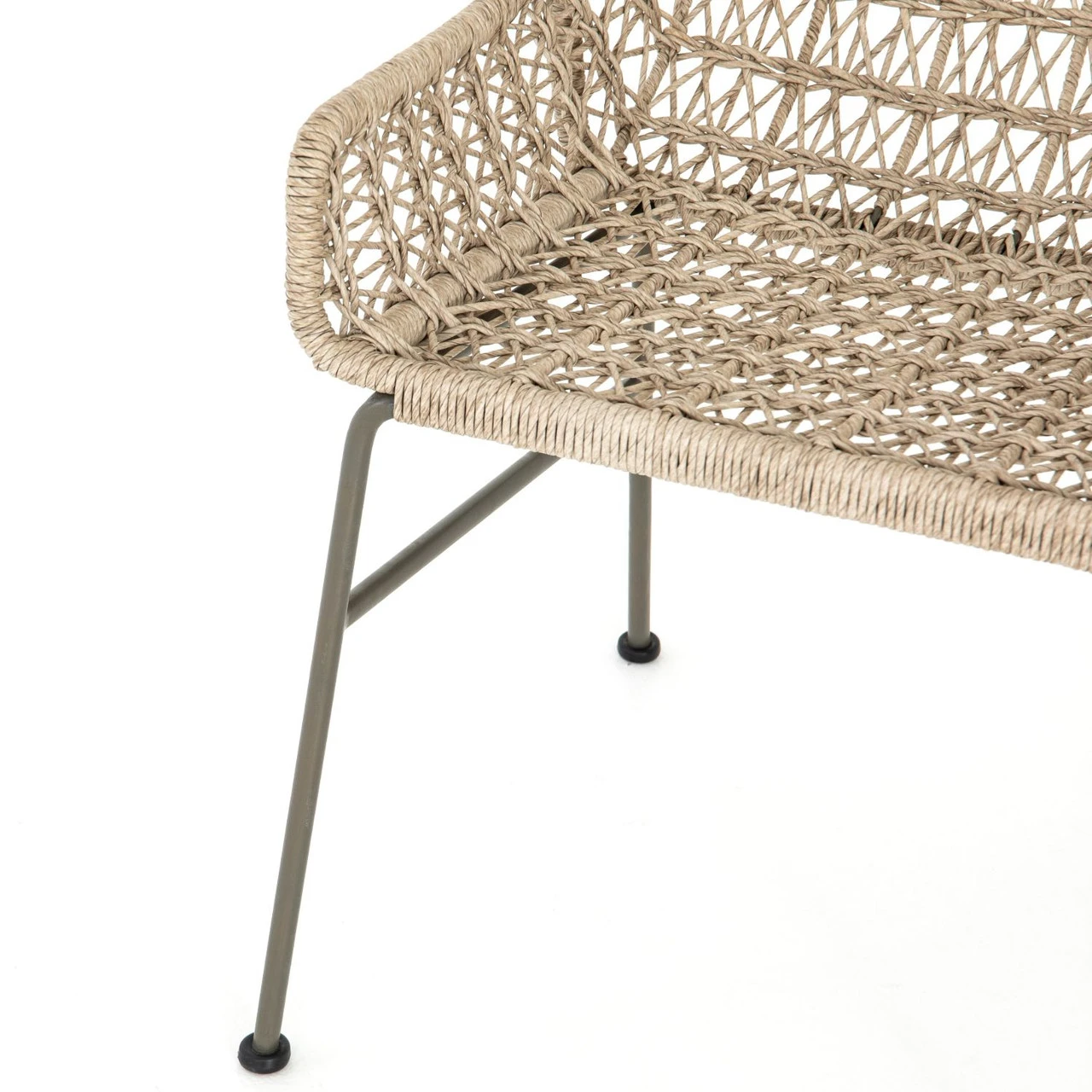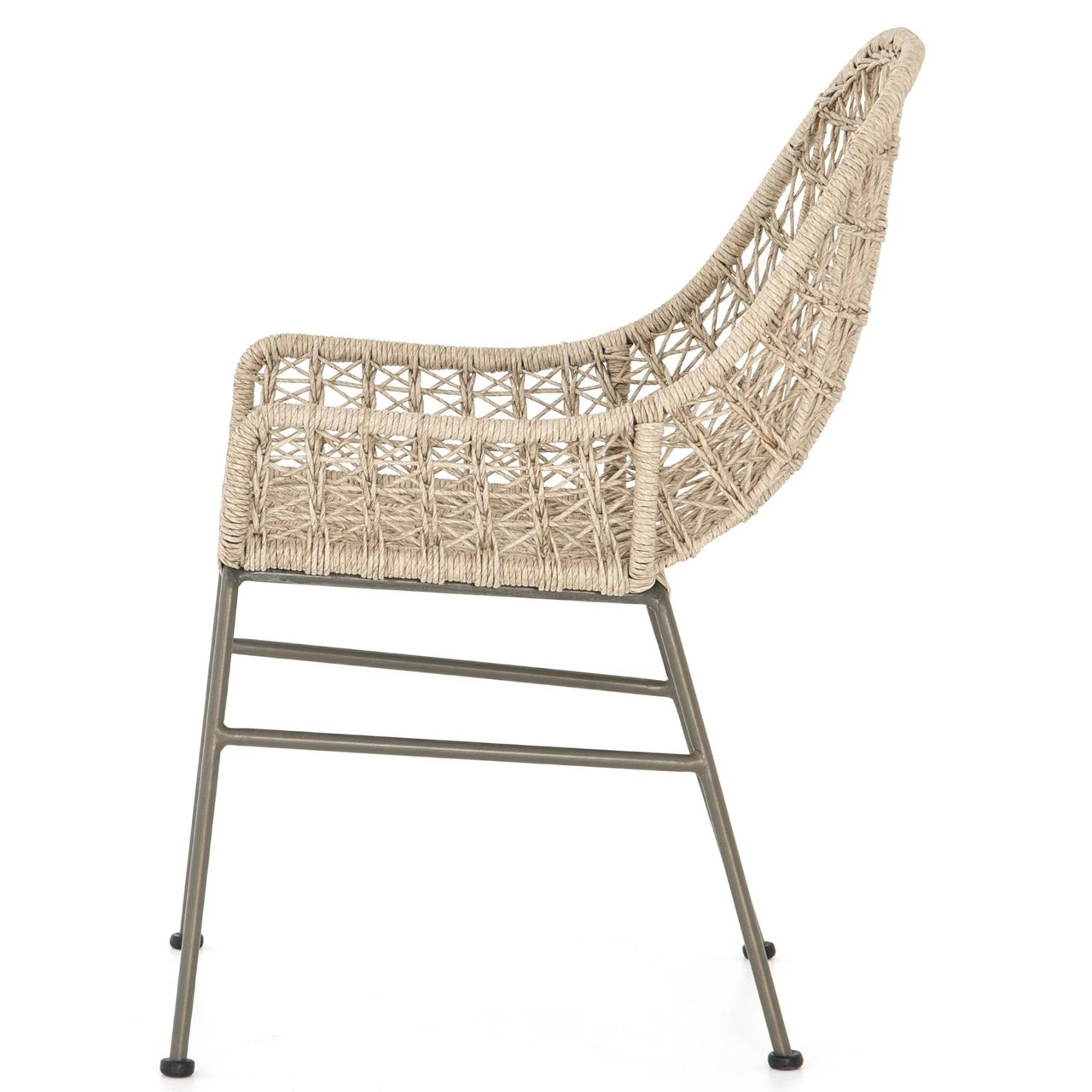 Clean, contemporary shaping and an updated weave transform white all-weather wicker into something modern. This low-armed dining chair is supported by a contrasting bronze iron base. Cover or store indoors during inclement weather and when not in use.