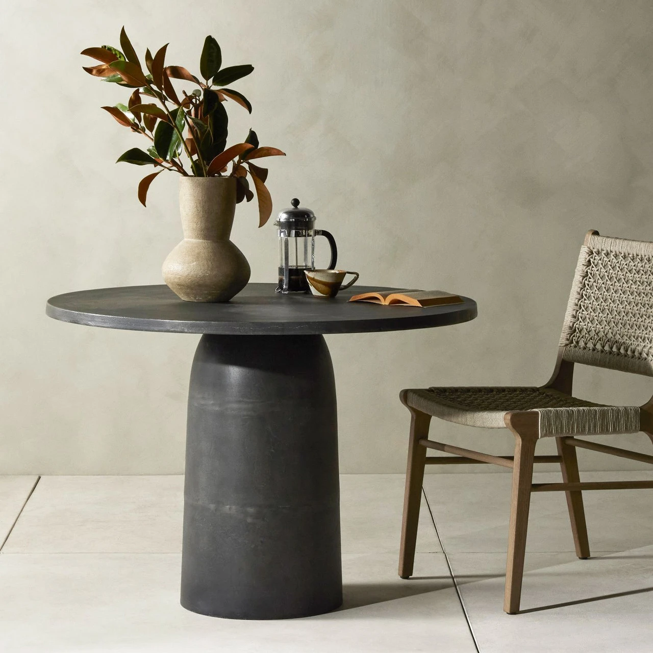 An aged grey finish highlights aluminum’s natural depth, for a sleek, simple look with implied movement. Stylish indoors or out. Cover or store indoors during inclement weather and when not in use.