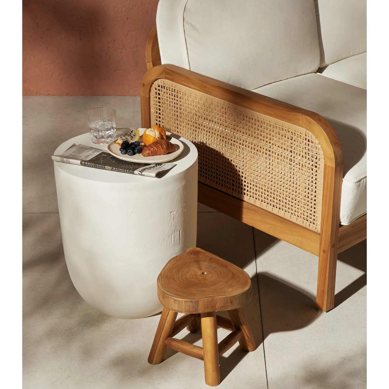 A matte white finish highlights aluminum’s natural depth for a sleek, simple look with implied movement. Stylish indoors or out. Cover or store indoors during inclement weather and when not in use.