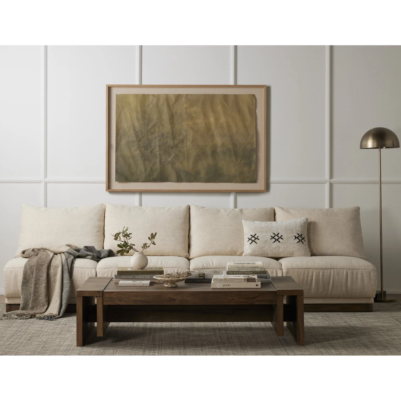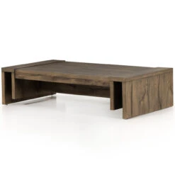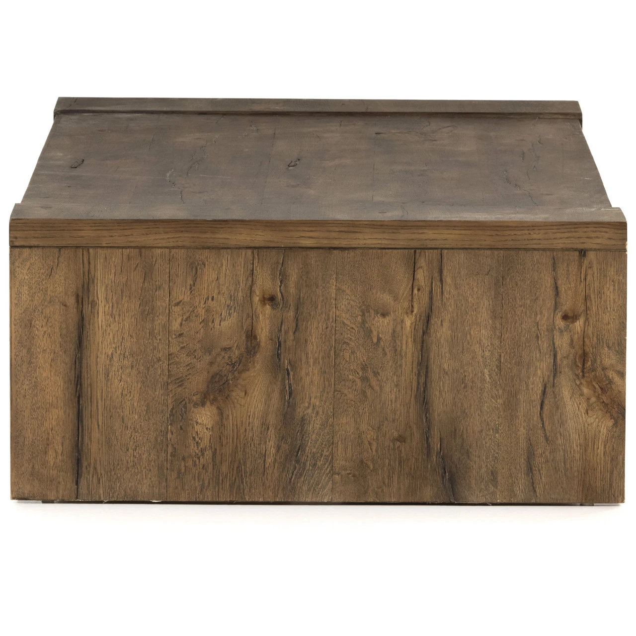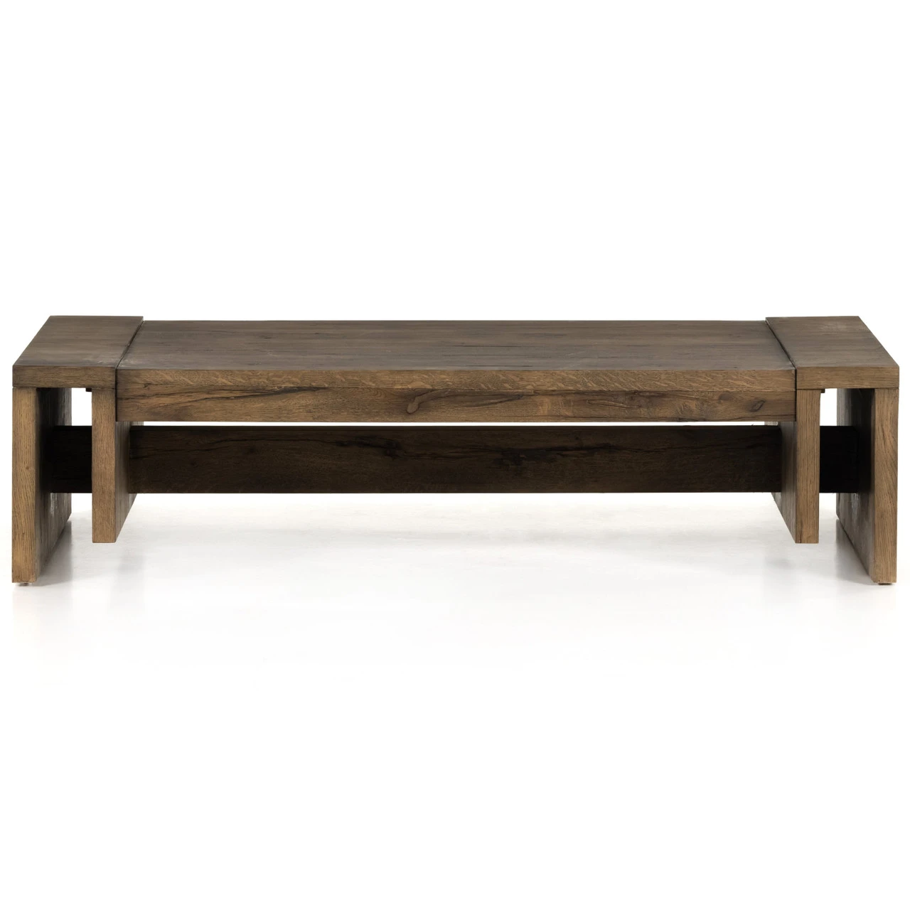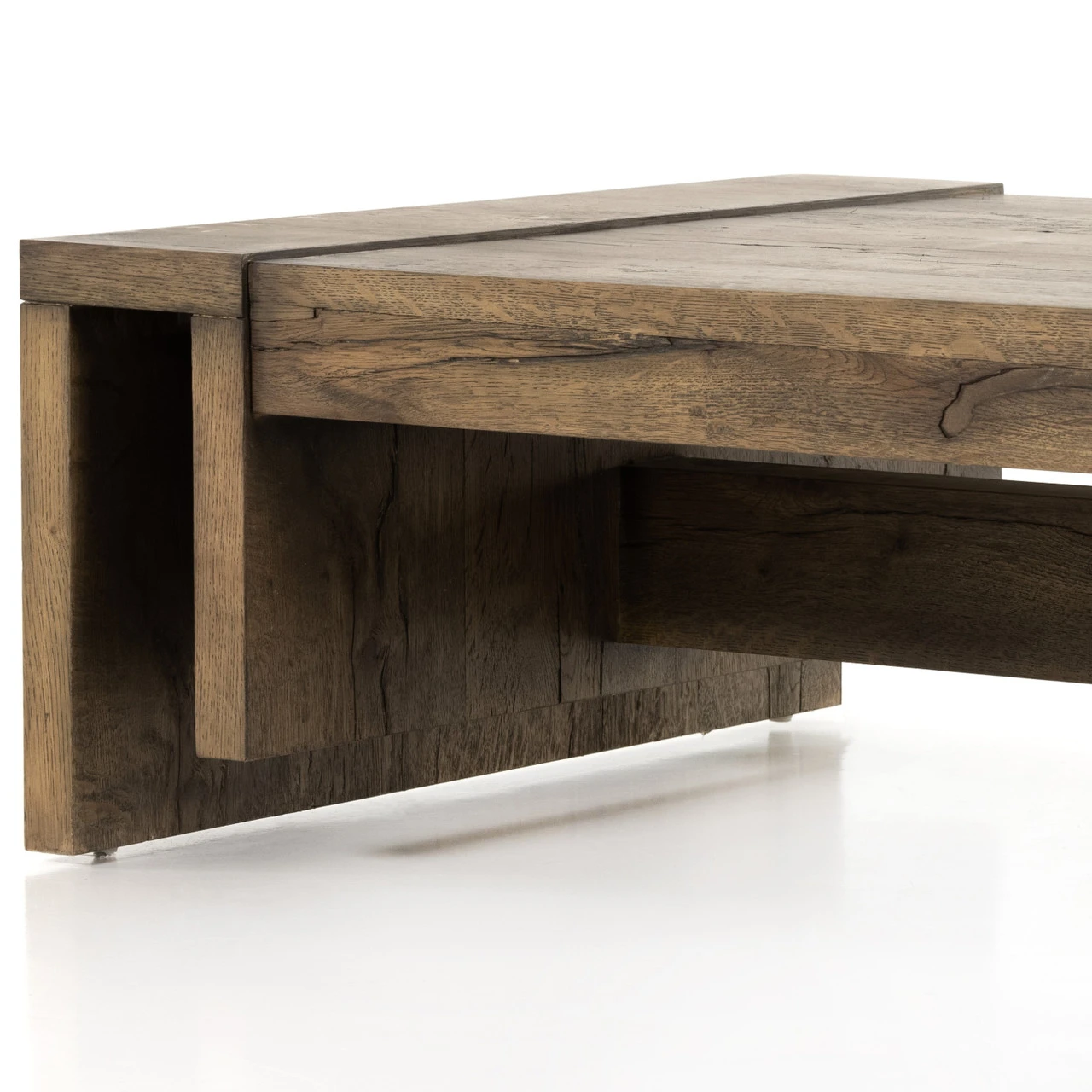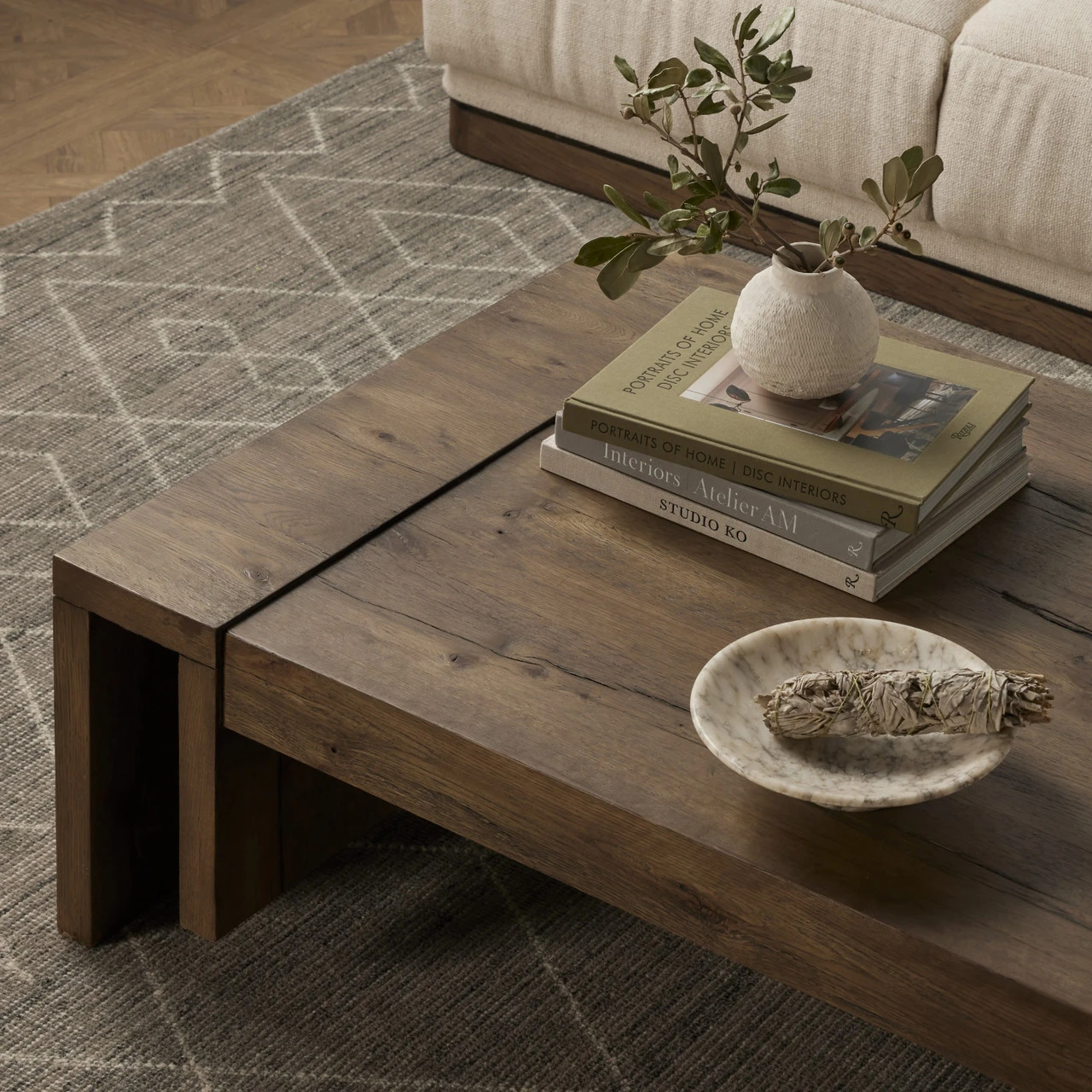 Finished in a rich, rustic brown, a double alter-style coffee table of thick, hand-selected oak veneer features visible knots and graining for a beautifully salvaged look.