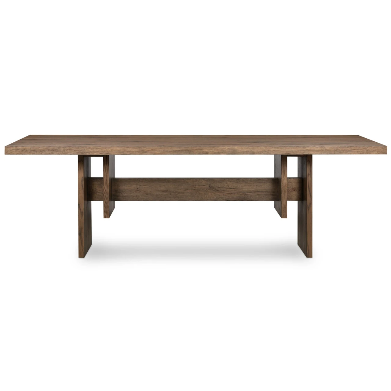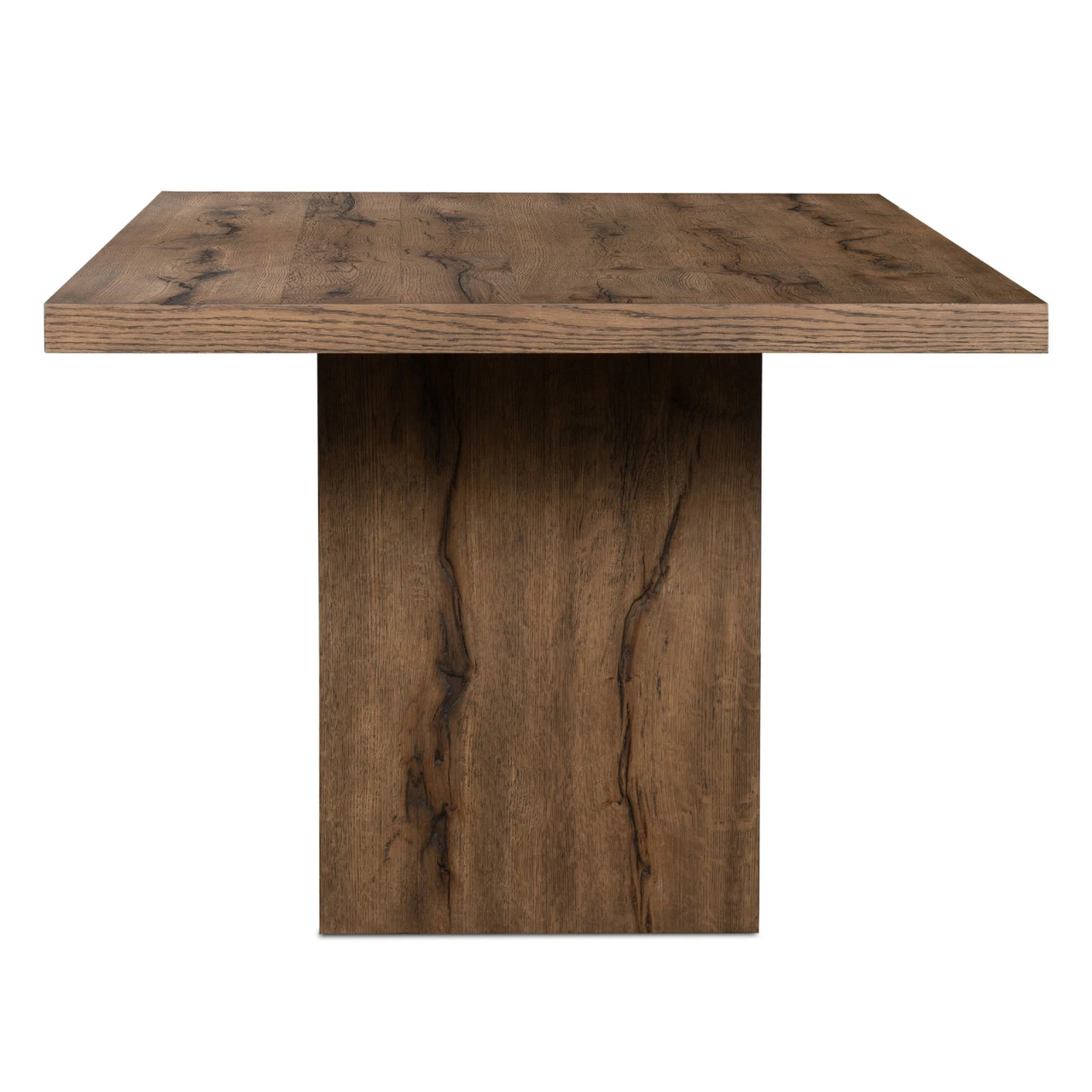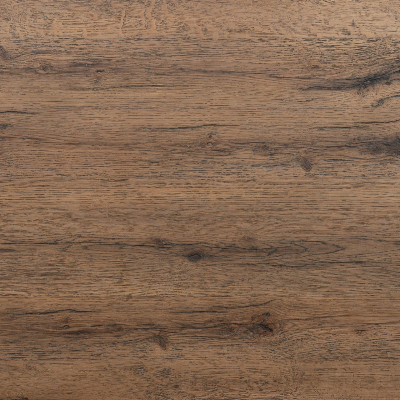 Finished in a rich, rustic brown, a double alter-style dining table of thick, hand-selected oak veneer features visible knots and graining, bringing a beautifully salvaged look to everyday dining.