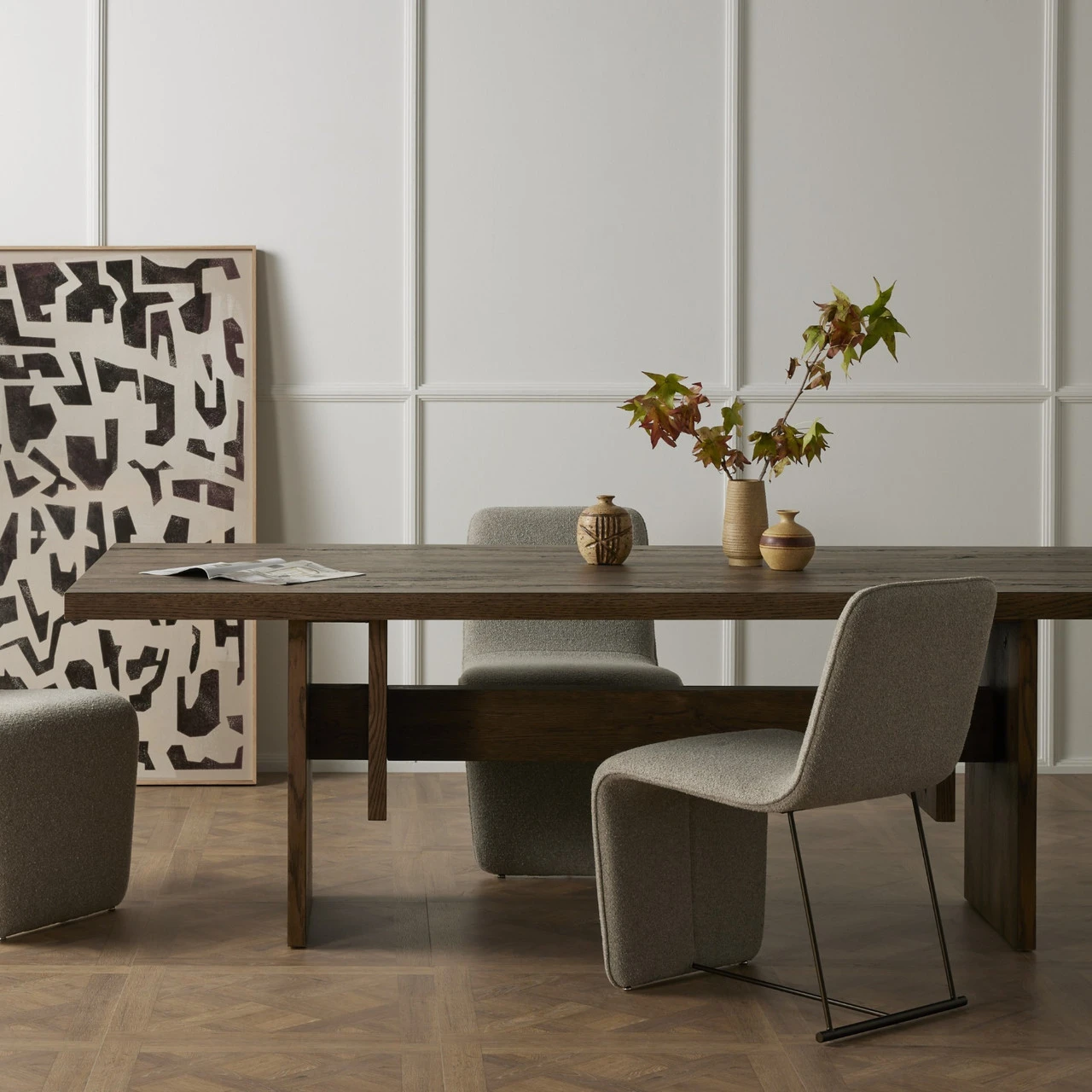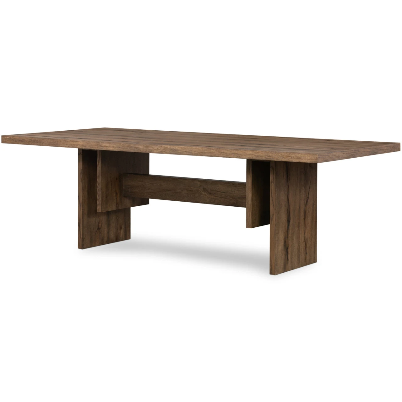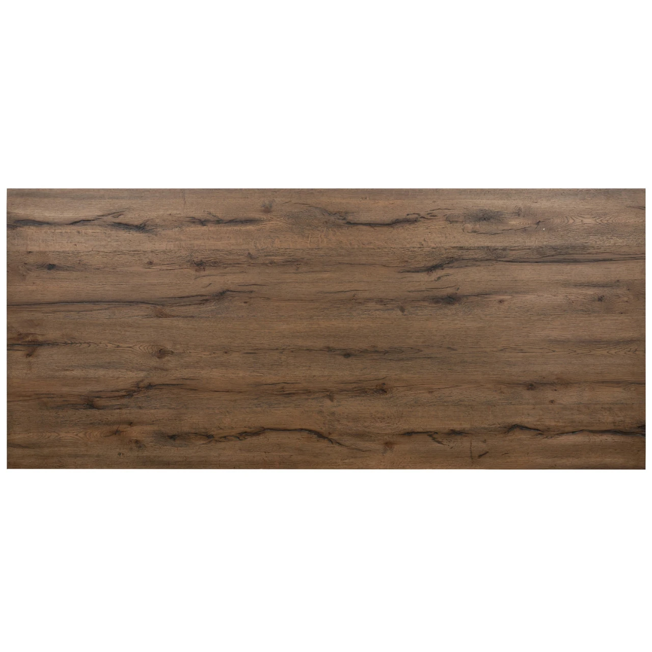 Finished in a rich, rustic brown, a double alter-style dining table of thick, hand-selected oak veneer features visible knots and graining, bringing a beautifully salvaged look to everyday dining.
