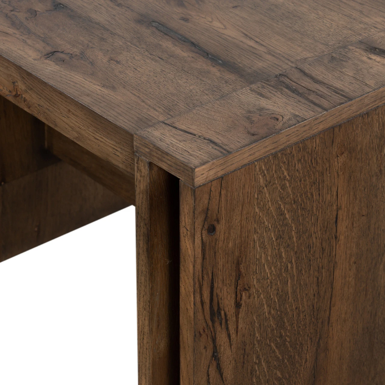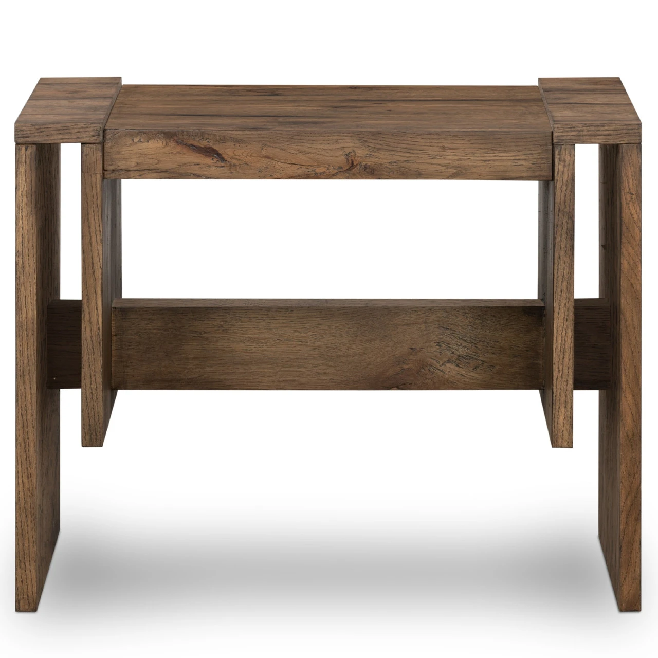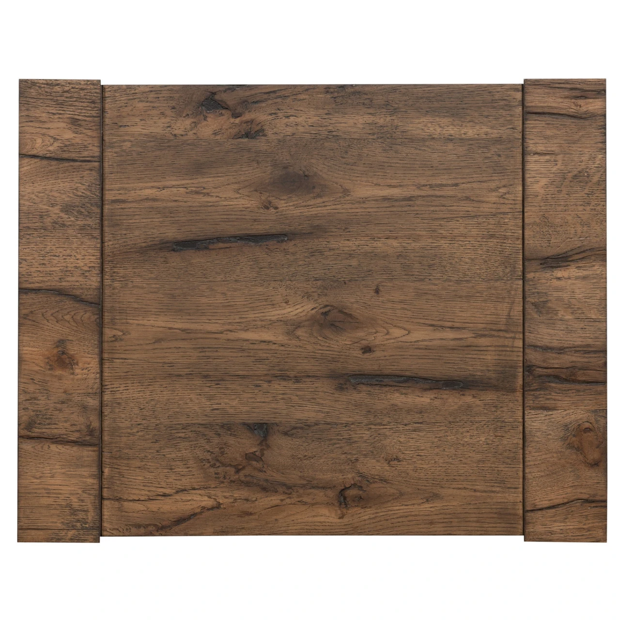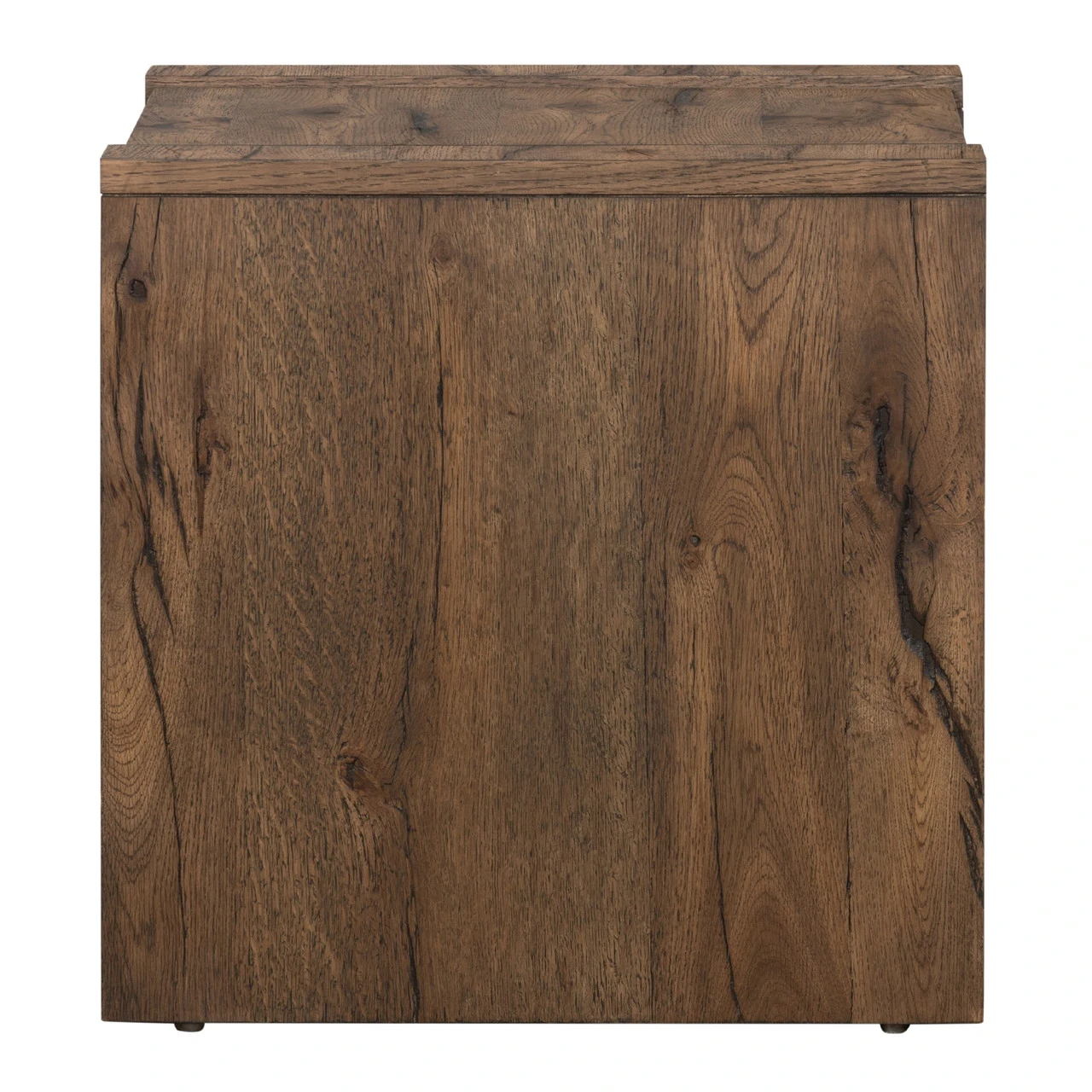 Finished in a rich, rustic brown, a double alter-style end table of thick, hand-selected oak veneer features visible knots and graining for a beautifully salvaged look.