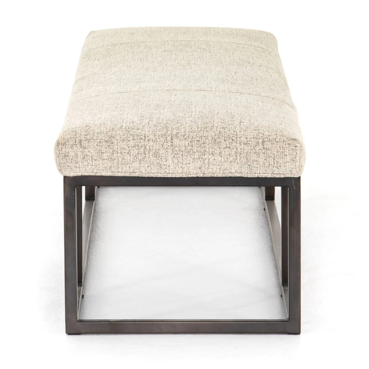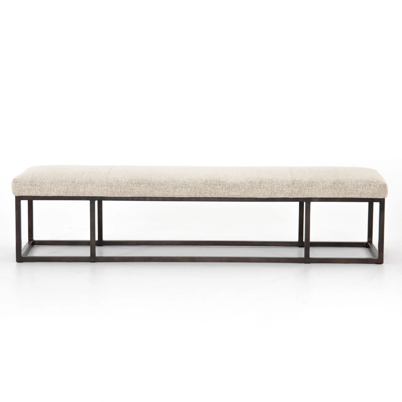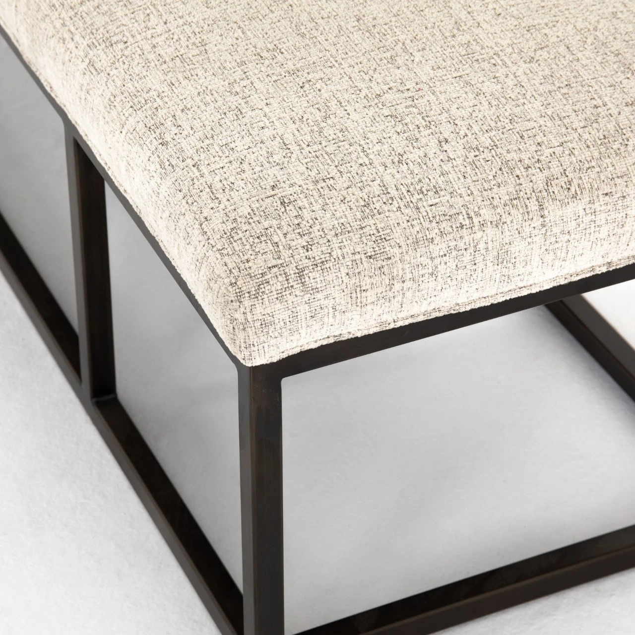 Streamlined shaping, textural to the touch. Gunmetal-finished iron framing stands slim and structured to support a well-tailored top of plush, linen-like upholstery. Open, adaptable styling allows for versatile placement options.