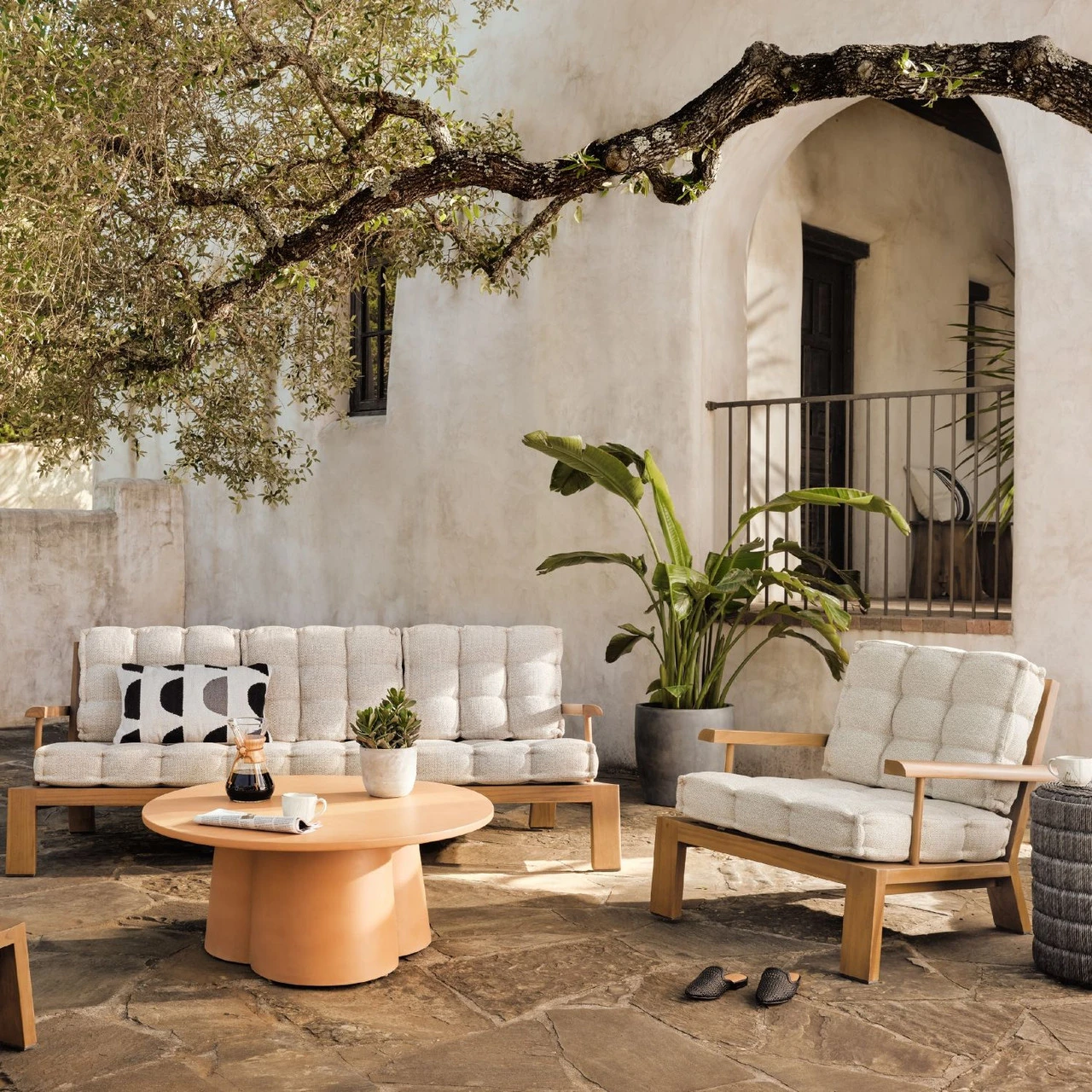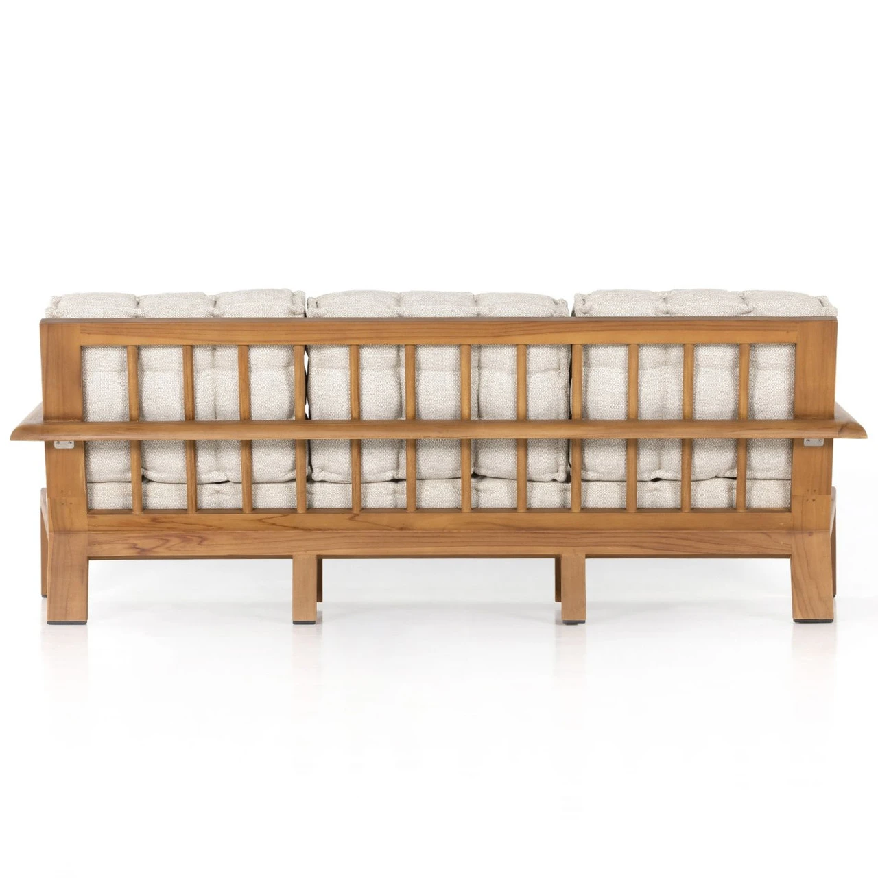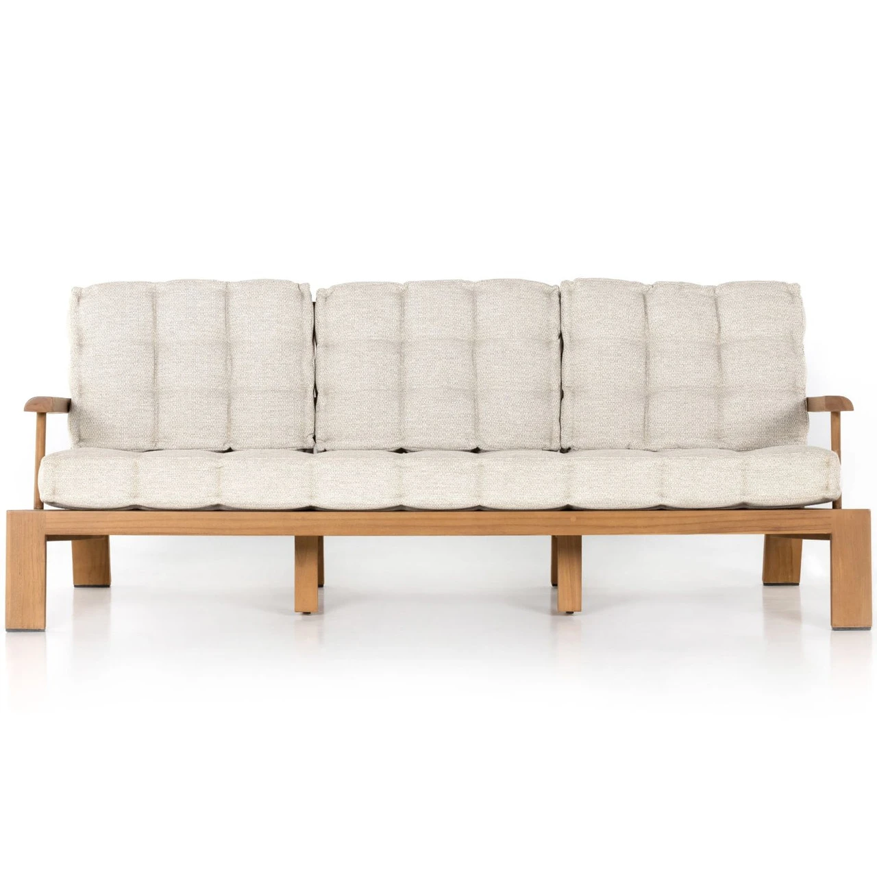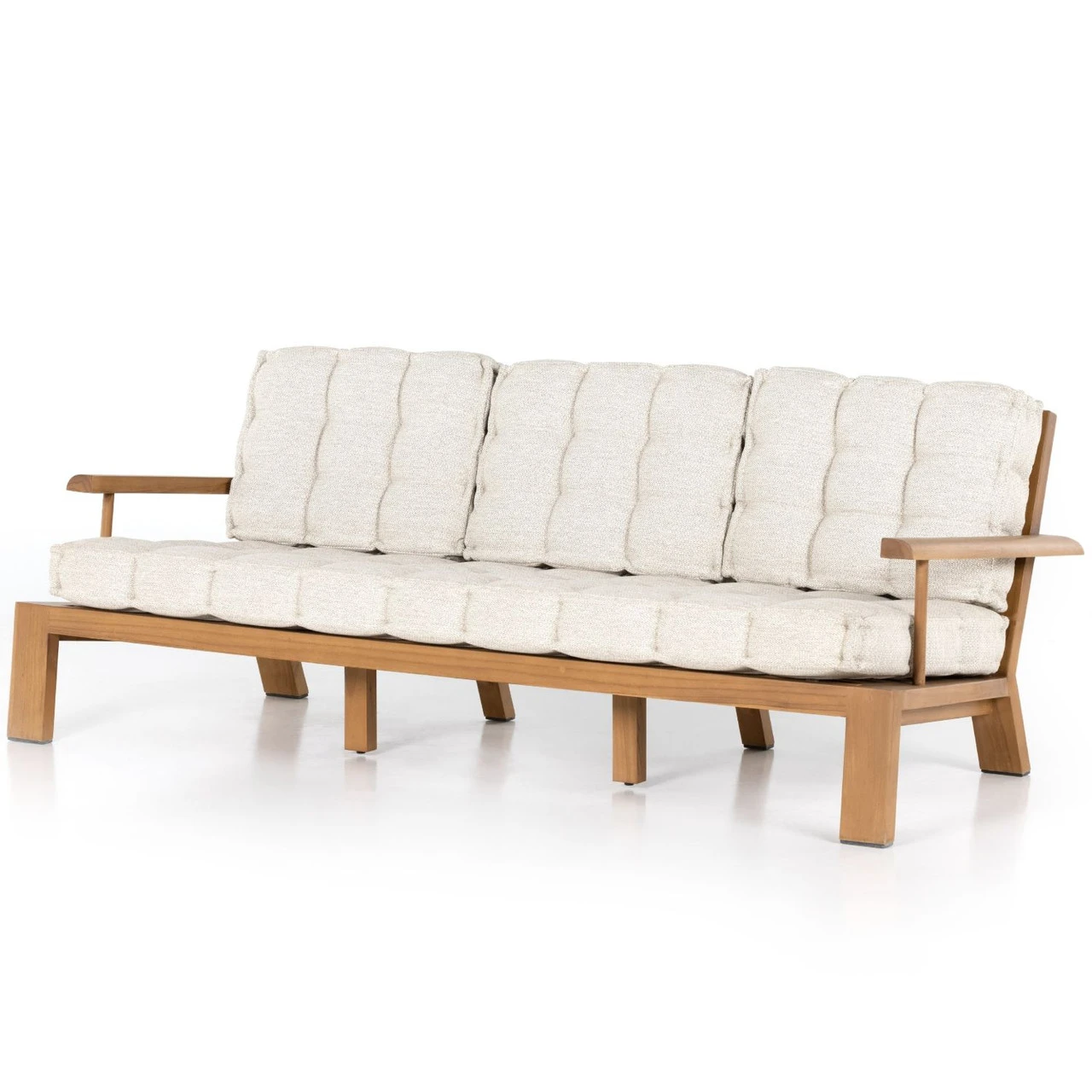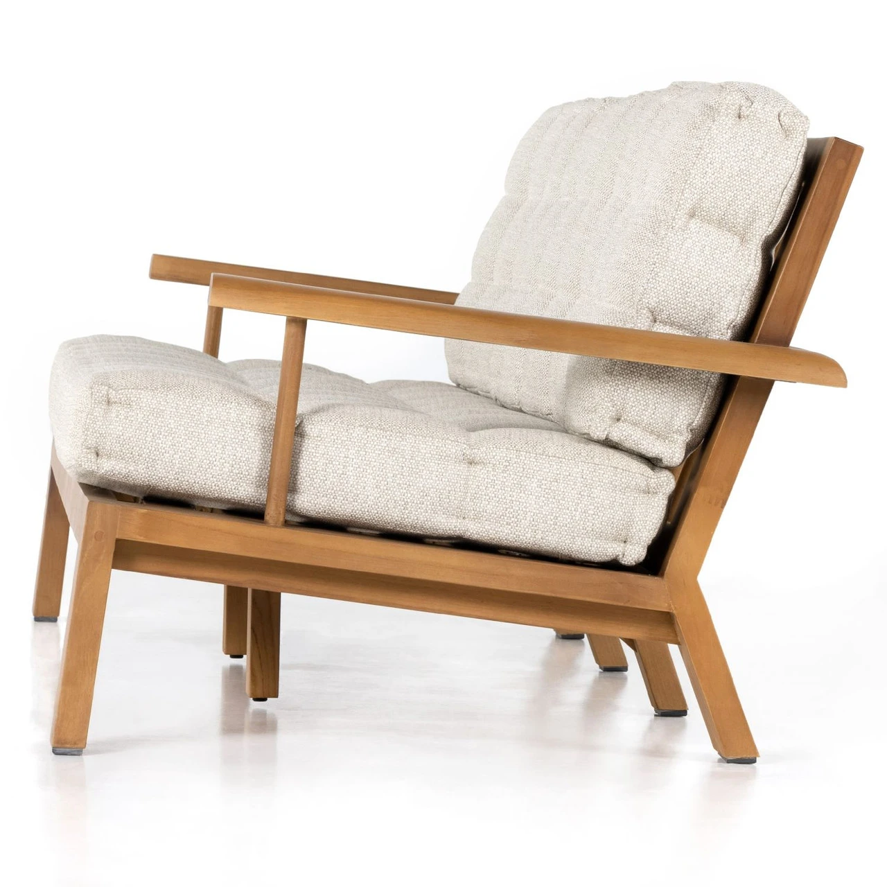 Cushy comfort, made for the outdoors. Wide framing of FSC-certified teak features paddle legs and a slatted back, with dramatically tufted sand-colored cushioning for a relaxed sit. Cover or store indoors during inclement weather and when not in use.