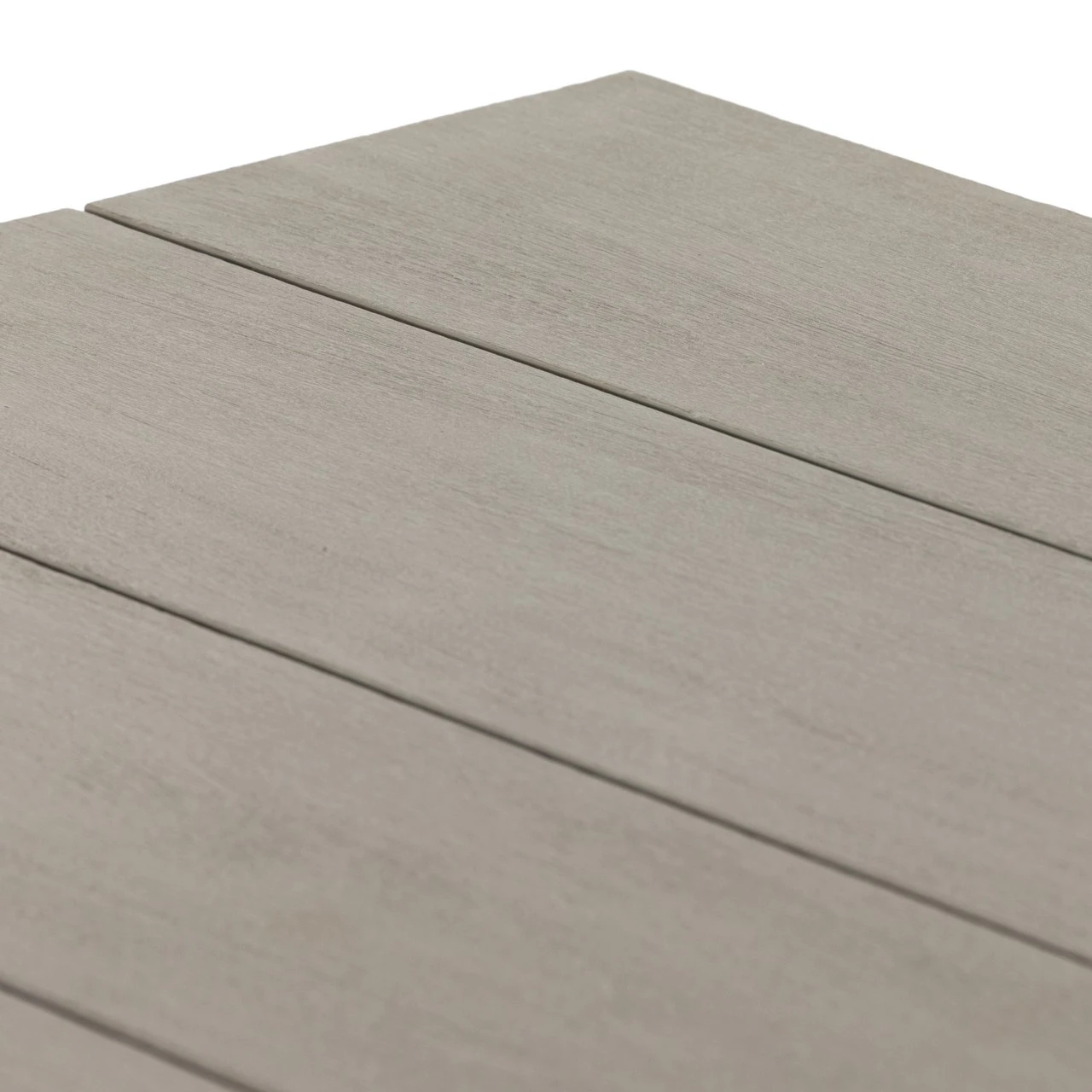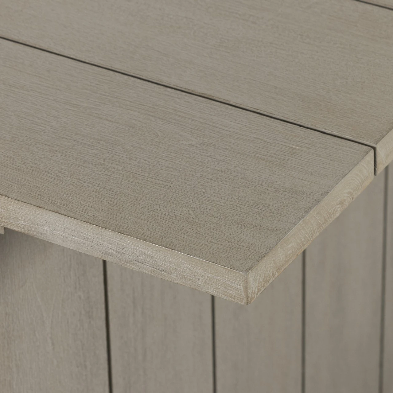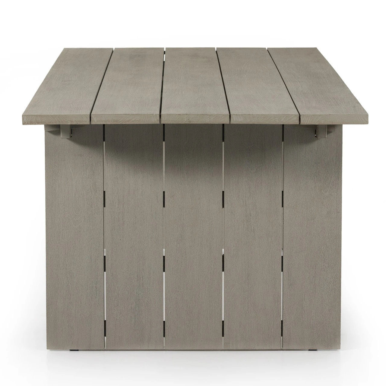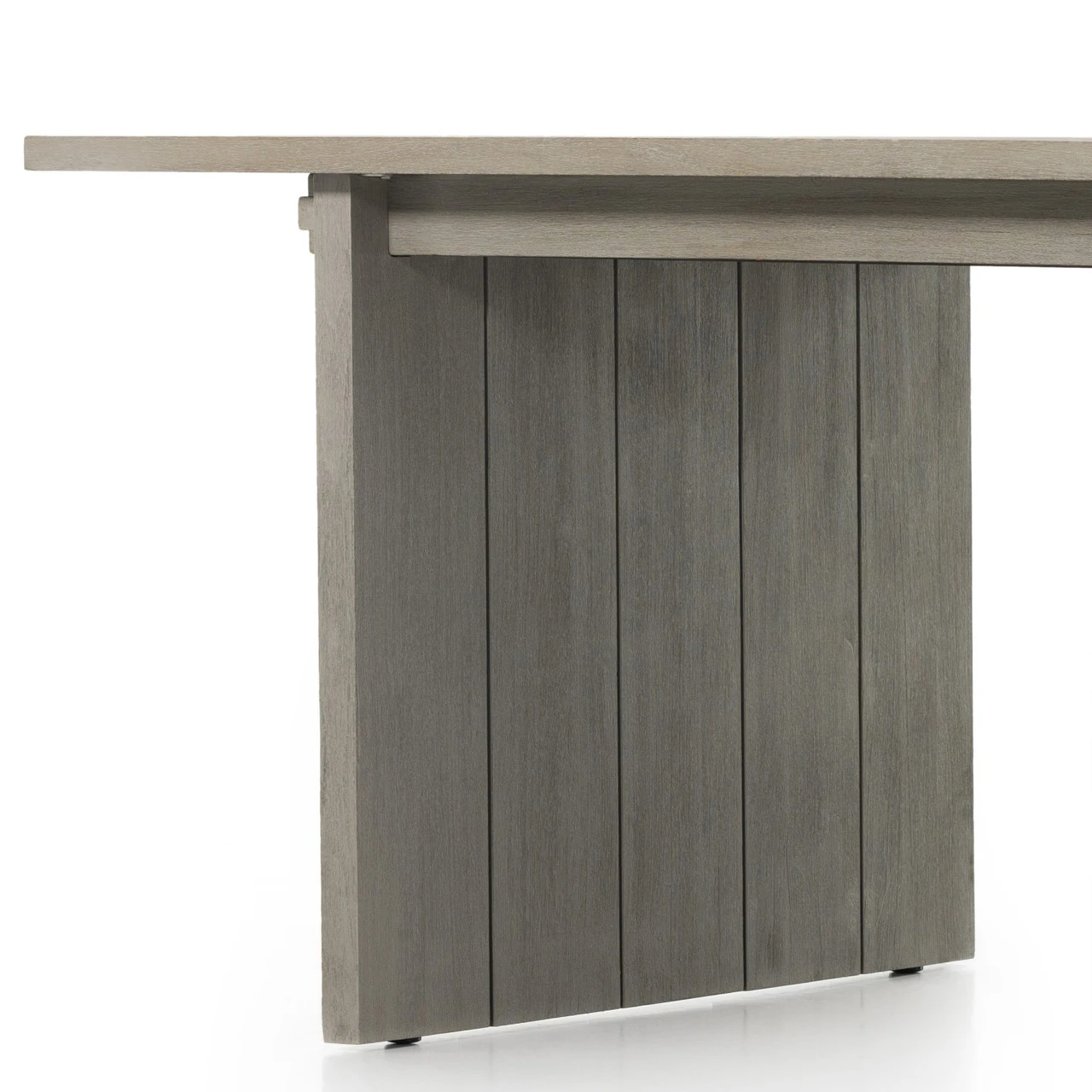 A sleek and large-scale setting for entertaining al fresco. Crafted of wide planks of solid teak with mortise and tenon joinery and detailing for a benchmade look and feel. Cover or store indoors during inclement weather and when not in use. Seats 10 comfortably.
