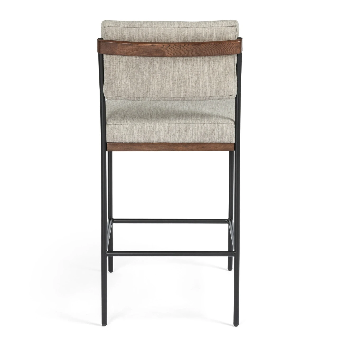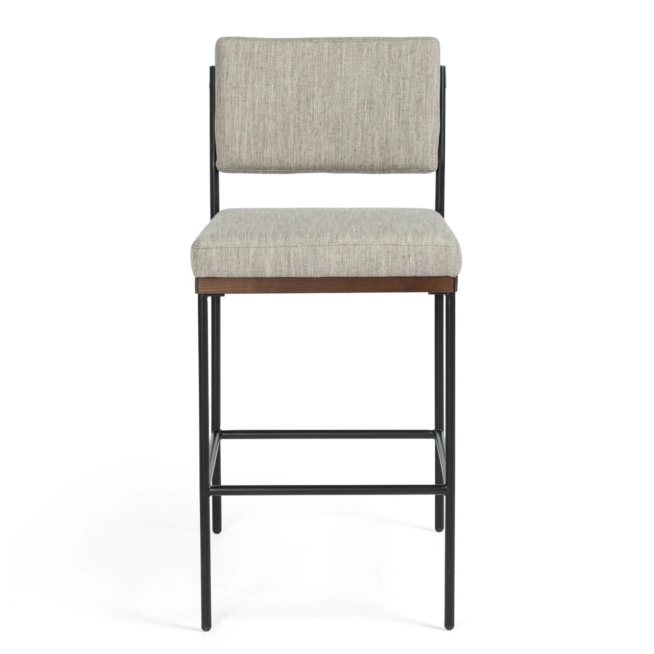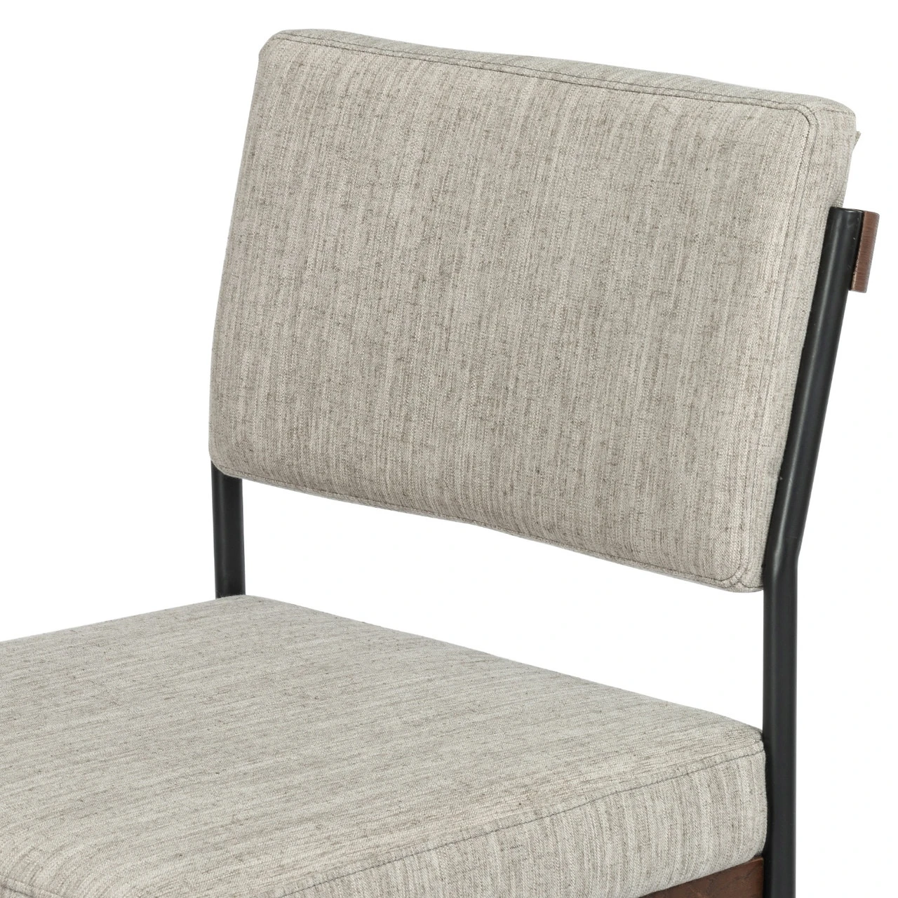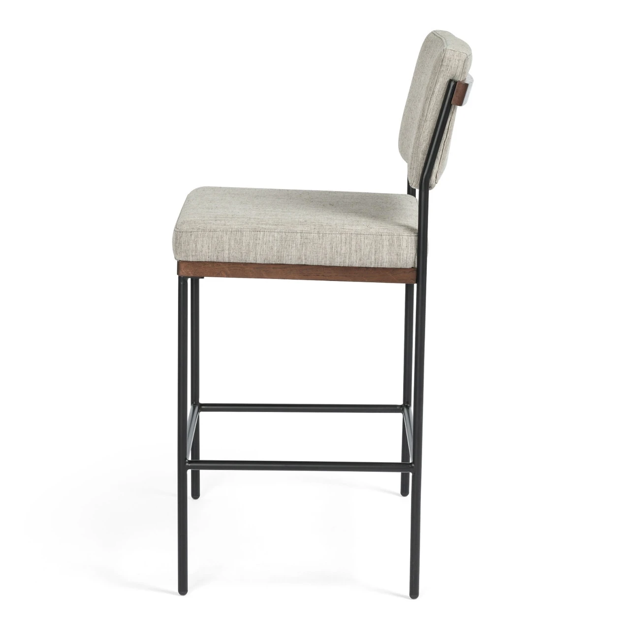 Simple and streamlined with fresh, thoughtful details. Slim, black-finished round stock iron suspends an almond-finished nettlewood deck, with a flannel-colored linen-blend seat and floating back with a rear wooden stretcher.