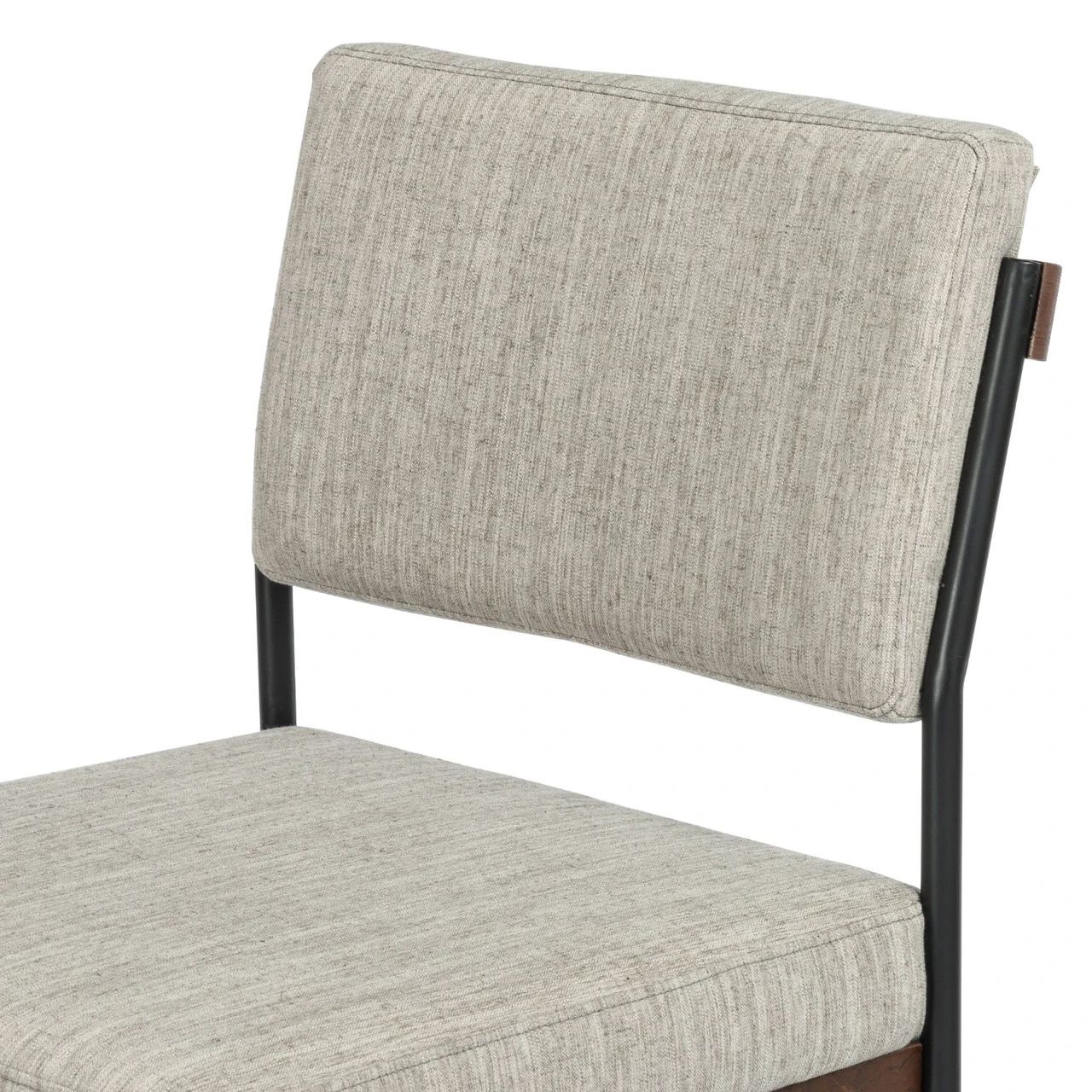 Simple and streamlined with fresh, thoughtful details. Slim, black-finished round stock iron suspends an almond-finished nettlewood deck, with a flannel-colored linen-blend seat and floating back with a rear wooden stretcher.