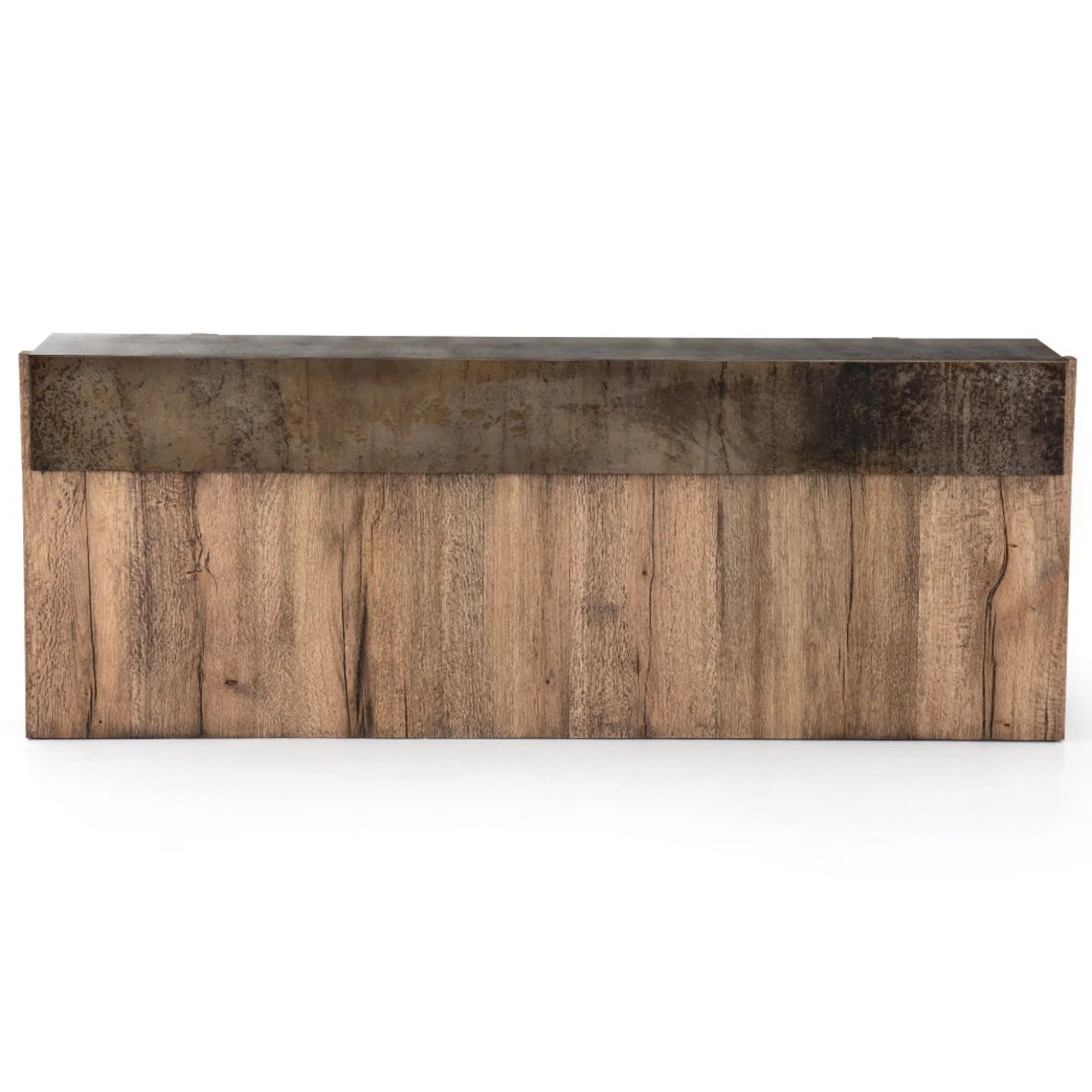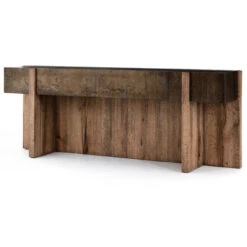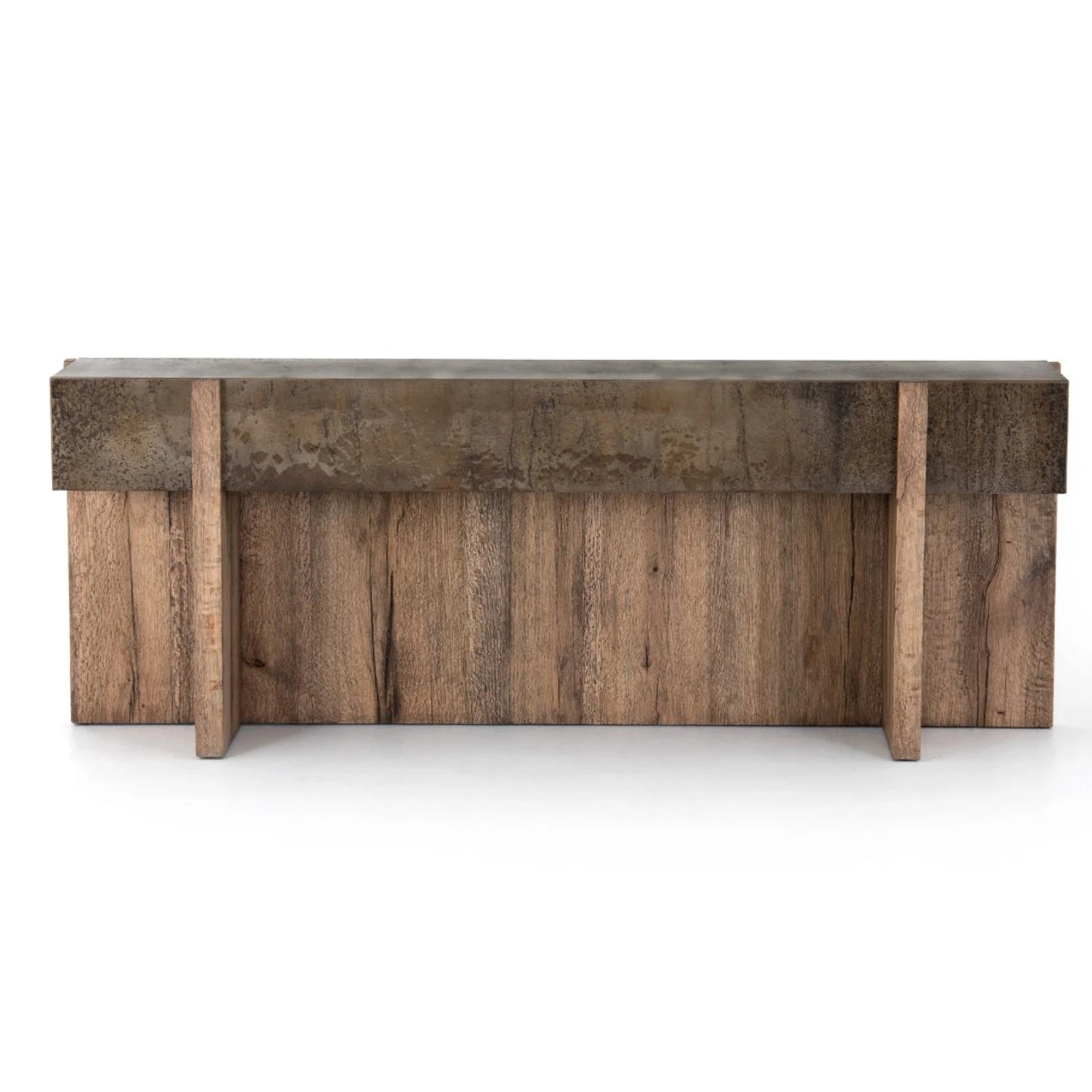 An organic-spirited statement piece. With thick, wide proportions, a rectangular console table of distressed iron tops an intersecting base of rustic, character-rich oak with beautiful highs and lows.