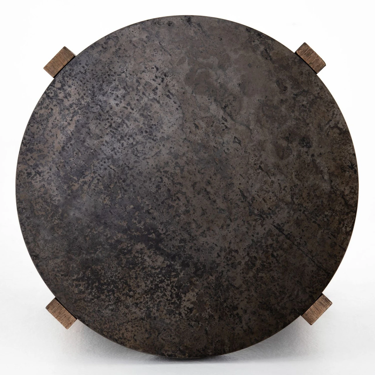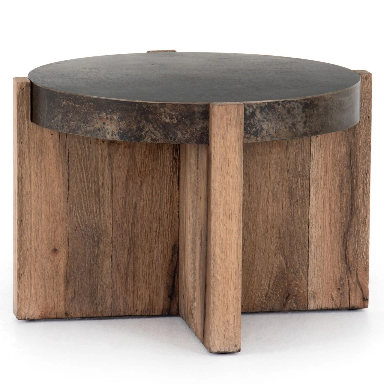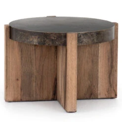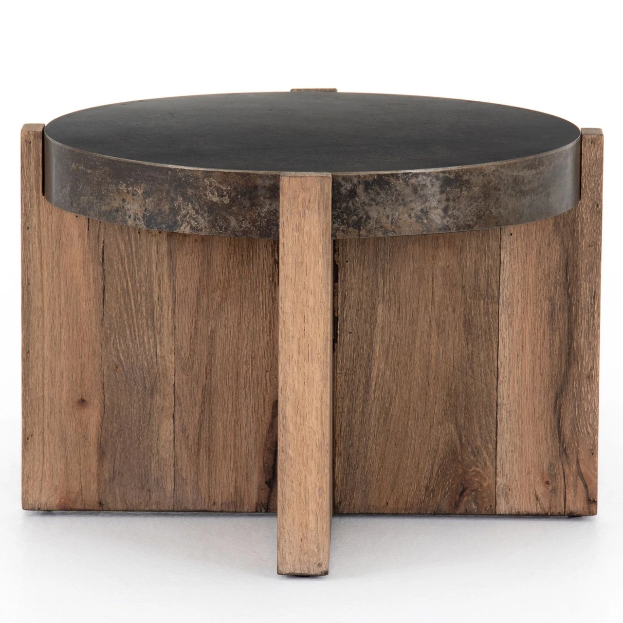 An organic-spirited statement piece. A round tabletop of distressed iron rests within a sculptural cradle base of rustic, character-rich oak with beautiful highs and lows.