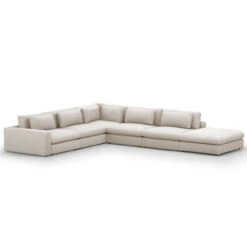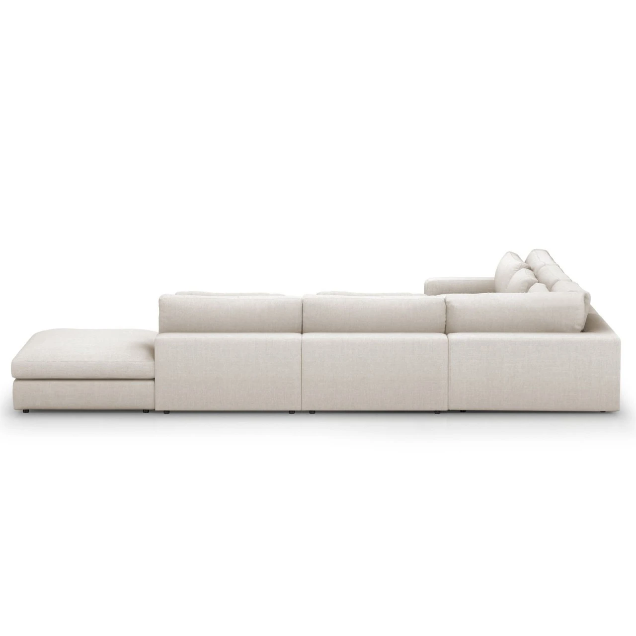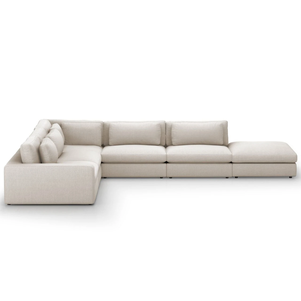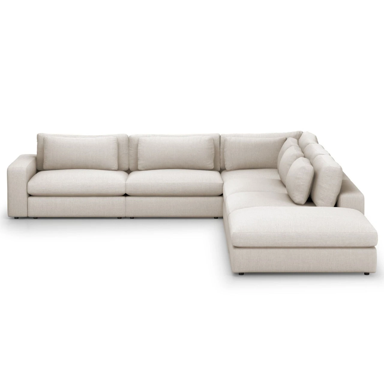 Deep, low seating says relax. An inviting sectional is covered in a soft, durable woven fabric. Modular components allow the perfect combination for any space.