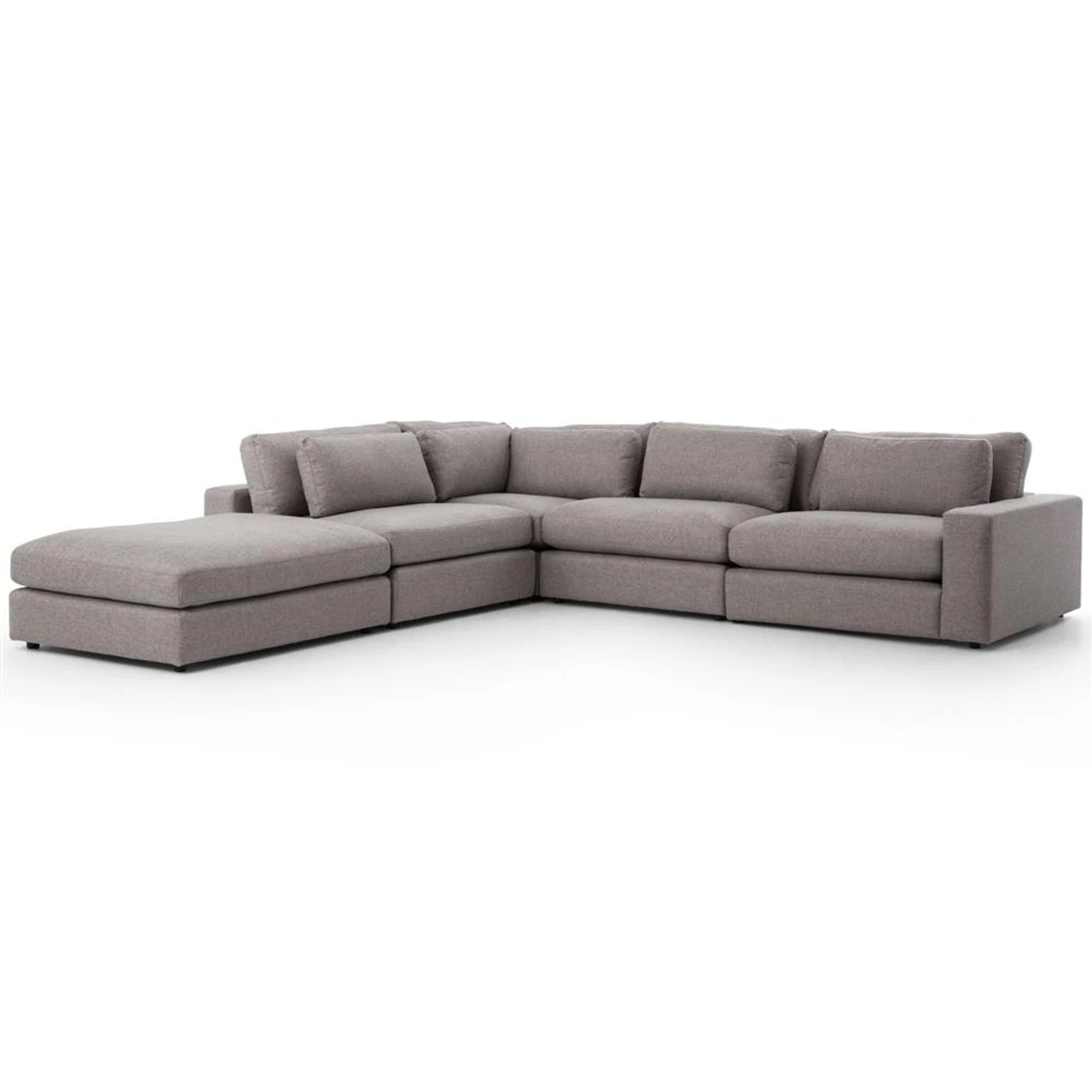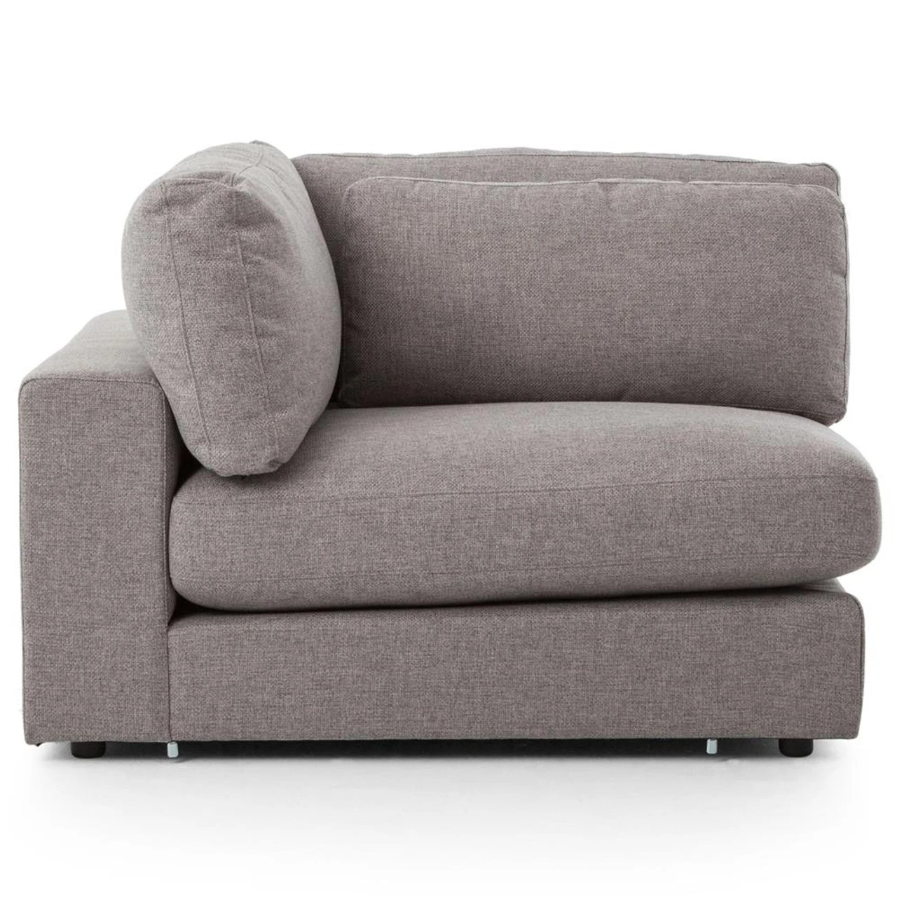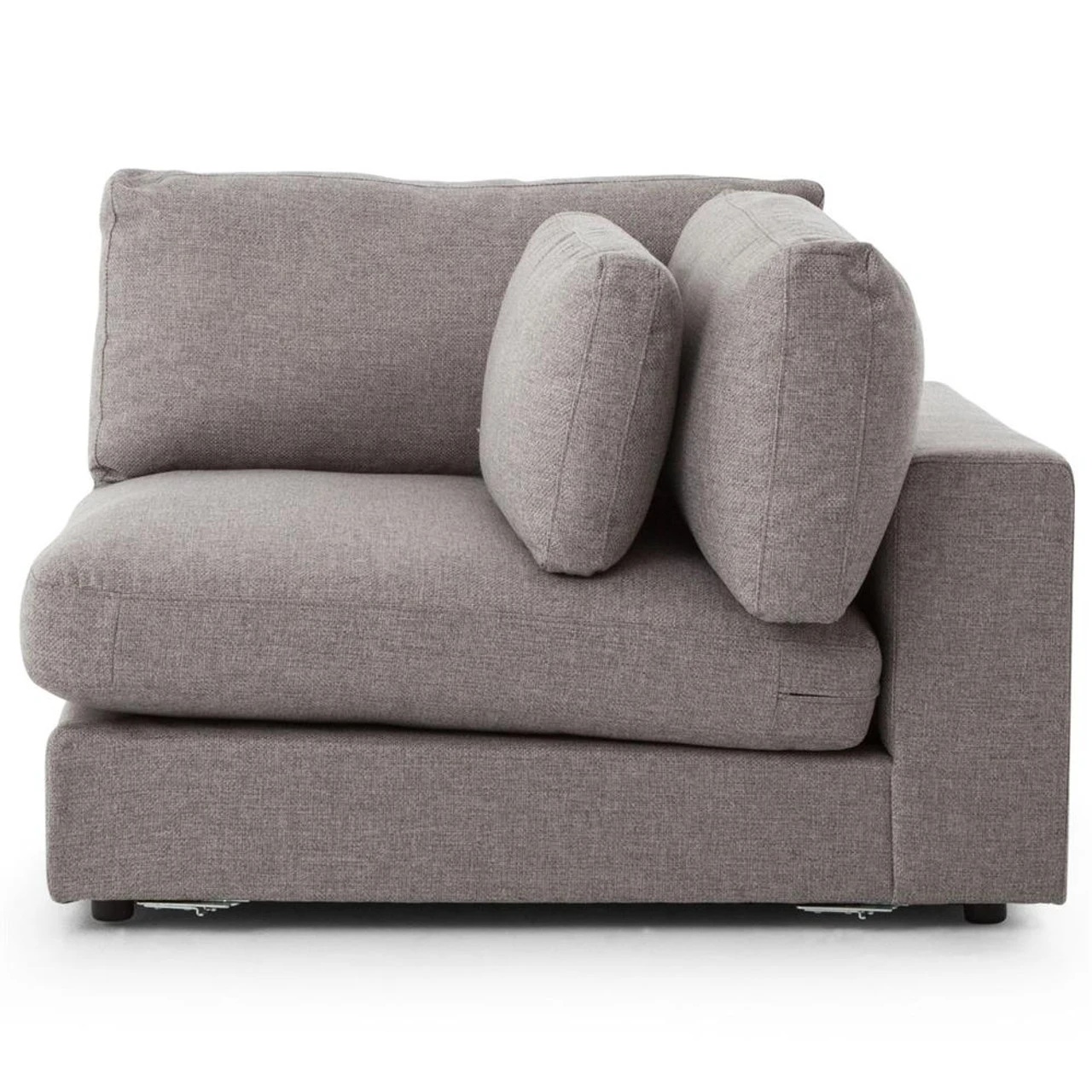 Home is where the comfort is. Introducing sectionals scaled for smaller spaces, modular pieces that allow customization that make living with furnishings as easy as looking at them. Deep, low seating says relax. A flexible, corner chair is covered in an inviting, durable gray fabric. Modular components allow the perfect combination for any space.
