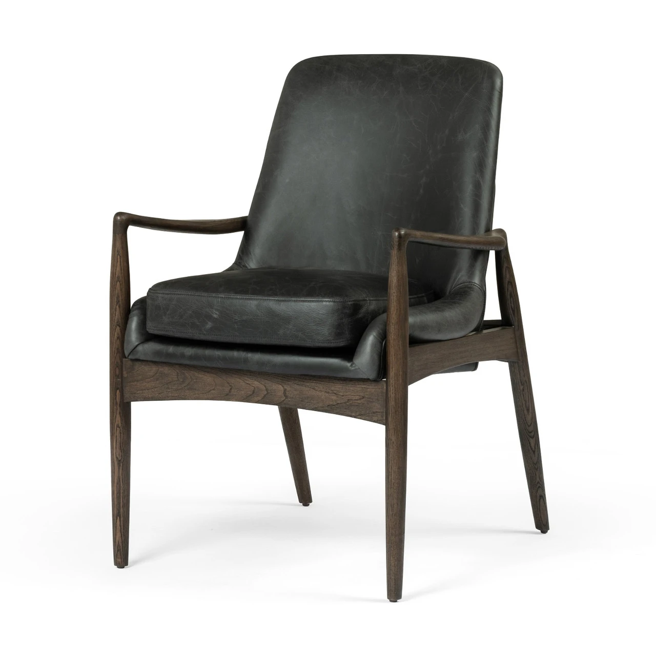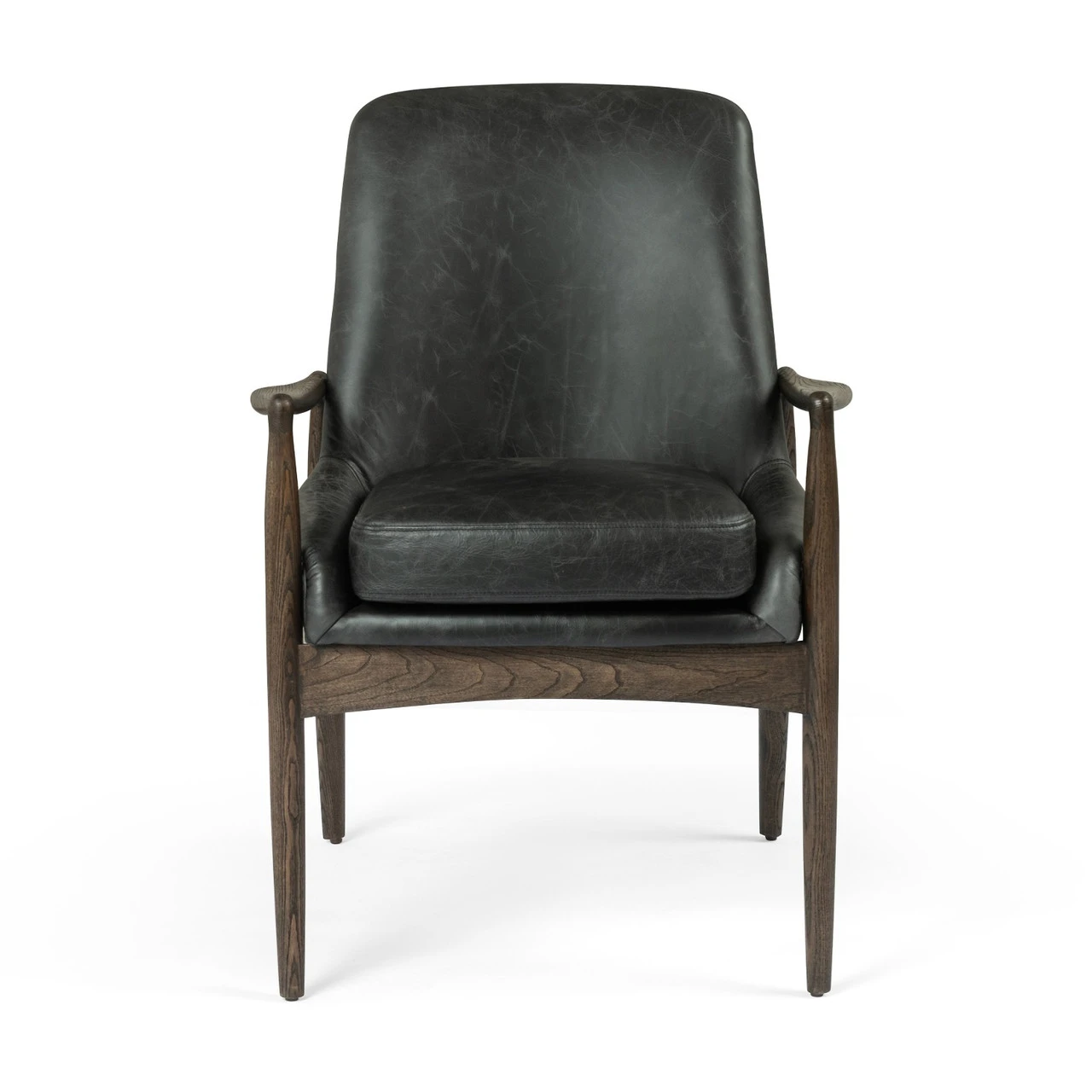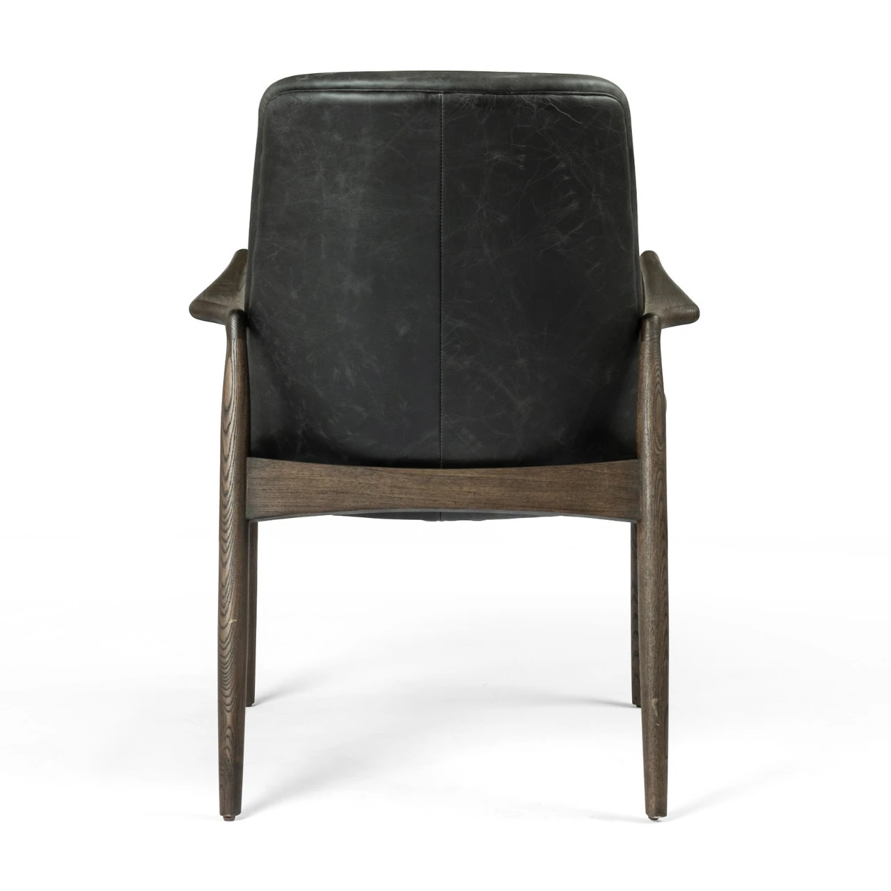 Mid-century modern sophistication. Arrestingly detailed nettlewood frame adds an architectural feel to a precisely shaped arm chair upholstered in smoky-black top-grain leather.