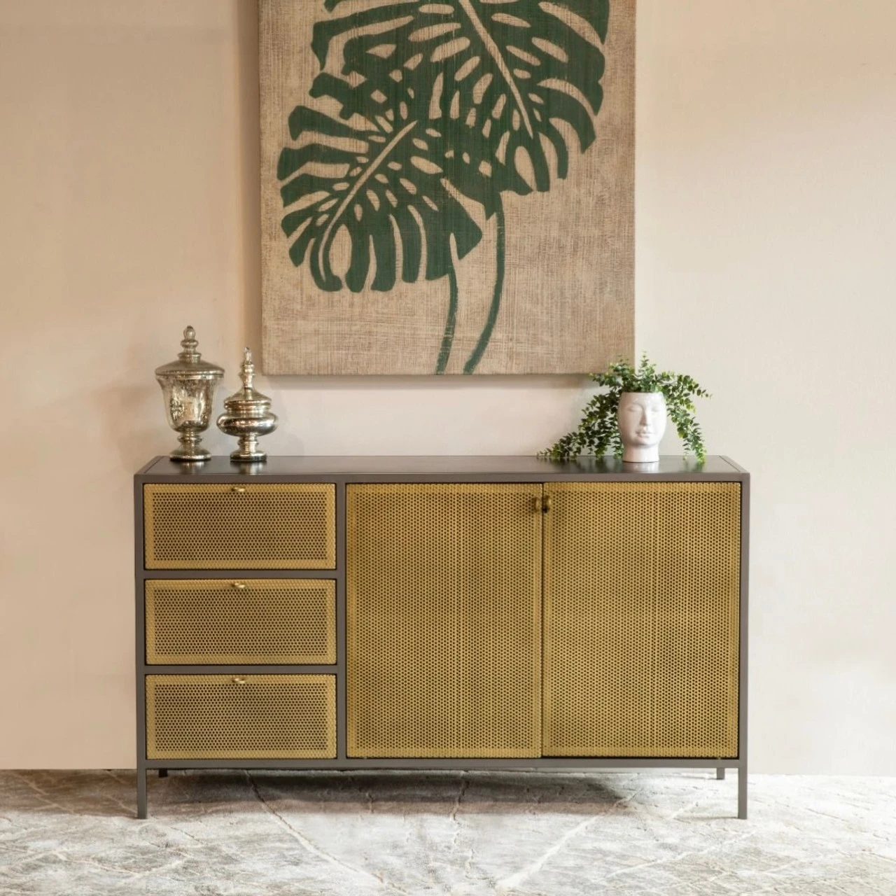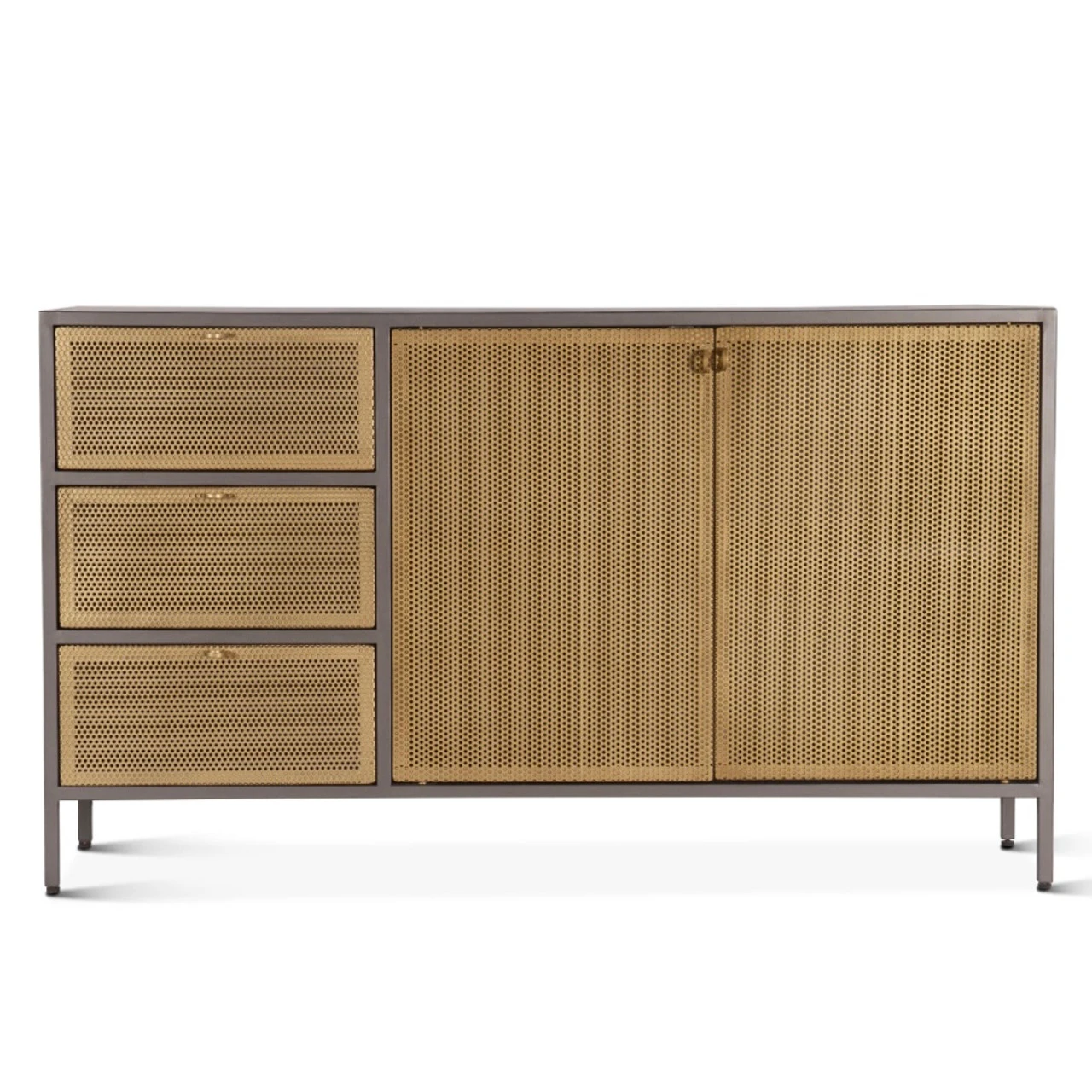 Get ready to embrace industrial chic vibes with the Brooklyn collection. Constructed from sturdy iron and finished in a sleek gunmetal and brass combination, this collection exudes style and durability. The perforated brass cabinetry adds a touch of elegance and sophistication, while the sturdy construction ensures long-lasting use. Perfect for any modern home, the Brooklyn collection is a must-have for those looking to add a touch of industrial flair to their living space.