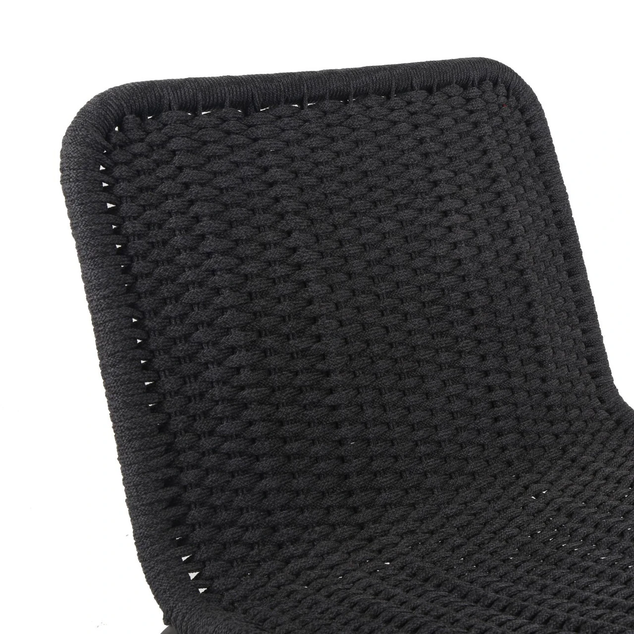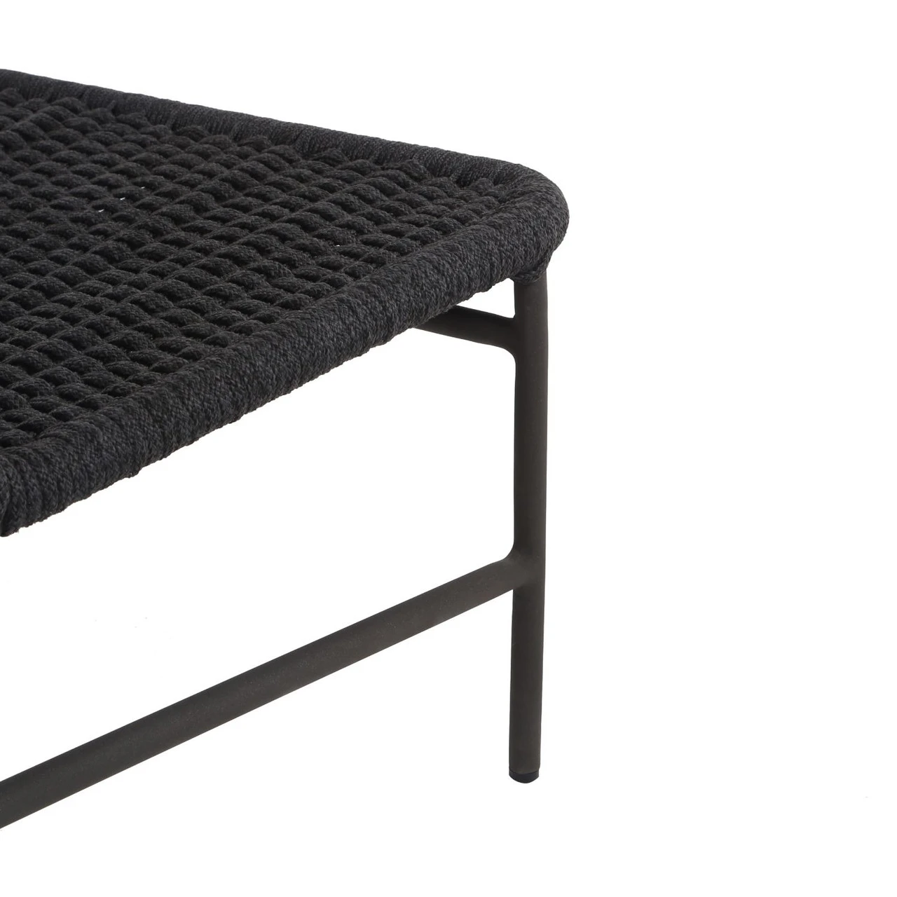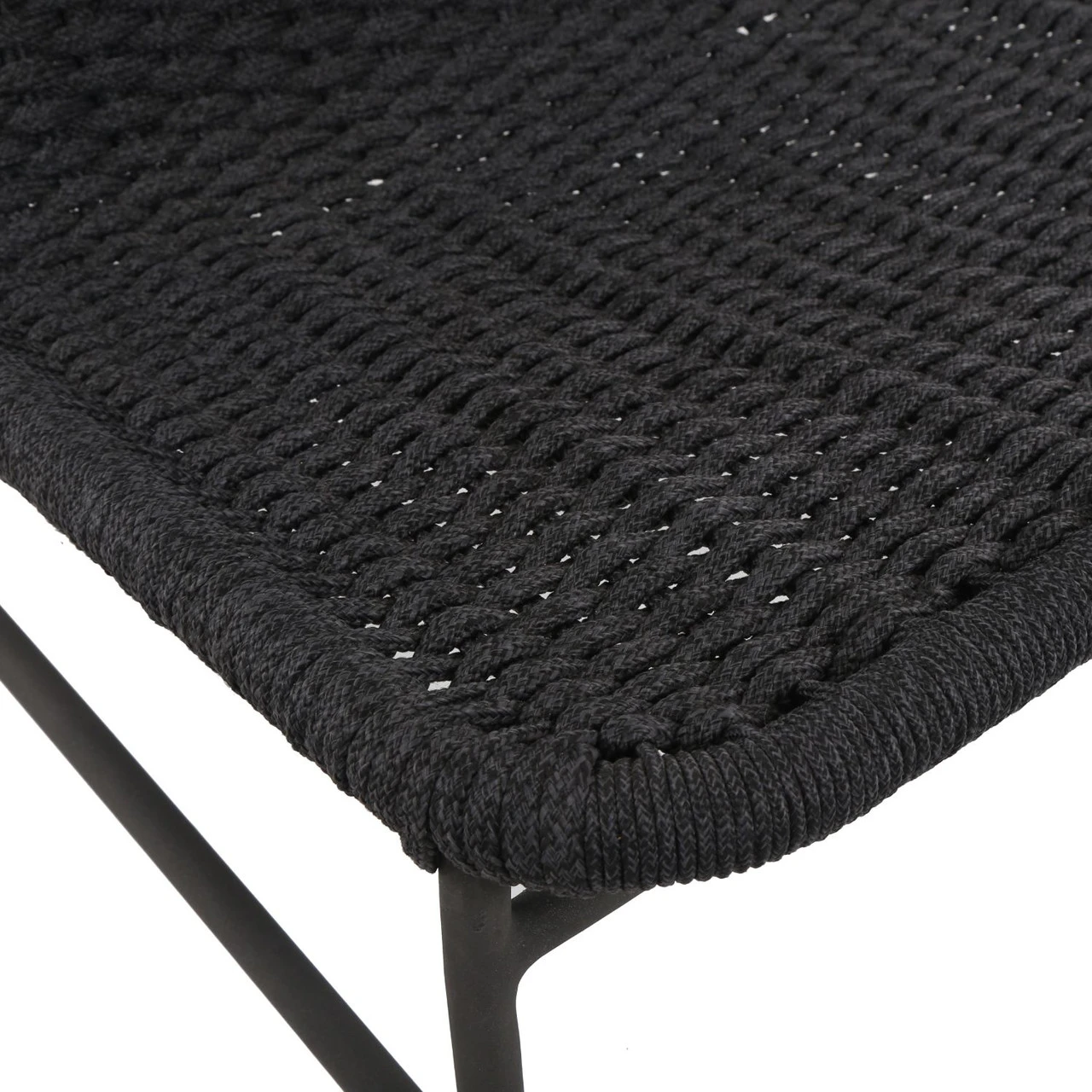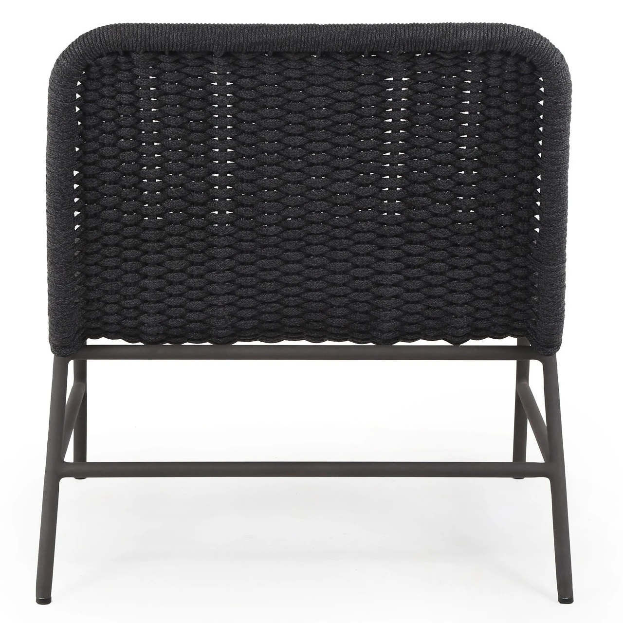 A simple, textural take on outdoor-friendly seating. Black-finished aluminum armless framing welcomes dark grey rope, for a sleek look with underlying depth. Cover or store indoors during inclement weather and when not in use.