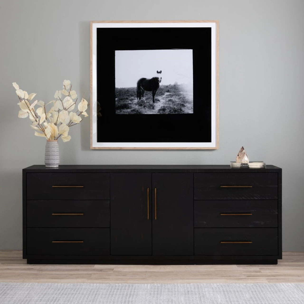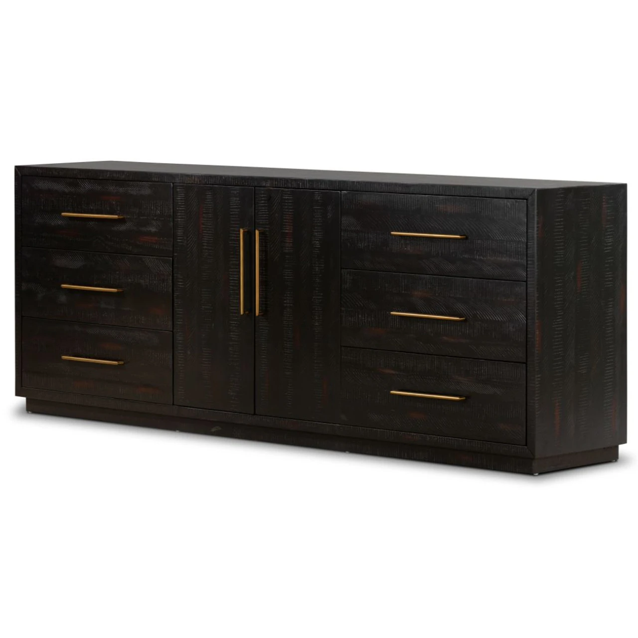A beautiful balance of rustic and contemporary design, our Burnished Black Rustic Large Media cabinet with Doors compliments any living room décor. Inspired by mid-century shaping, angular lines are offset by distressed finishes and a burnished, rubbed-black finish. Hand finishing created rich visual interest along with matted black or gunmetal iron and antiqued brass accents. Crafted of Acacia wood with two doors and six drawers provide plenty of storage for storing cable boxes, DVDs and other electronics.