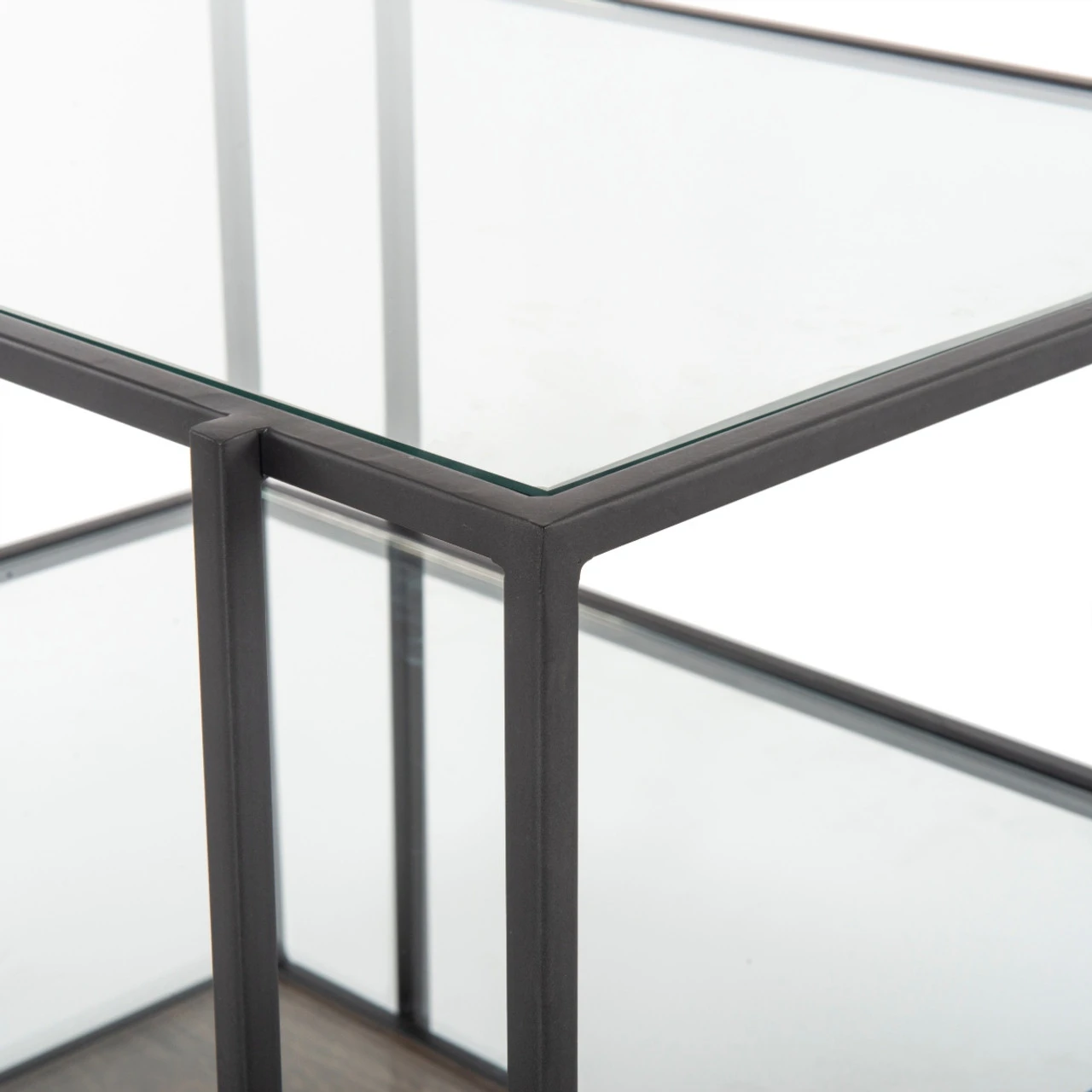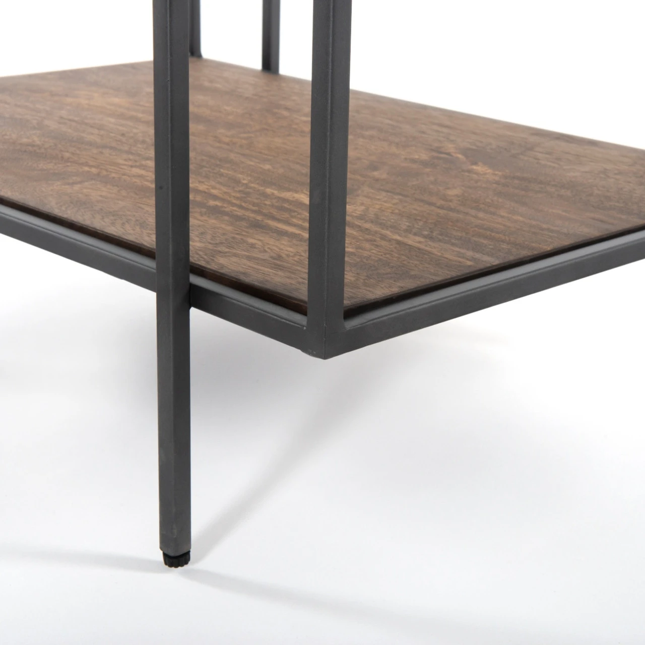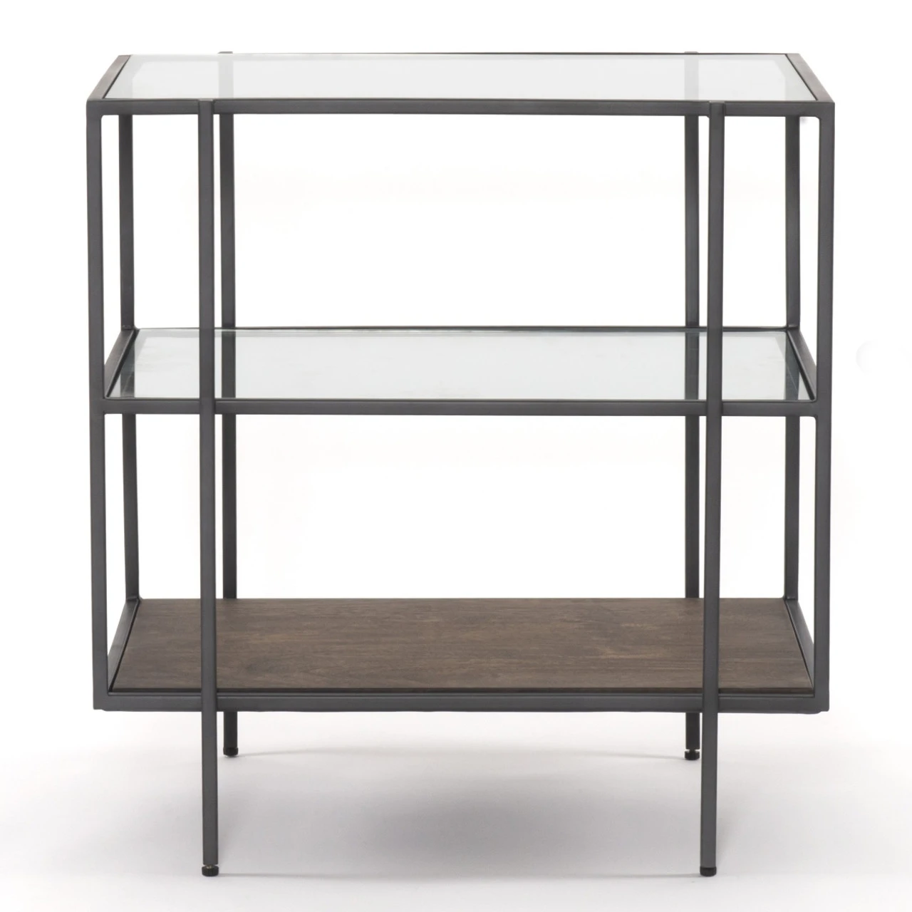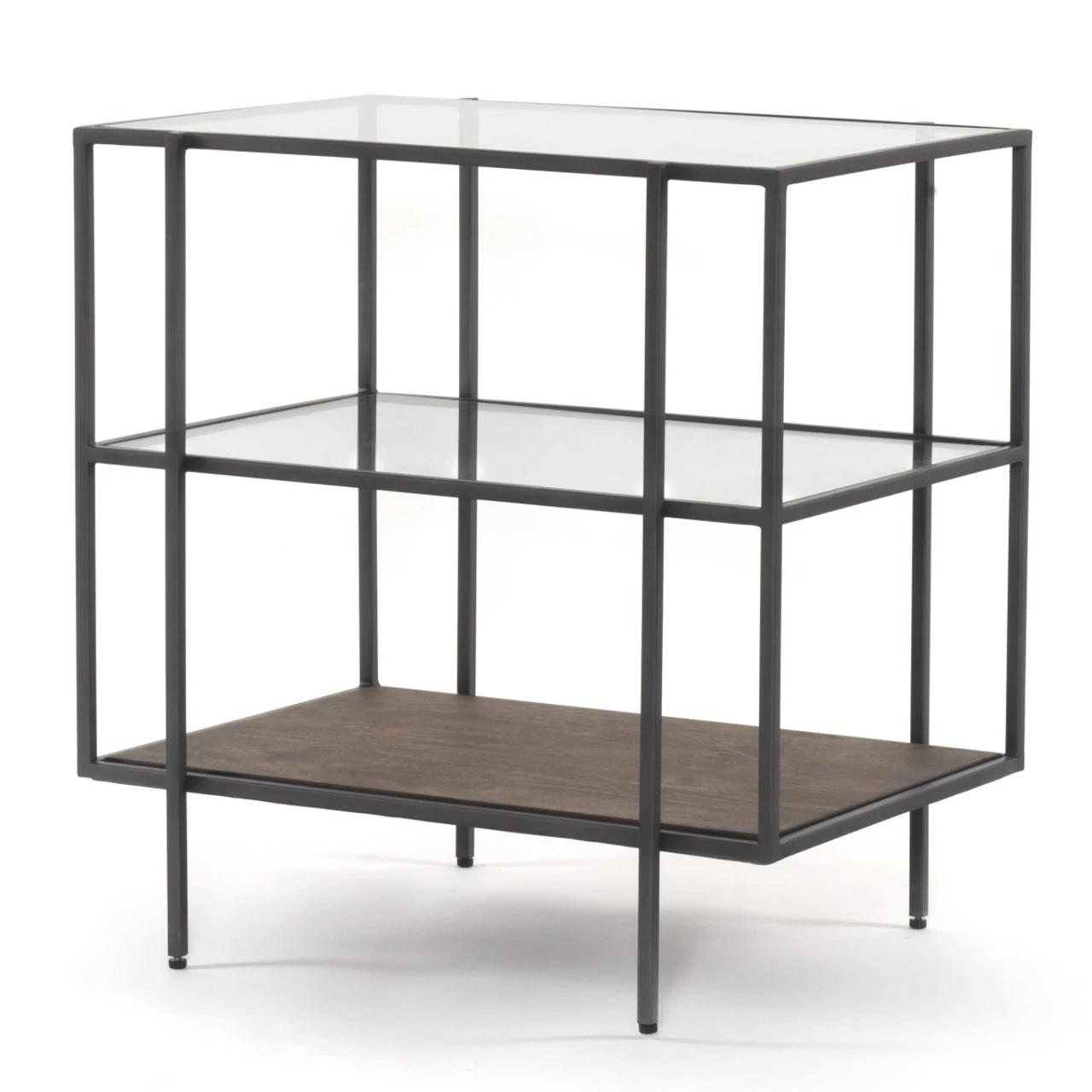 A shadowbox-style nightstand clears the way for your inner collector. Display prized possessions within a glass enclosure of gunmetal-finished iron framing and aged brown mango wood.