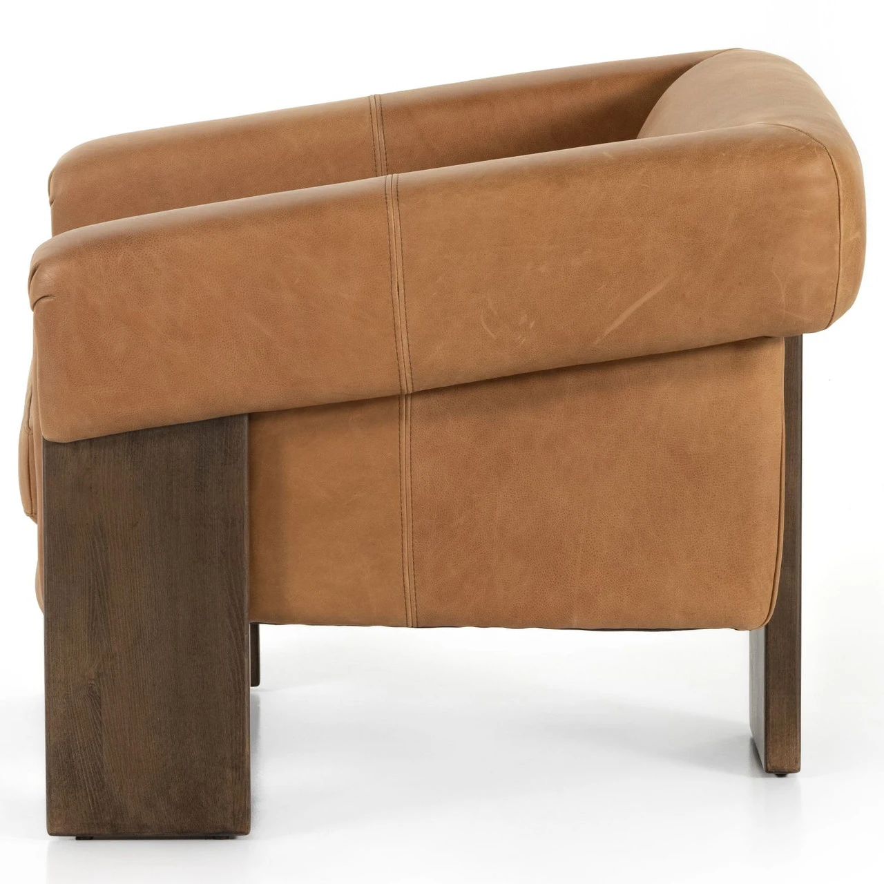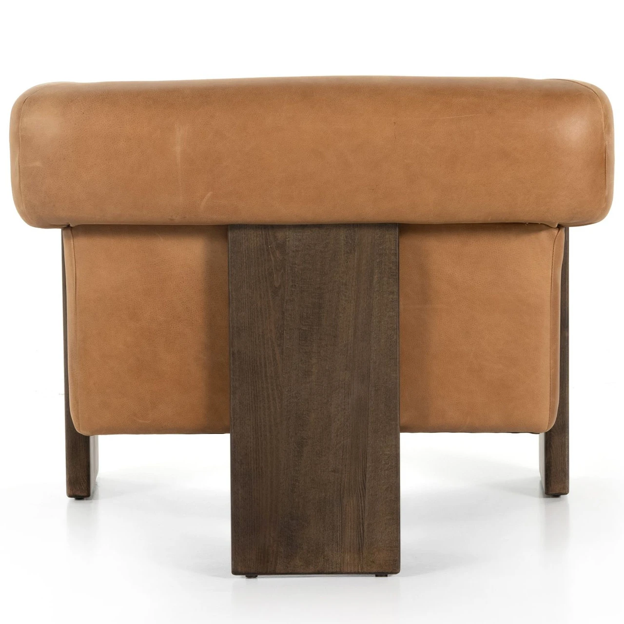A striking silhouette that commands attention from all angles. Inspired by vintage Brazilian designs, wide plank legs form an architectural tripod and frame for a floating cushioned seat. Tight upholstered back with wraparound arms and a loose, plush seat cushion.