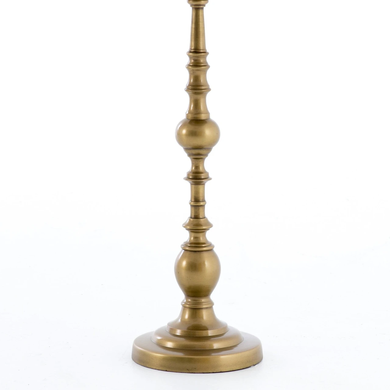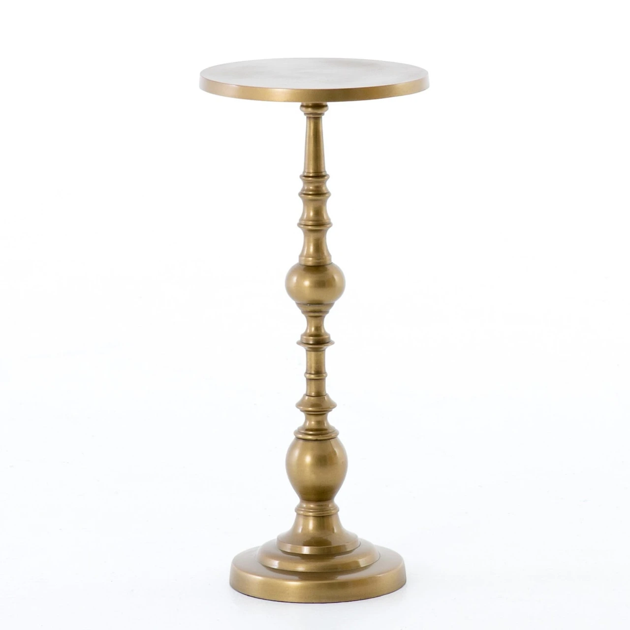 Vintage-spun sophistication adopts a fresh feel. A candlestick-style pedestal table is finished in an antique brass, offering a handy extra surface where needed. Perfect solo or in pairs.