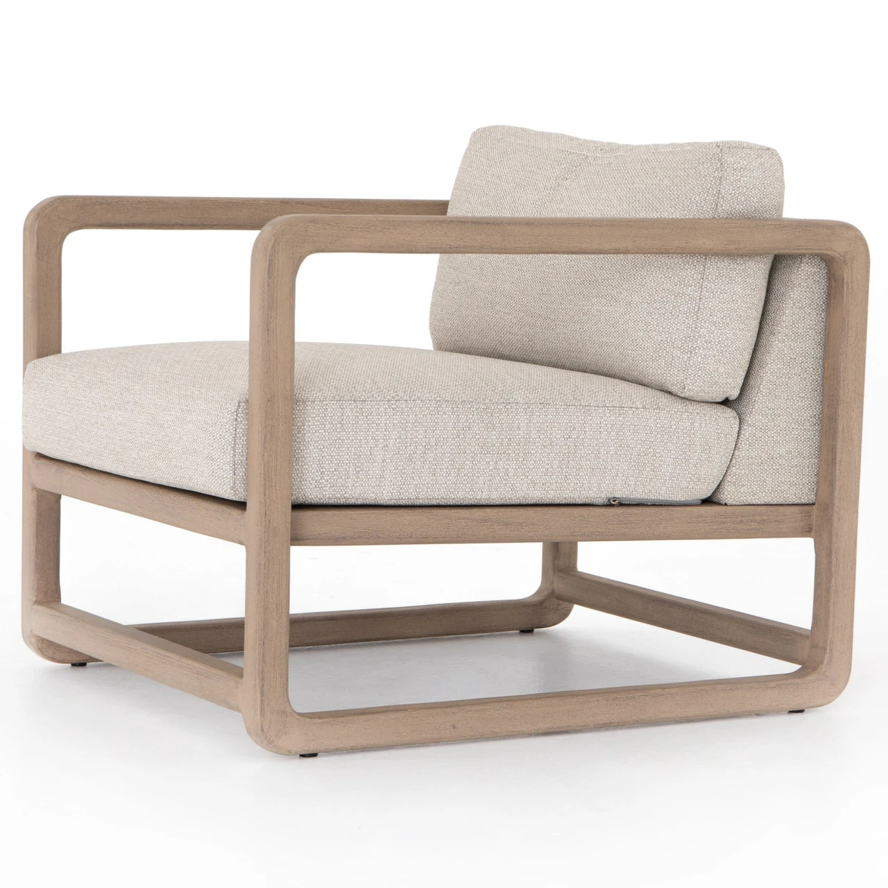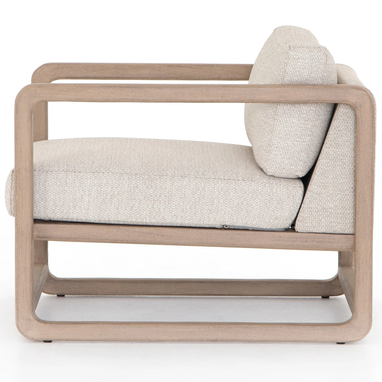 Washed brown teak forms rounded corners for a novel take on open, angular framing. Upholstered in an invitingly neutral sand, this outdoor-friendly seating style layers in with total ease. Cover or store indoors during inclement weather.